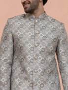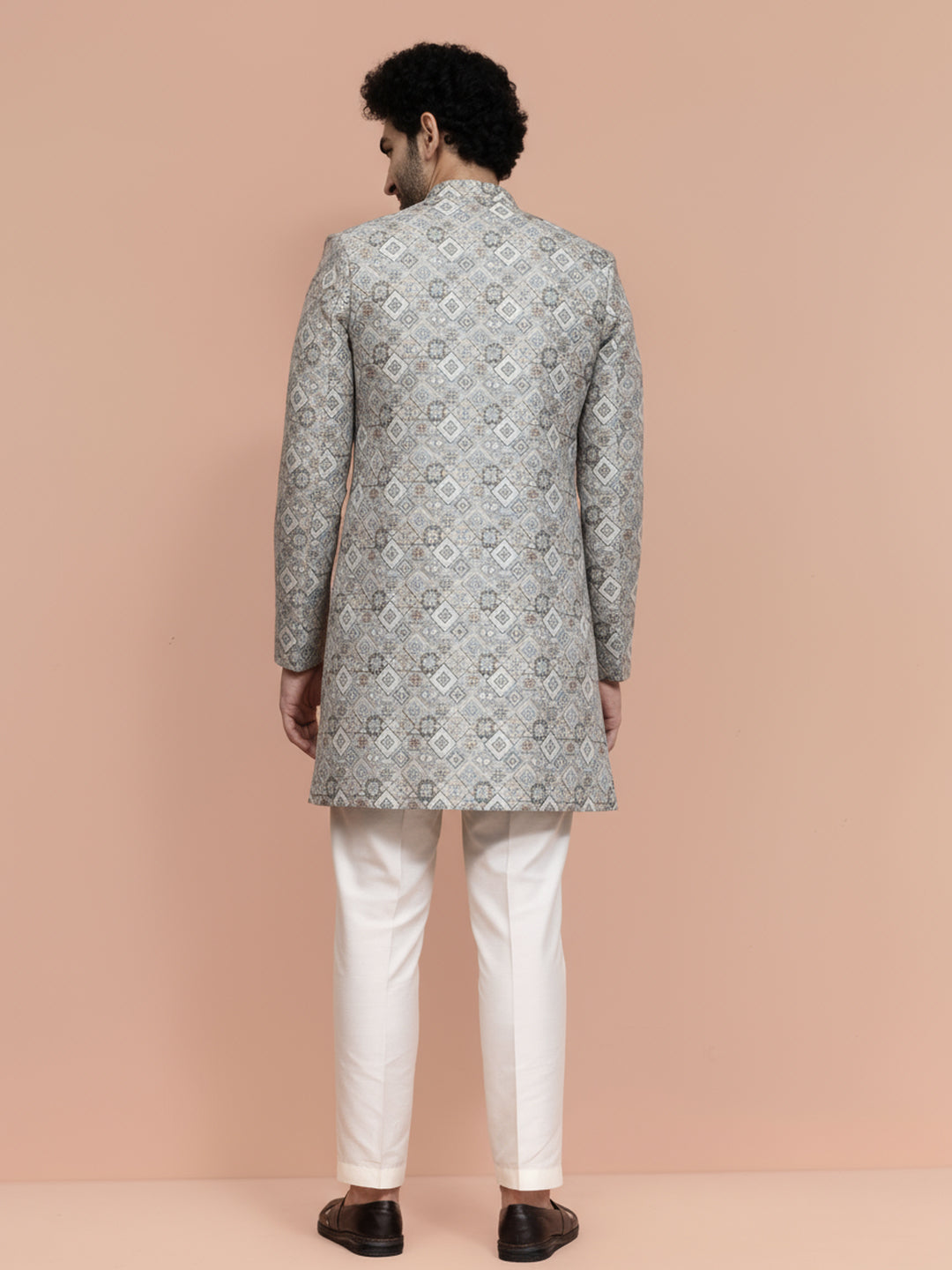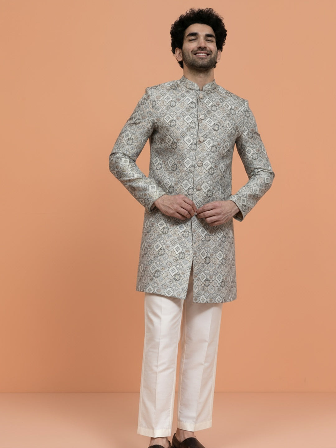 Grey jacquard sherwani paired with mint kurta and ivory wide-leg trousers — perfect for weddings and festive celebrations.