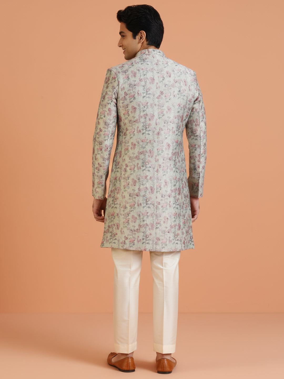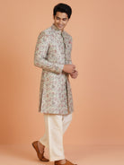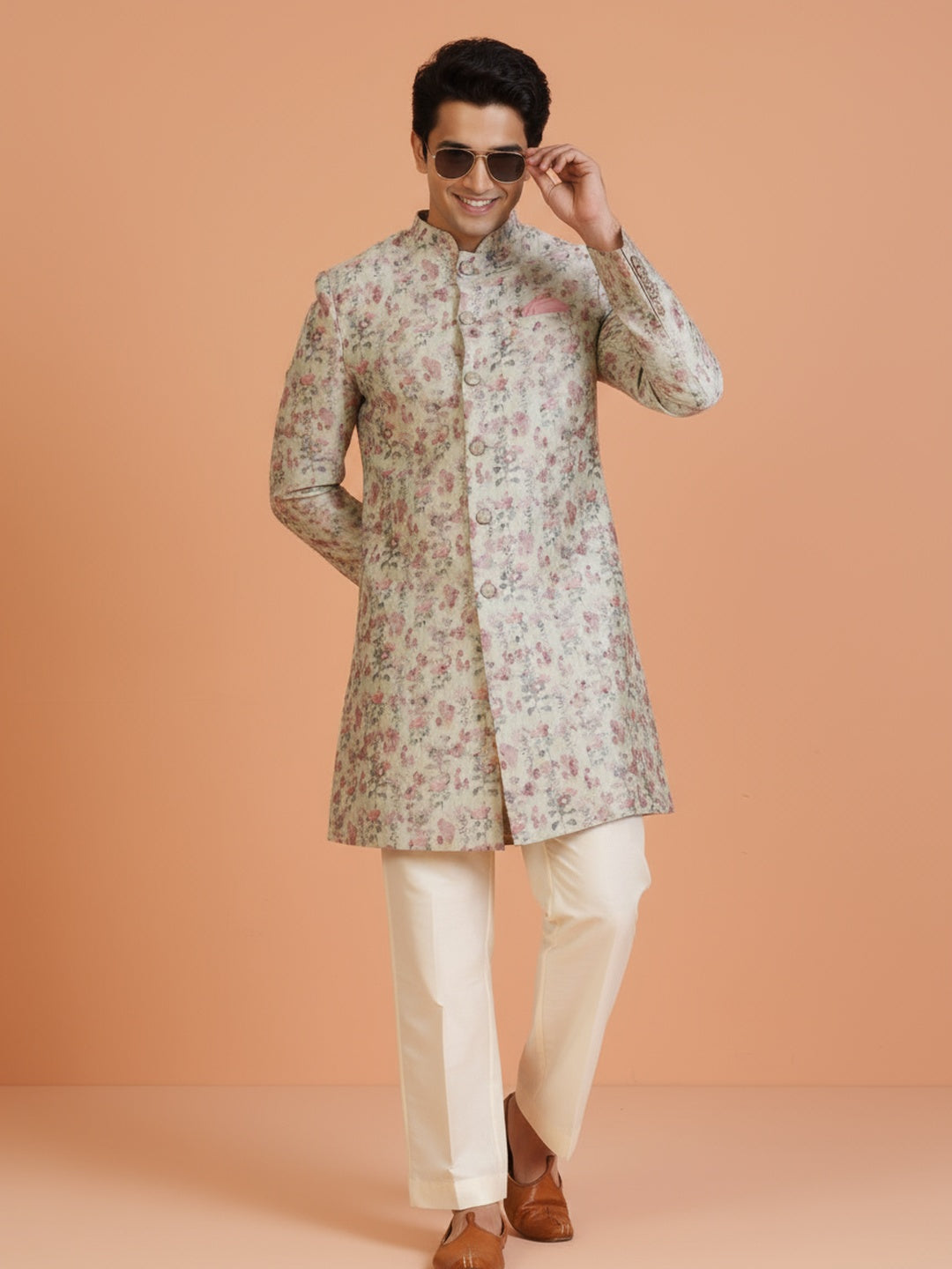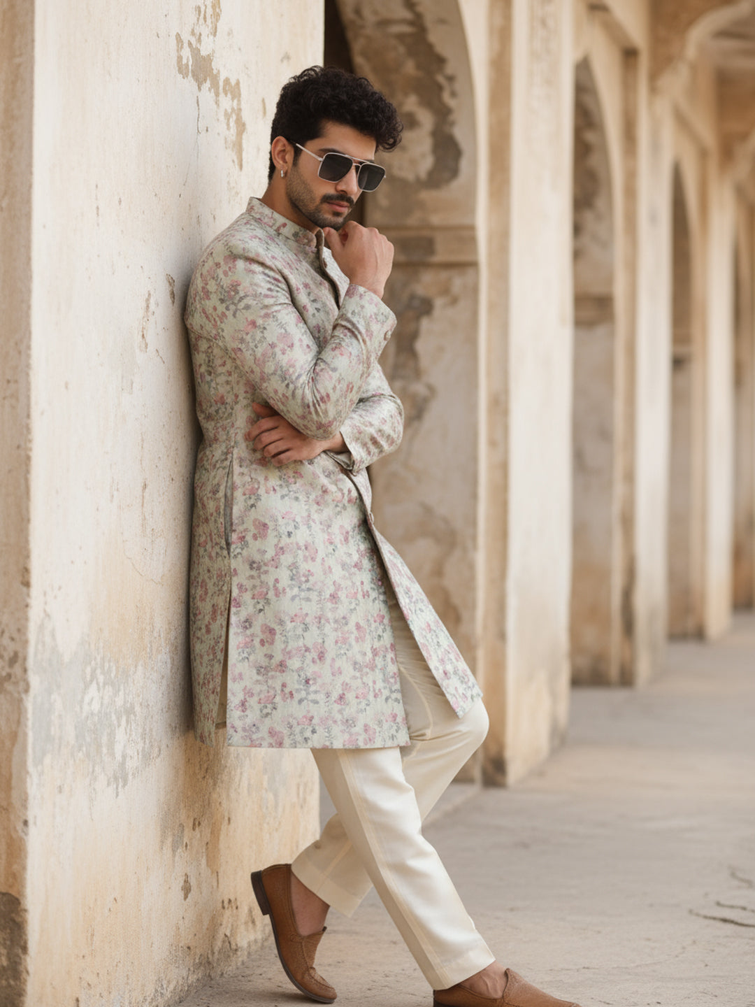 Ivory floral printed sherwani trouser set by Kisah a refreshing festive ensemble styled with ivory wide-leg trousers for modern understated elegance.