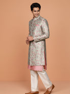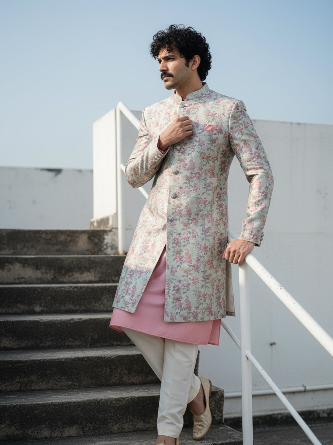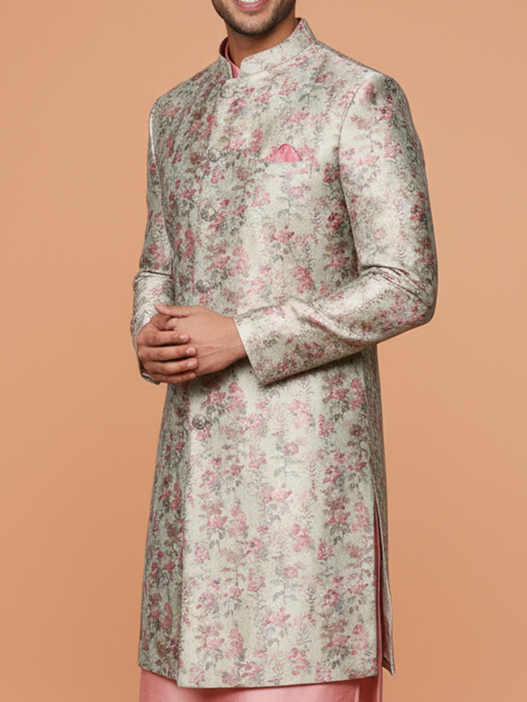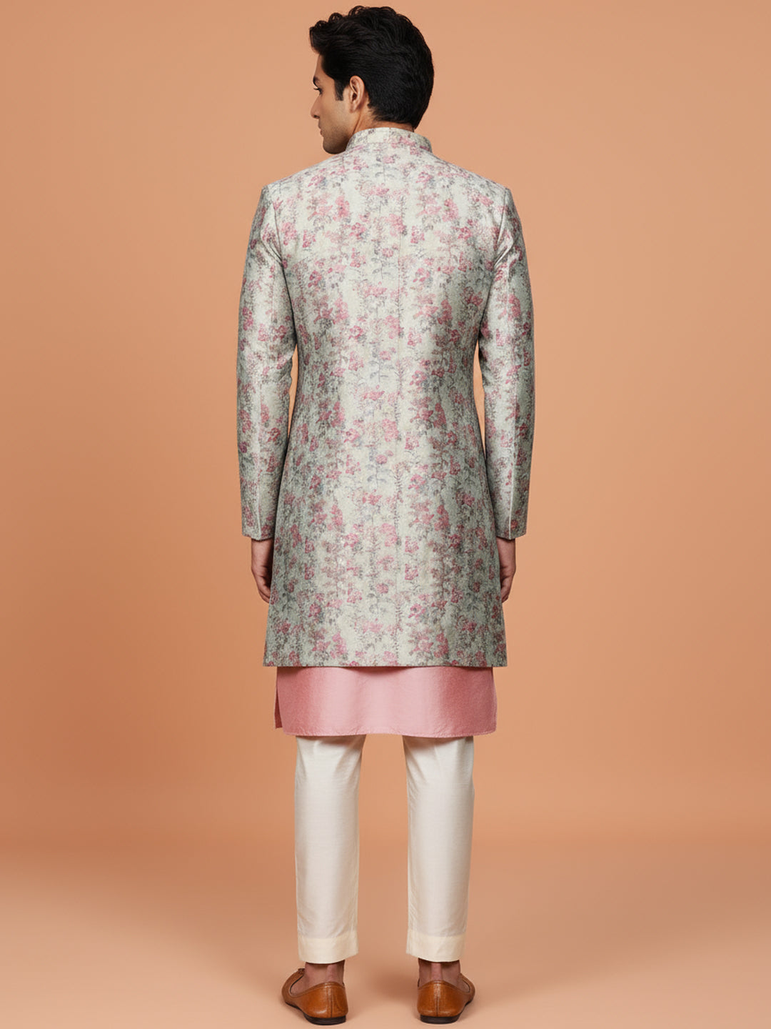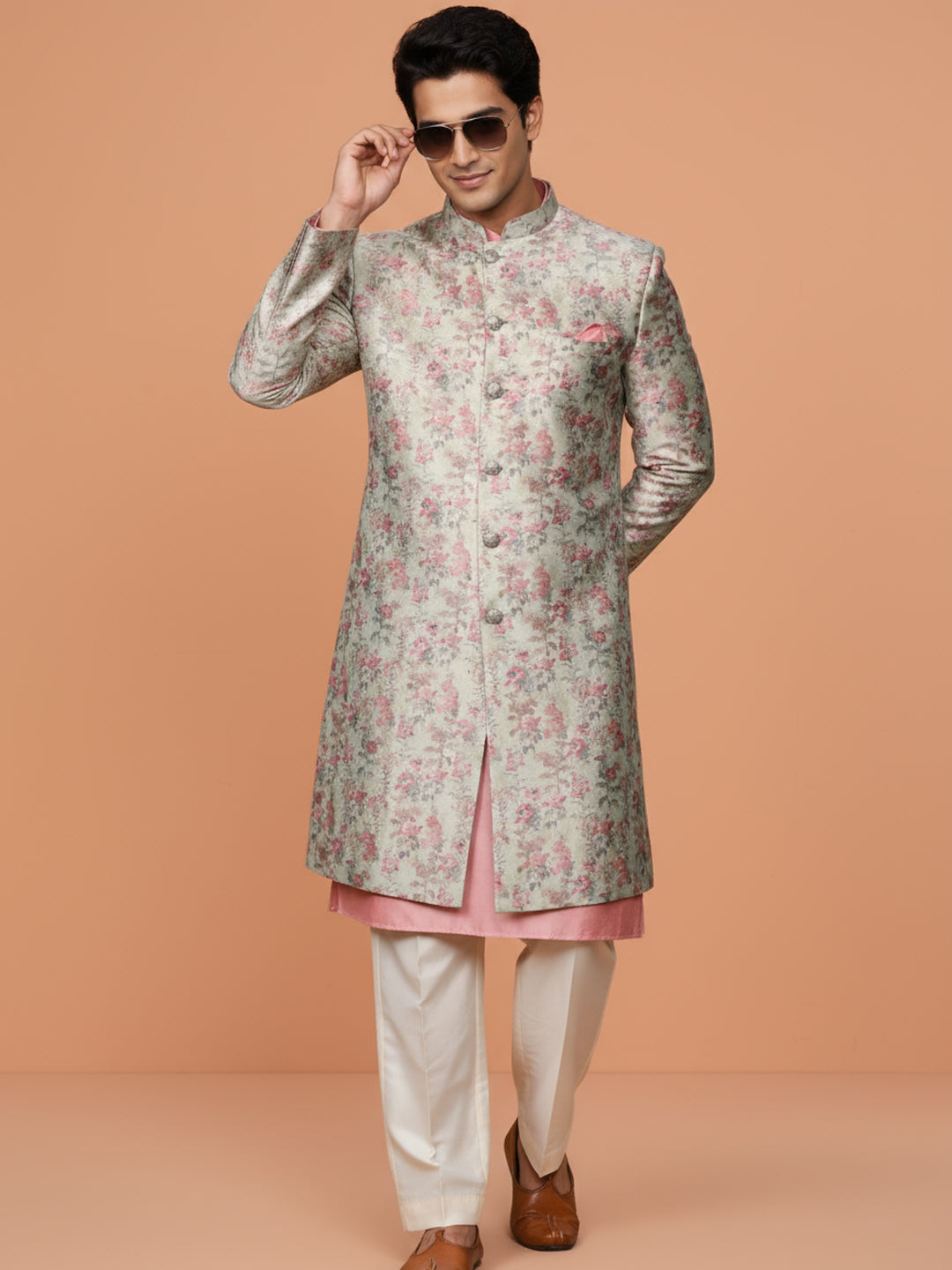 Ivory floral sherwani with peach kurta and ivory wide-leg trouser a perfect pastel ensemble for weddings and festive celebrations.