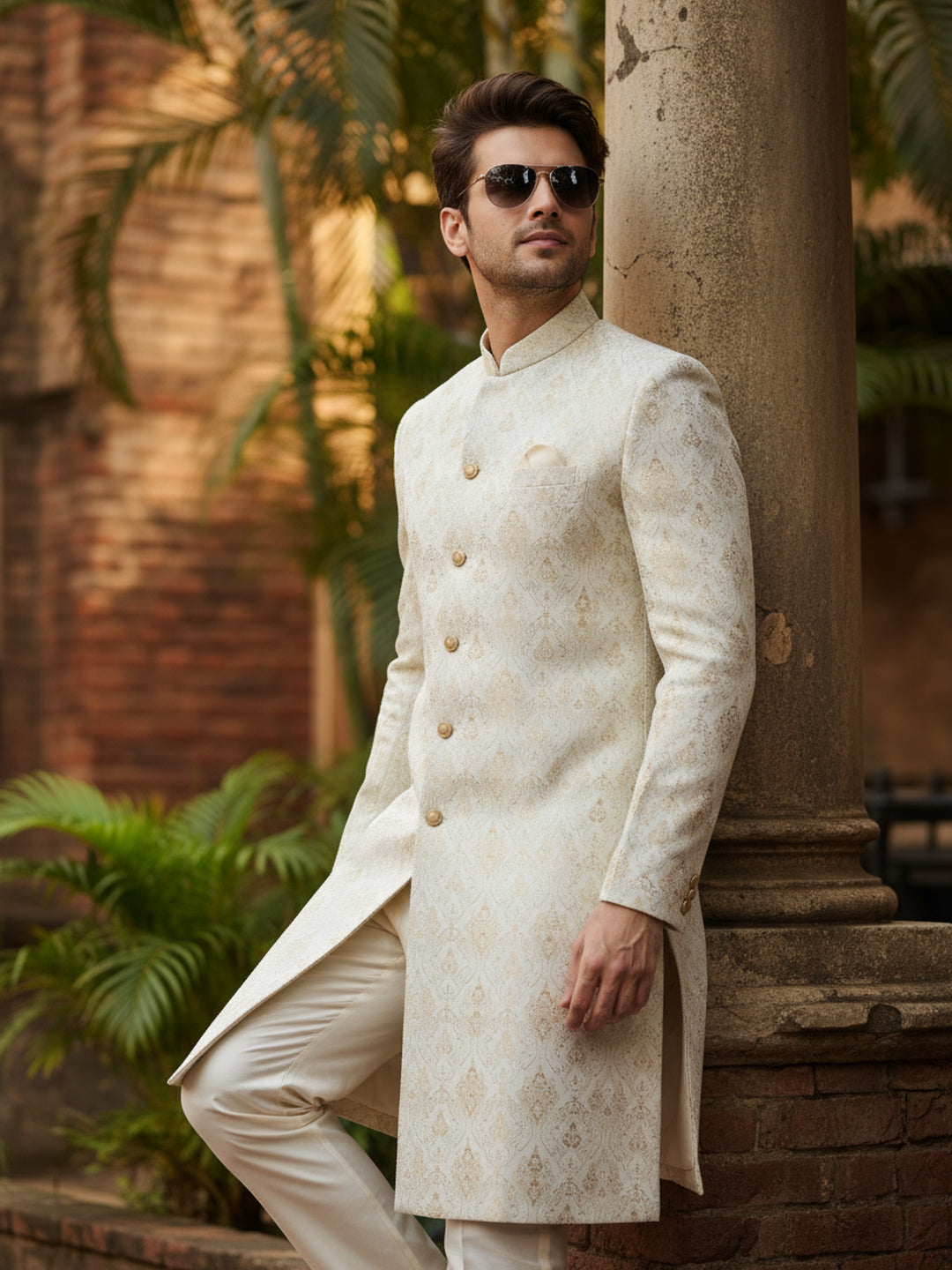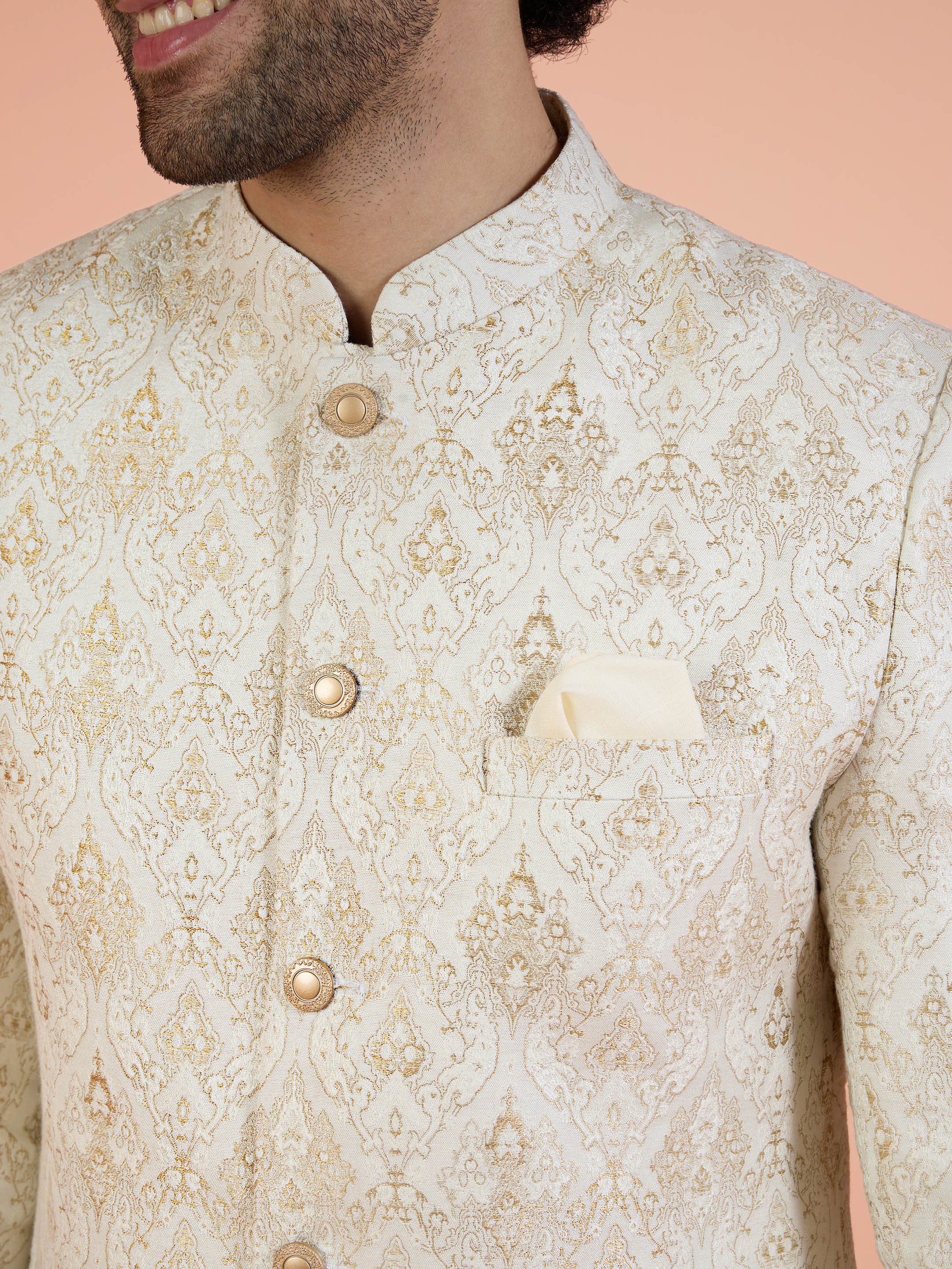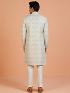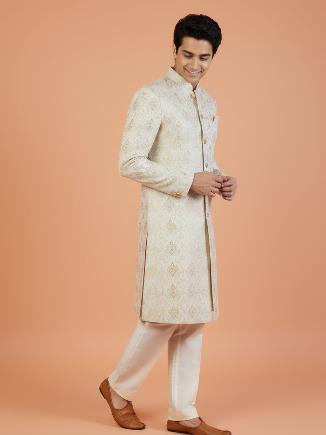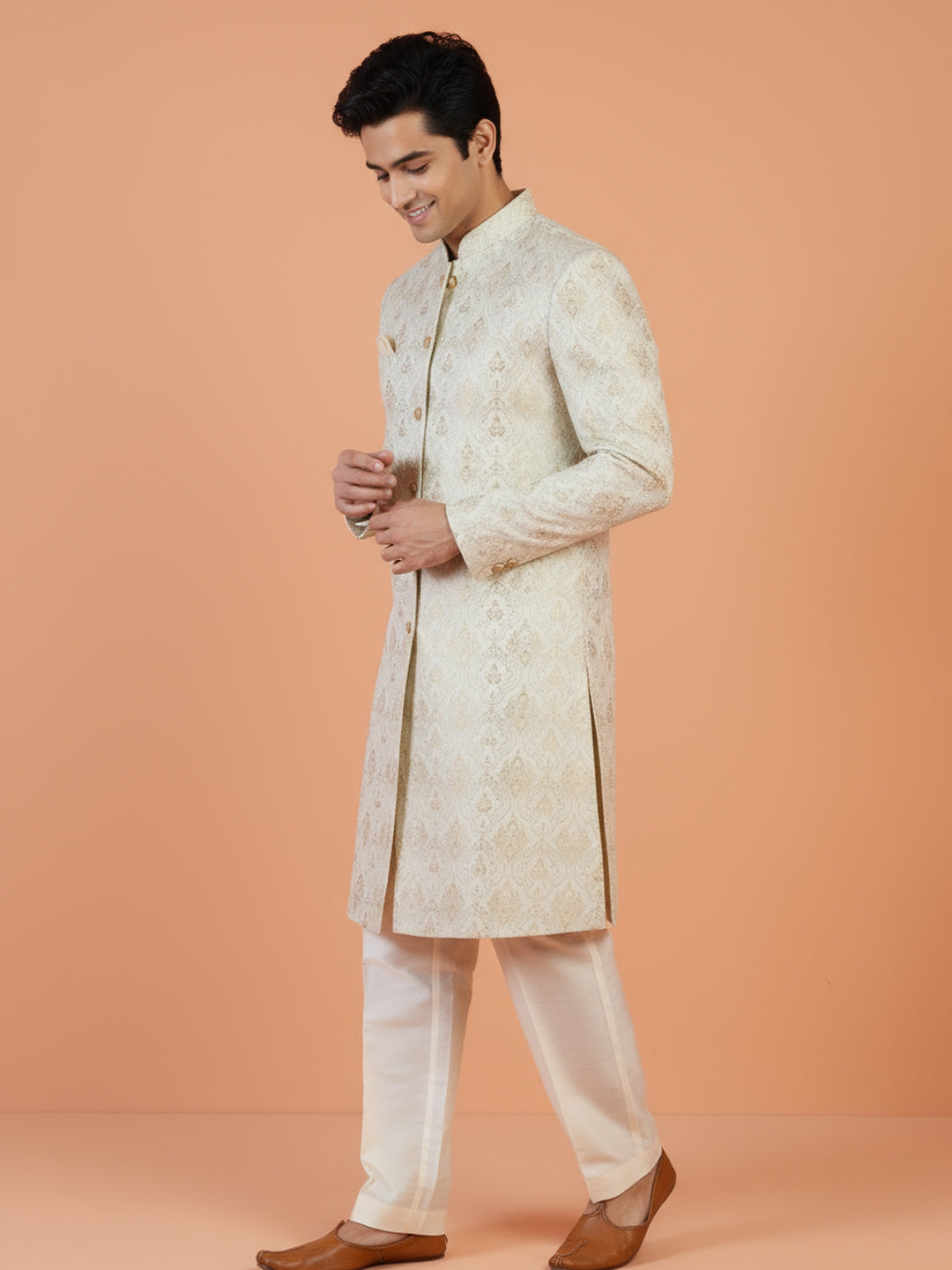 Ivory-gold jacquard sherwani paired with ivory wide-leg trouser — elegant and perfect for weddings, receptions, and festive occasions.