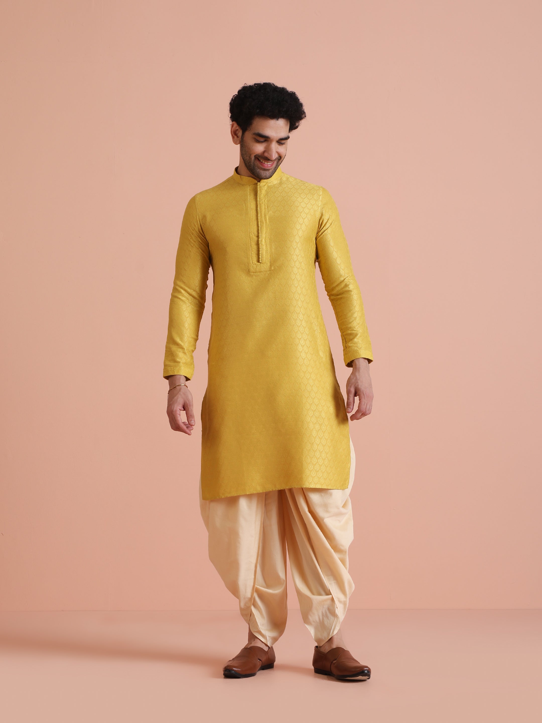 The Kisah kurta Sets is ideal for men looking for stylish yet comfortable attire. Crafted from Cotton Blend fabric, Yellow color, stylish pattern, and comfortable fit make it perfect for festive wear.