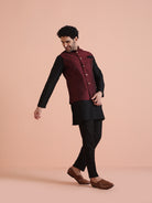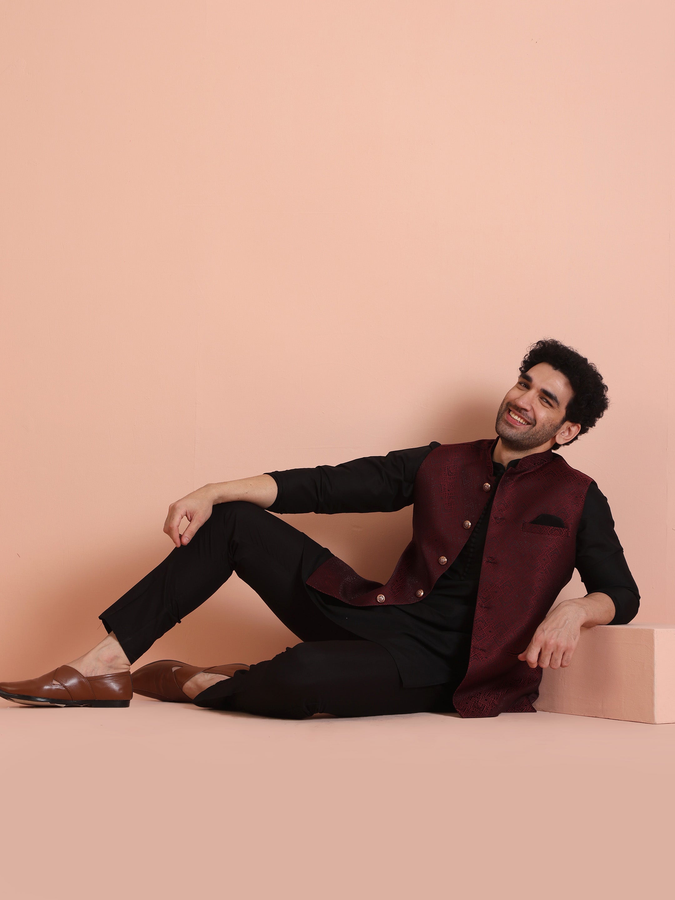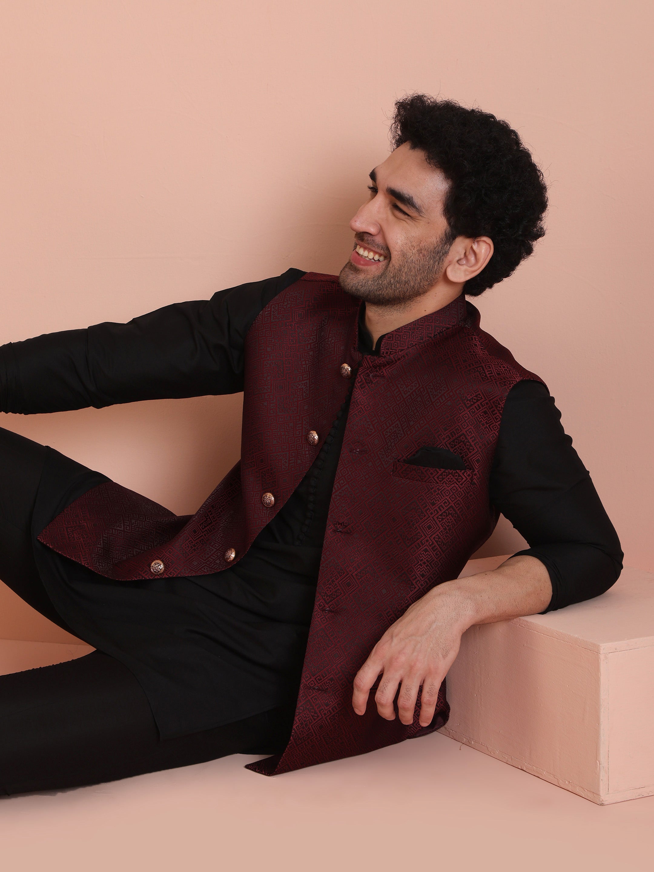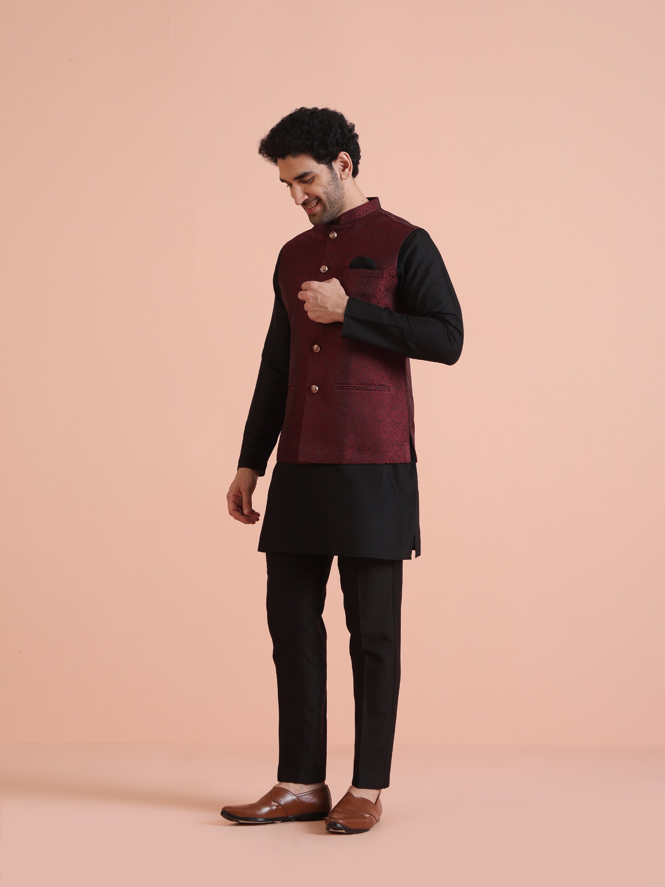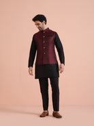 Elevate your ethnic wear with this maroon silk blend jacquard jacket. Featuring a textured design and regular fit, it adds a stylish touch to your wardrobe.
