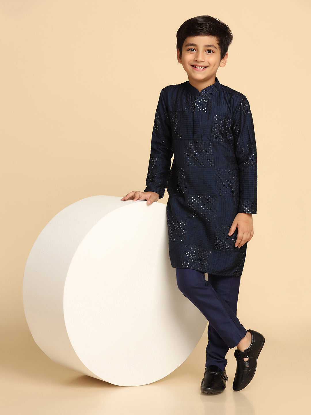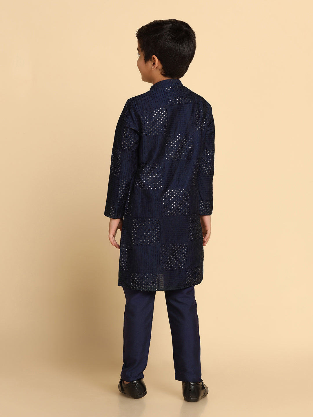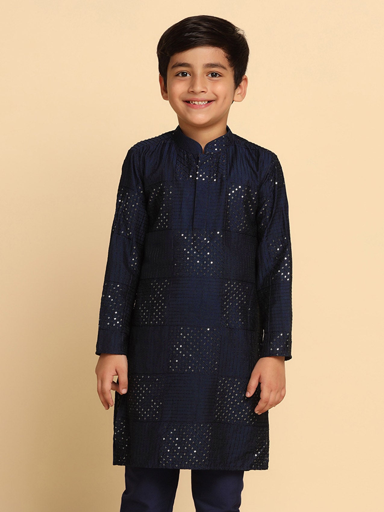 Make a statement with this navy blue embellished cotton blend kurta. Its regular fit adds both style and comfort.