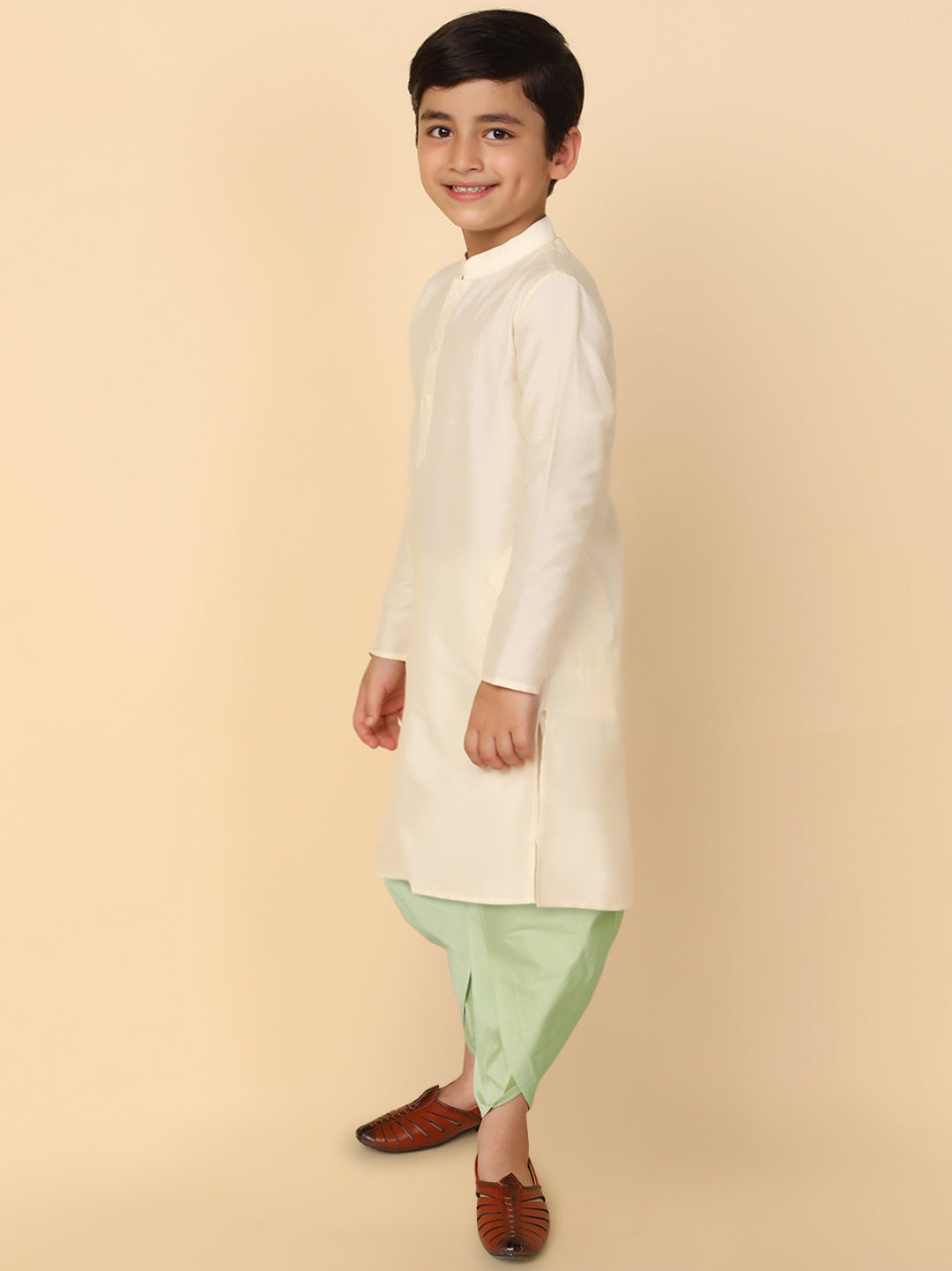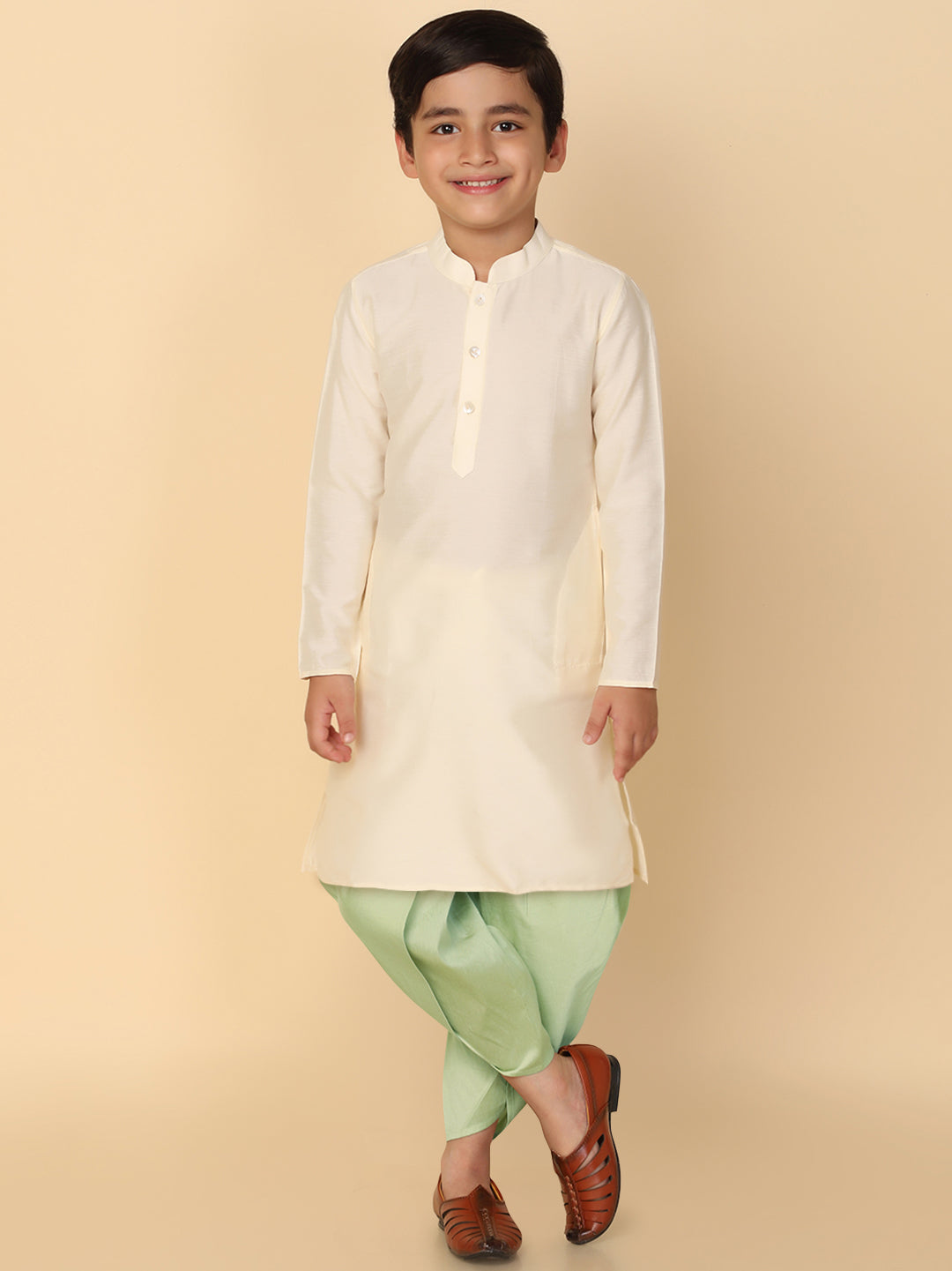 This Kurta Set with Off White is an elegant mandarin collar style that is perfect for occasional wear. With a full sleeve Solid Dyed design and Cotton Blend fabric, it will make you look stylish.