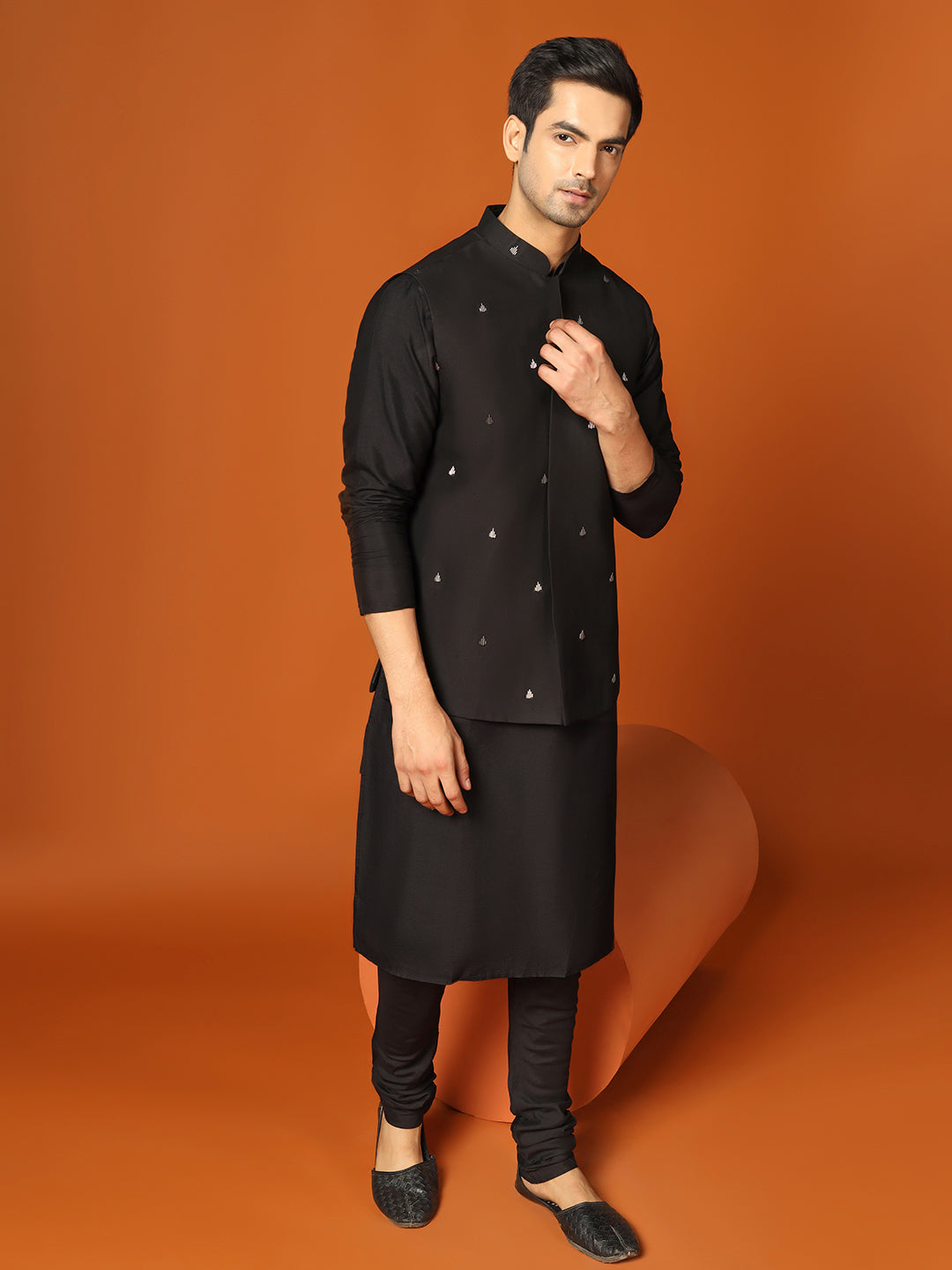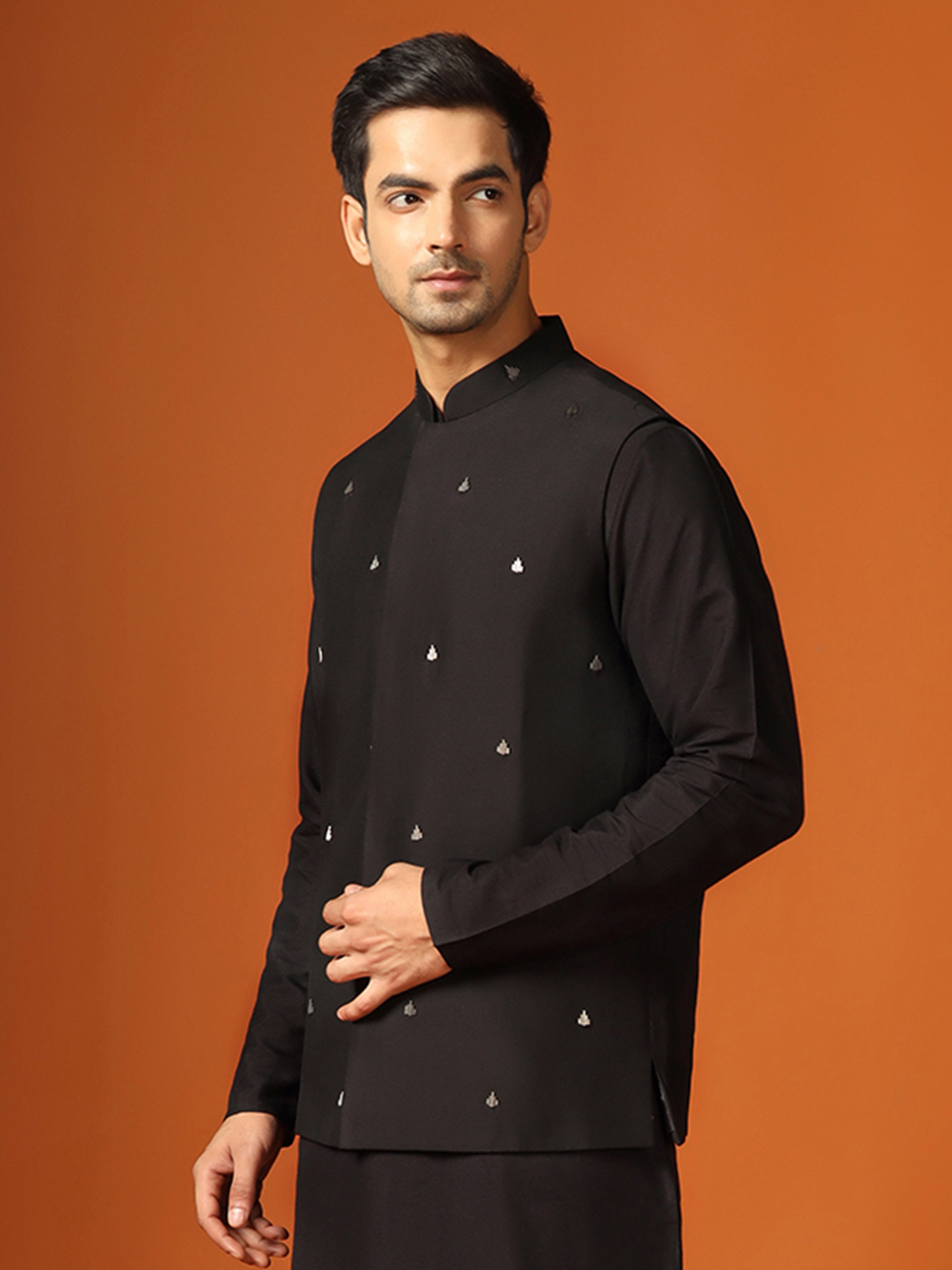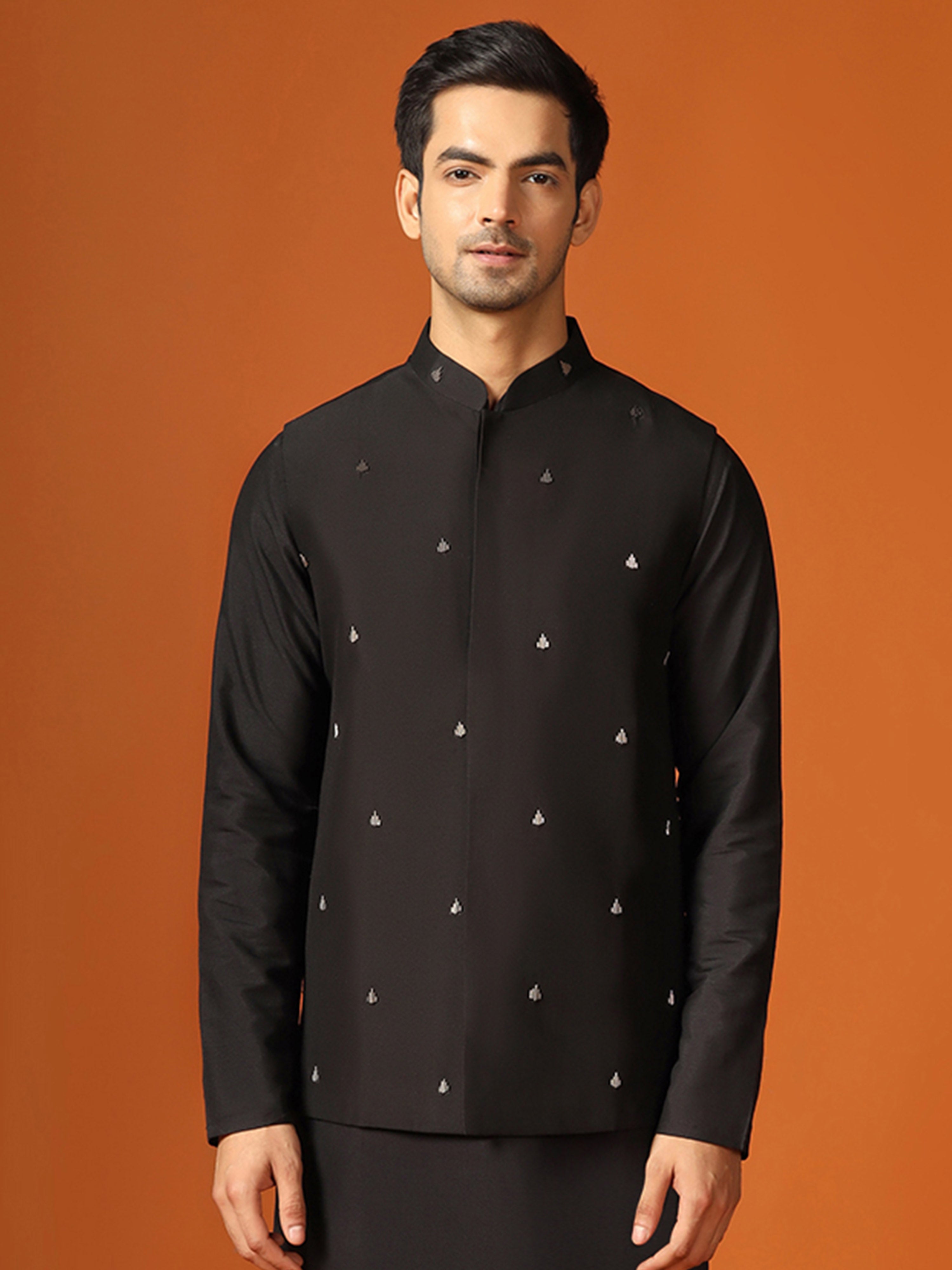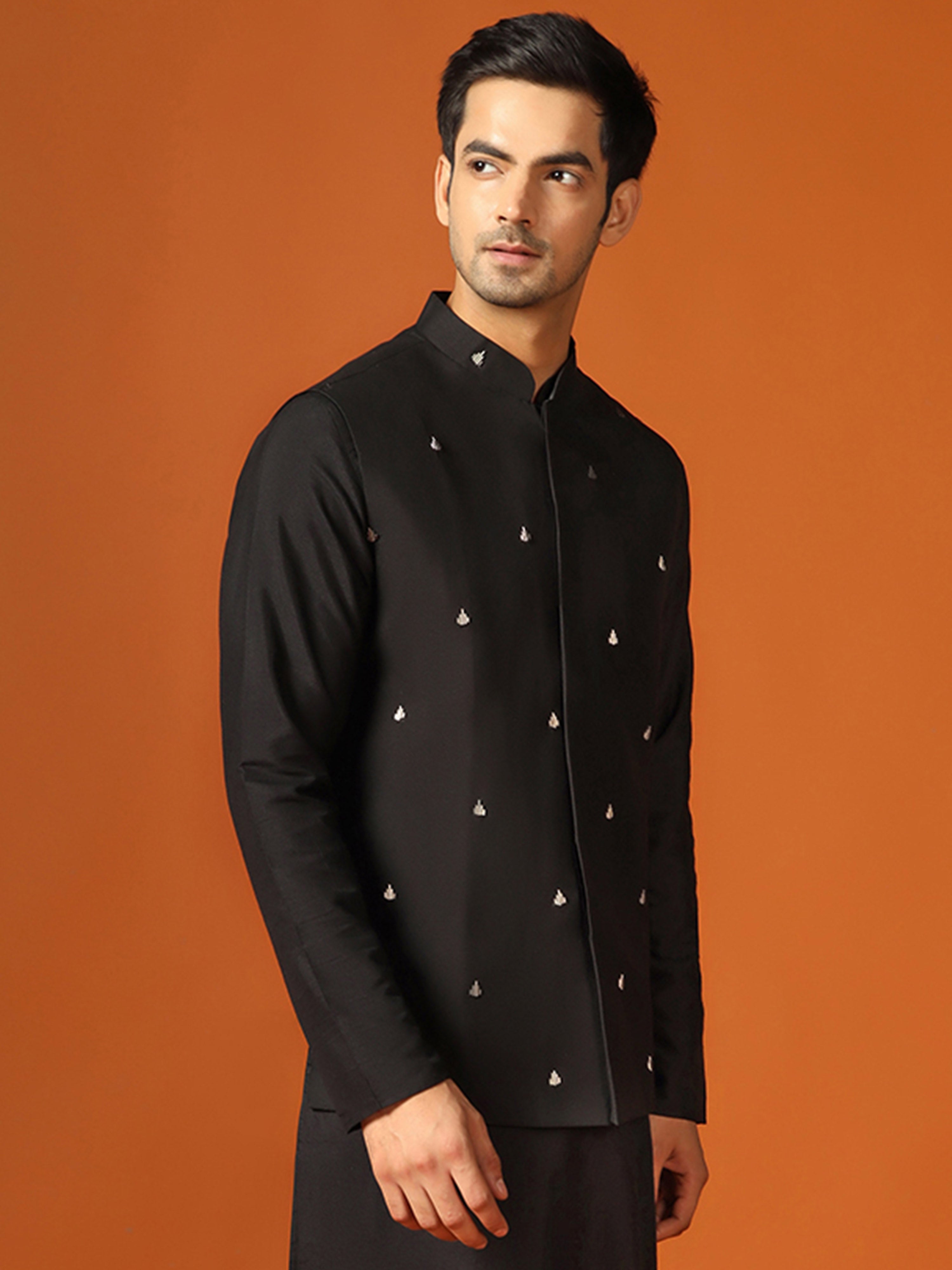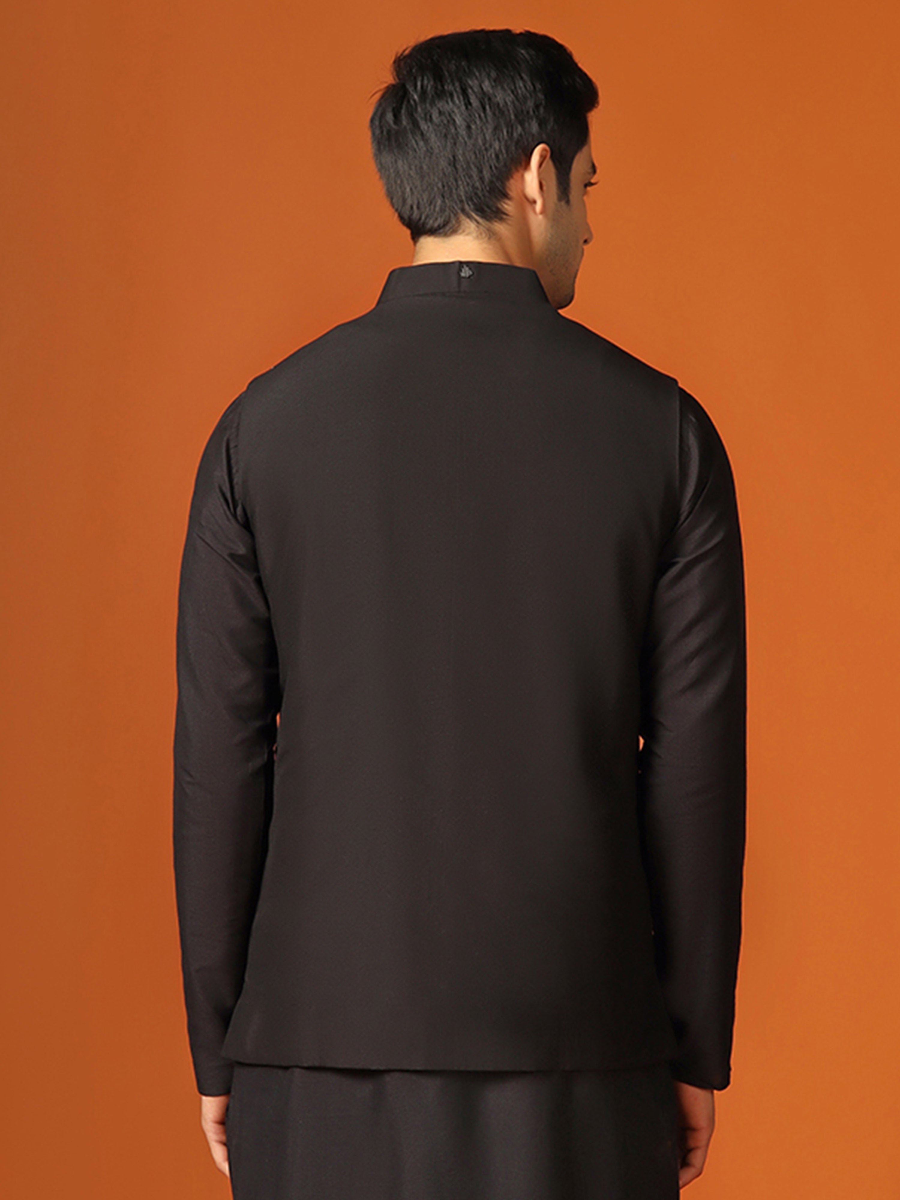 Stay stylish and warm with this men's Nehru Jacket. This classic design is made from Cotton Blend fabric which Embellished Pattern and comes in Black colour. Perfect for any occasion.