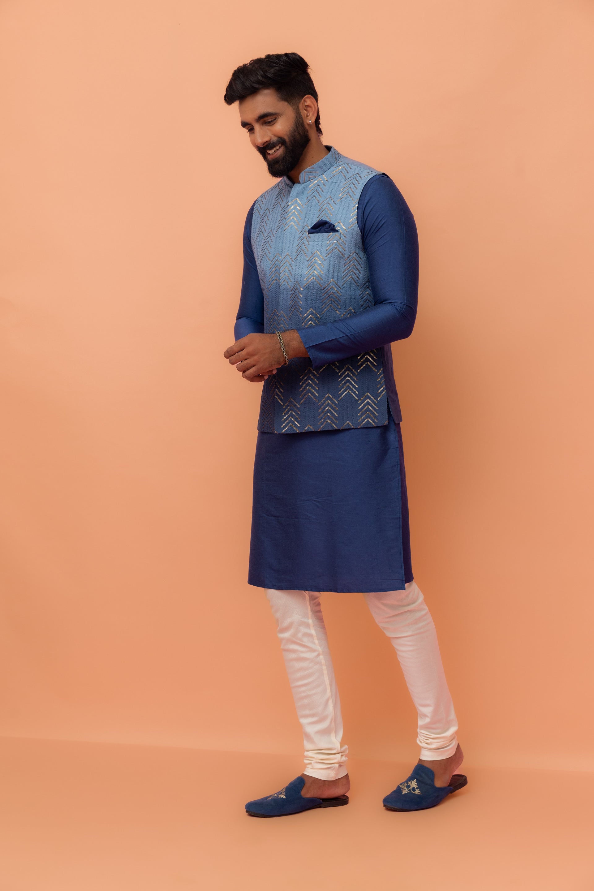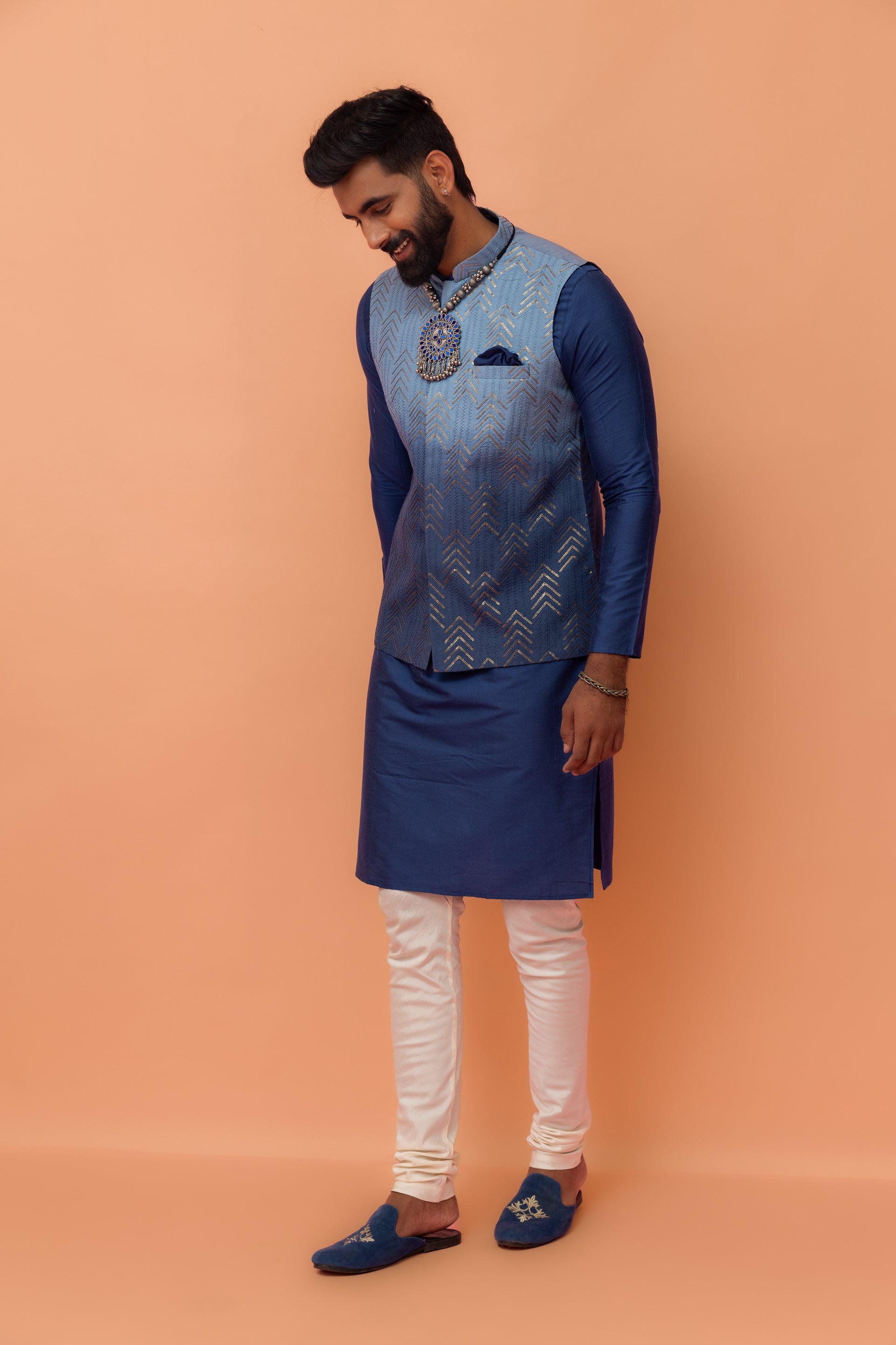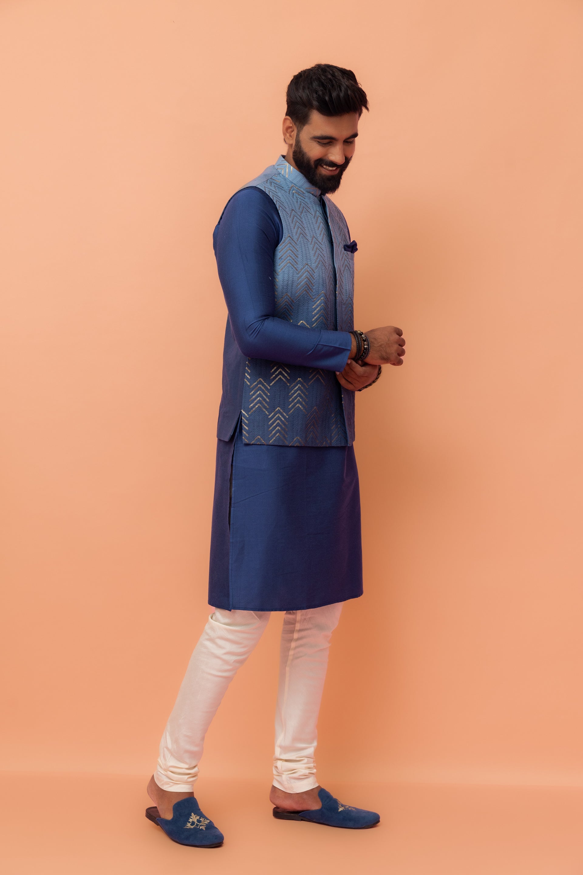 Men Blue Embroidered Kurta Jacket Churidar Set with Sequinned