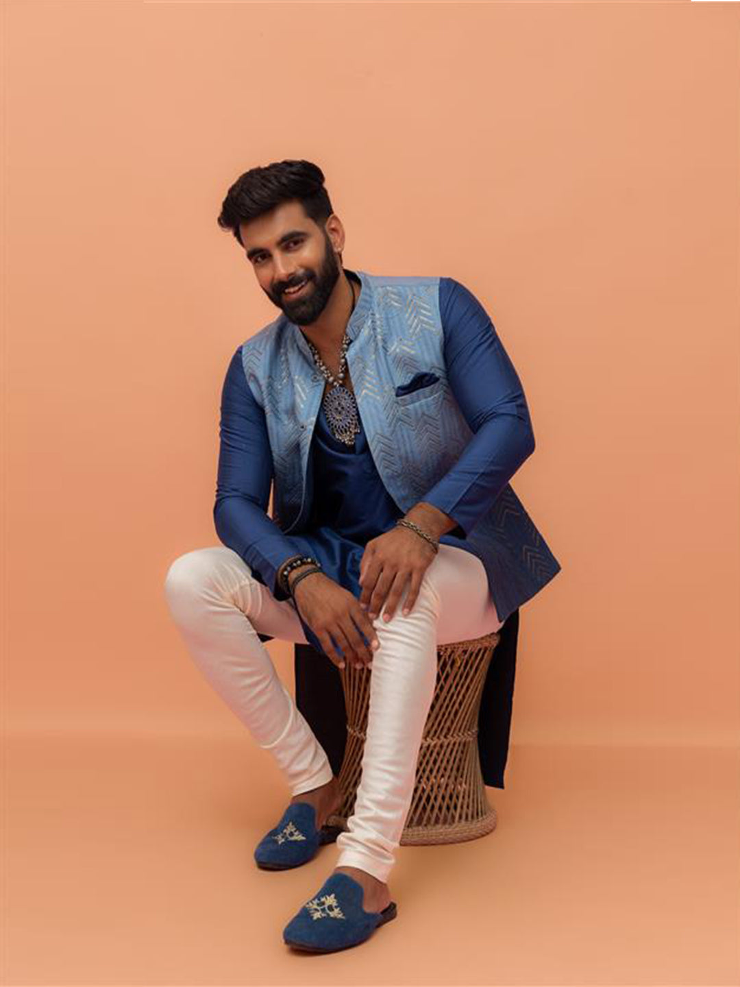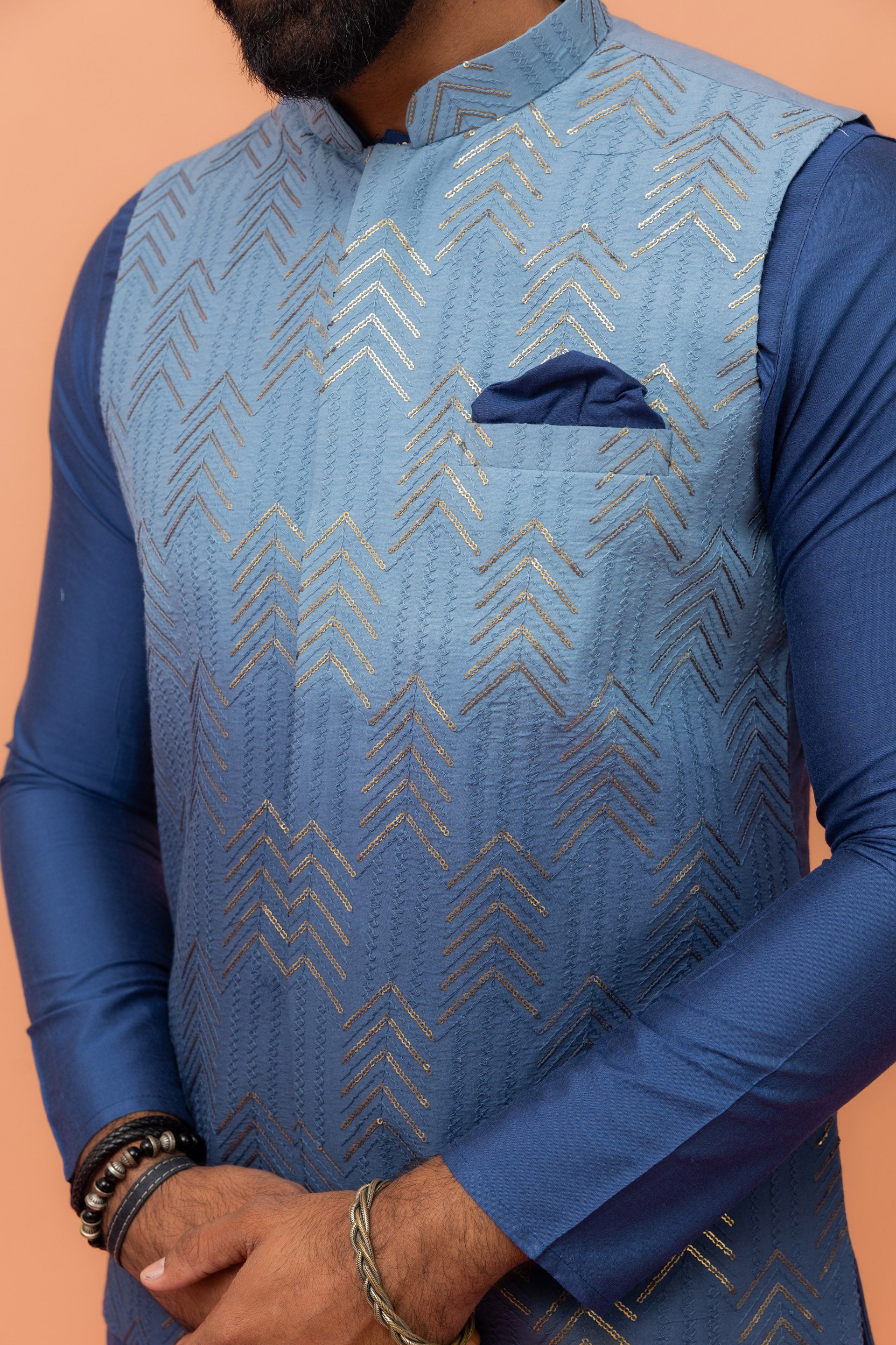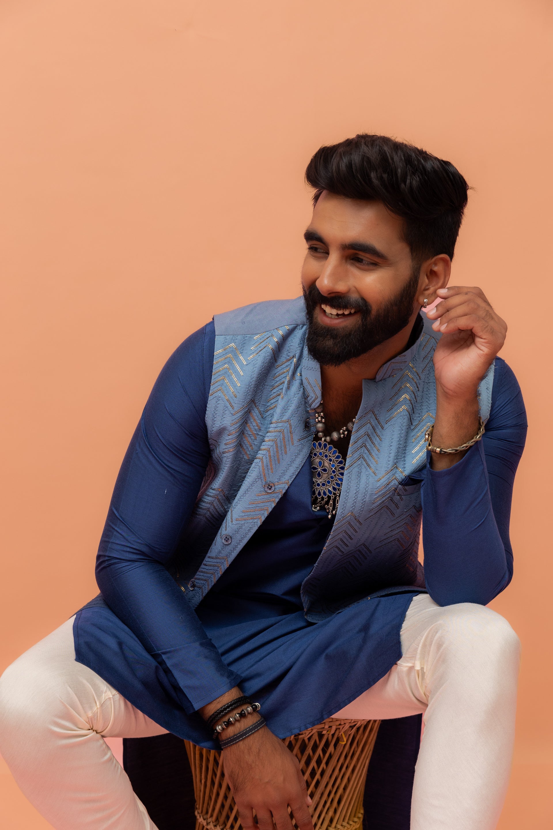 Men Blue Embroidered Kurta Jacket Churidar Set with Sequinned