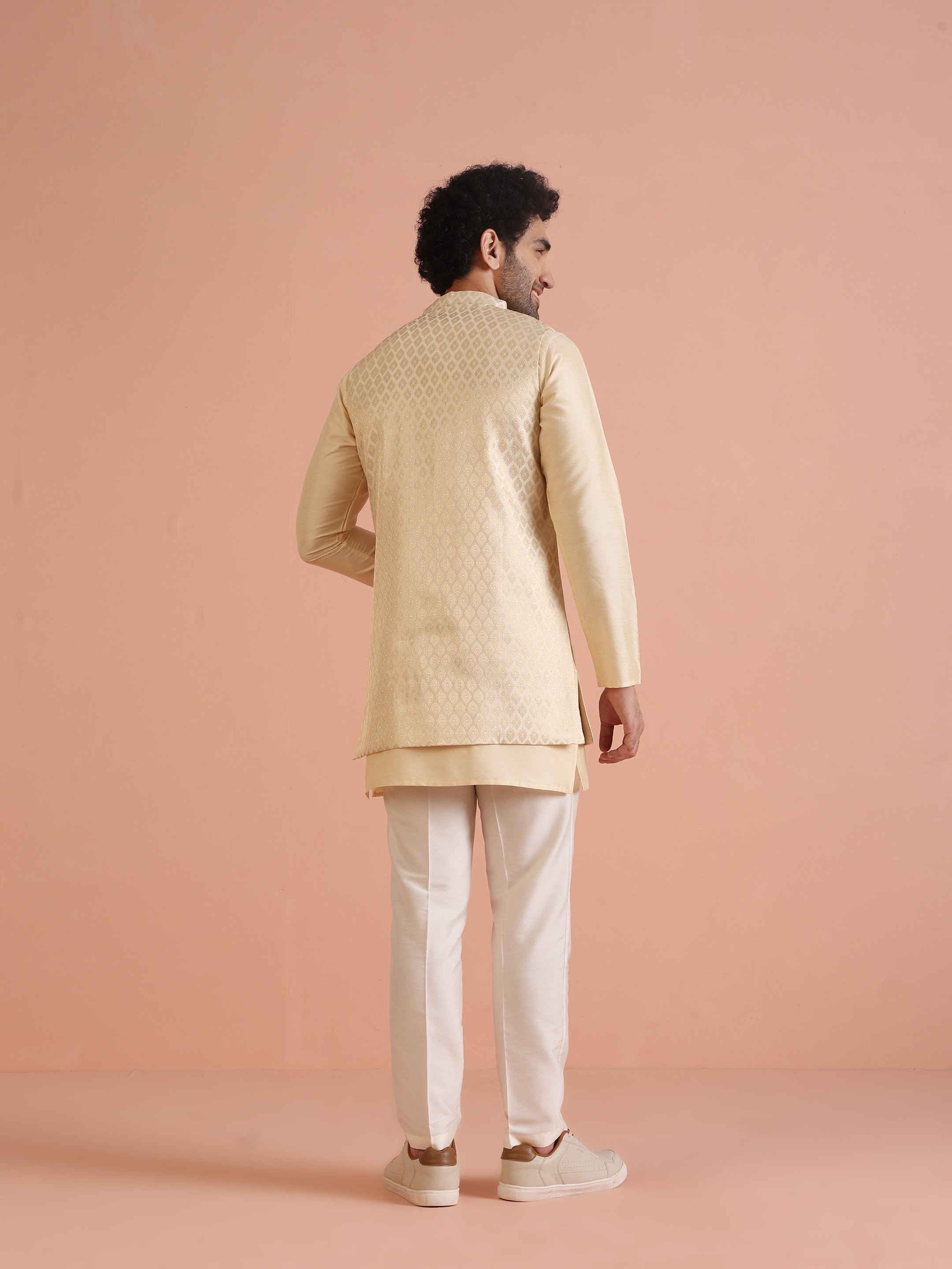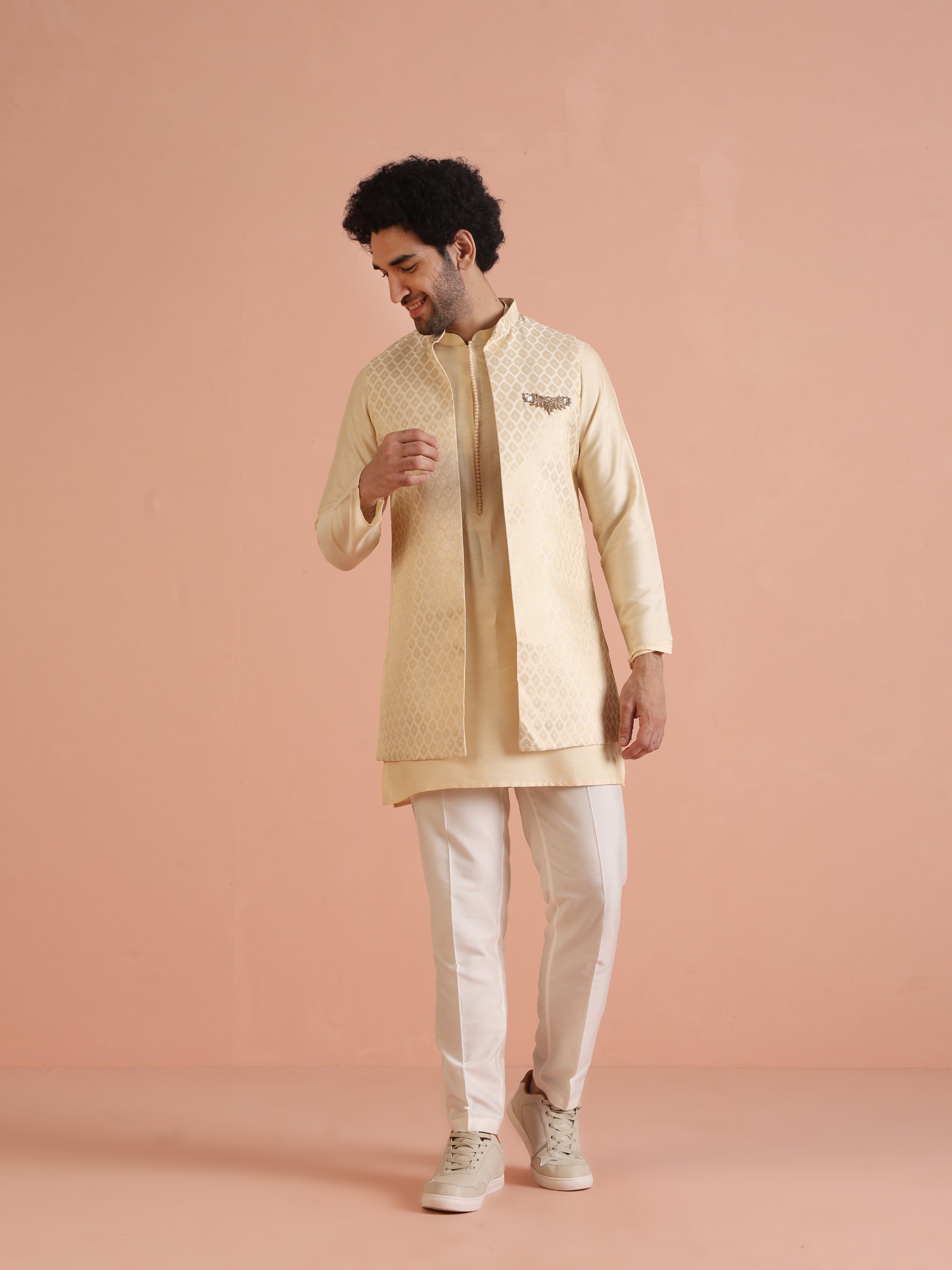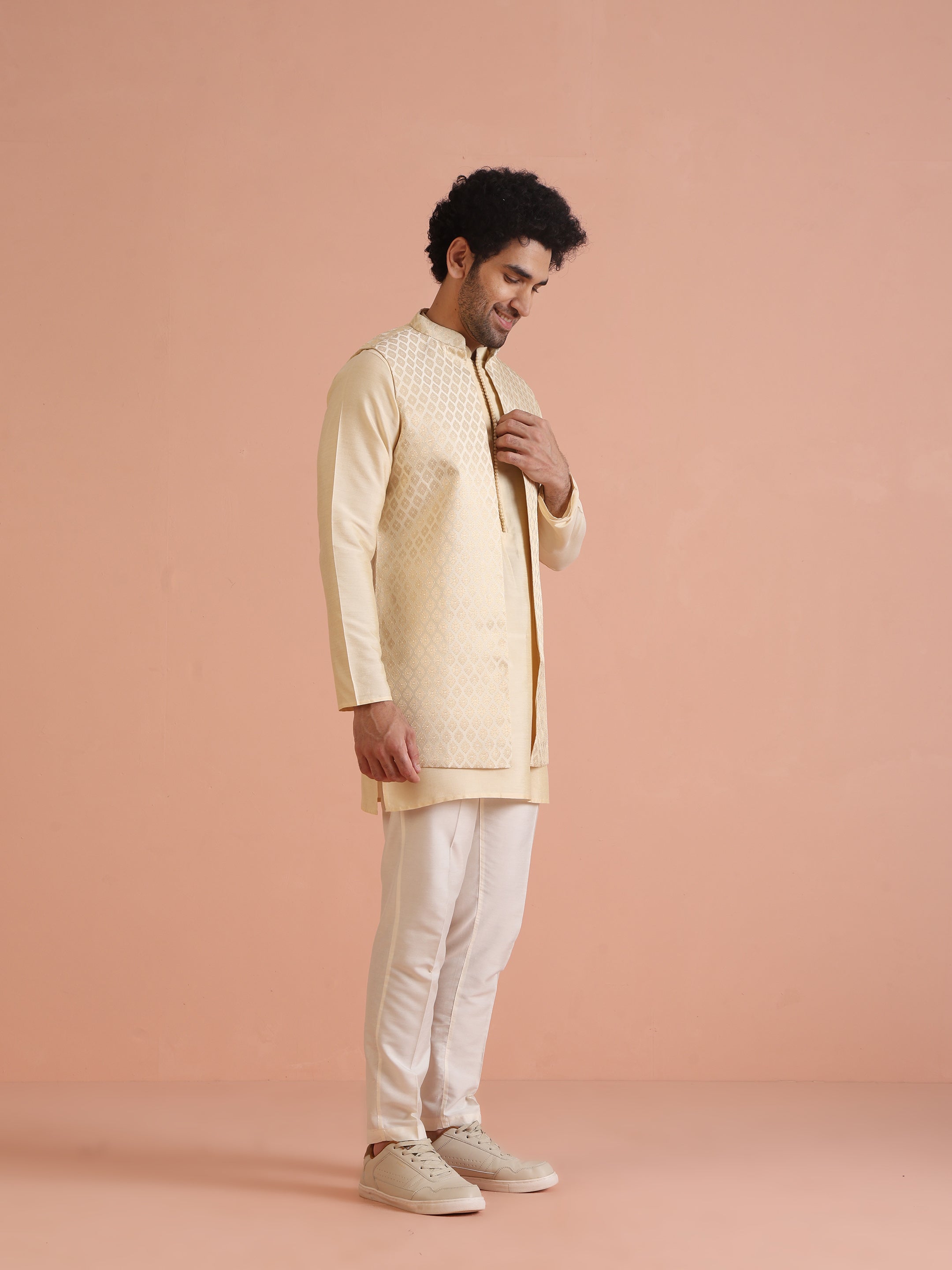 Cream Jacquard Ethnic Motif Nehru Jacket Kurta Trouser Set – Wedding & Festive Wear