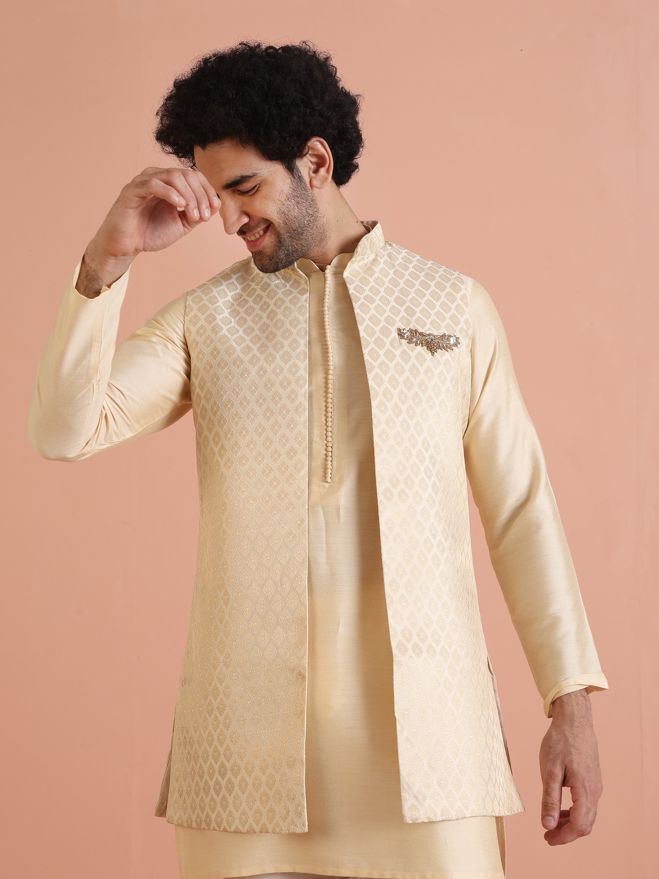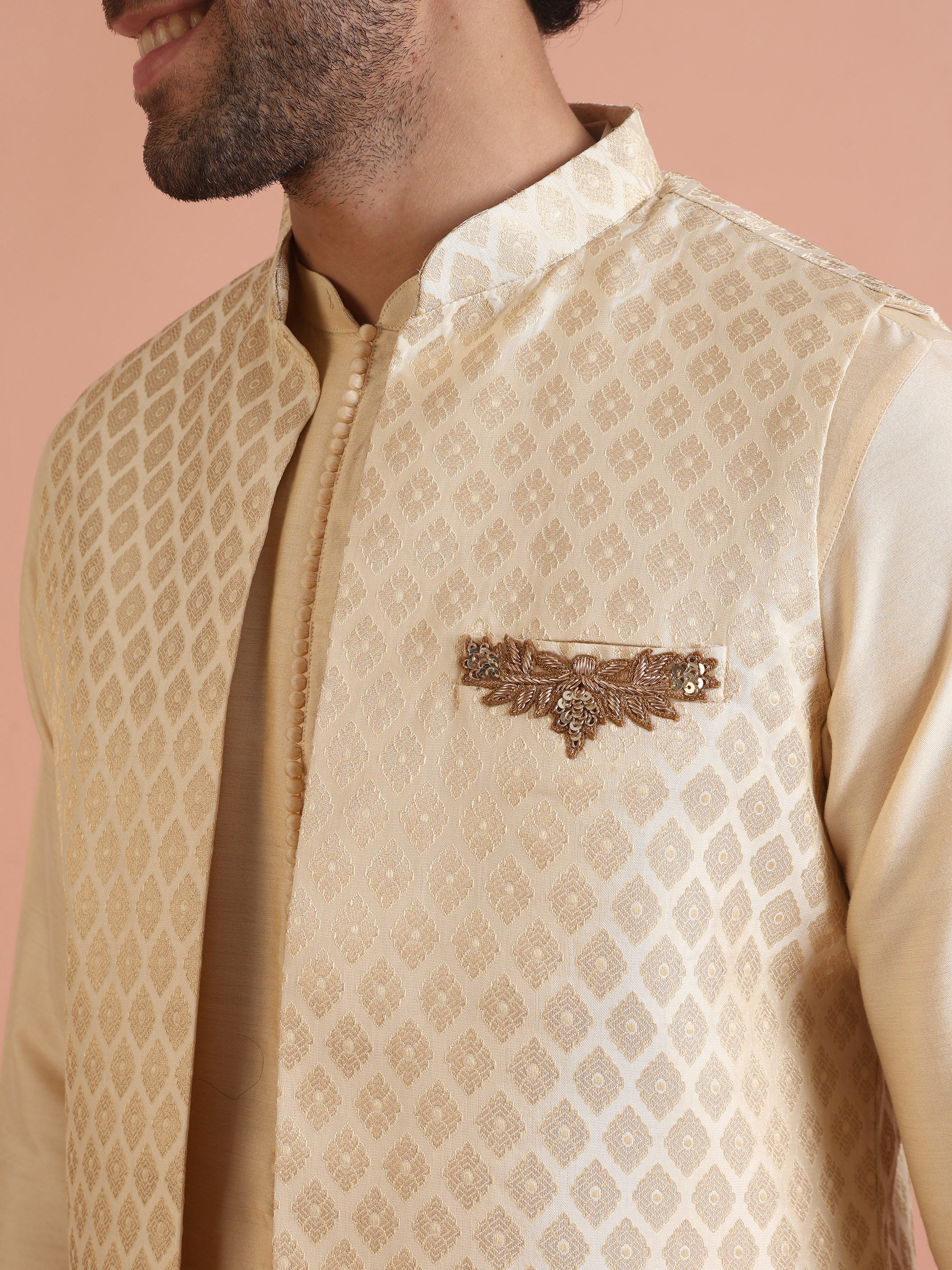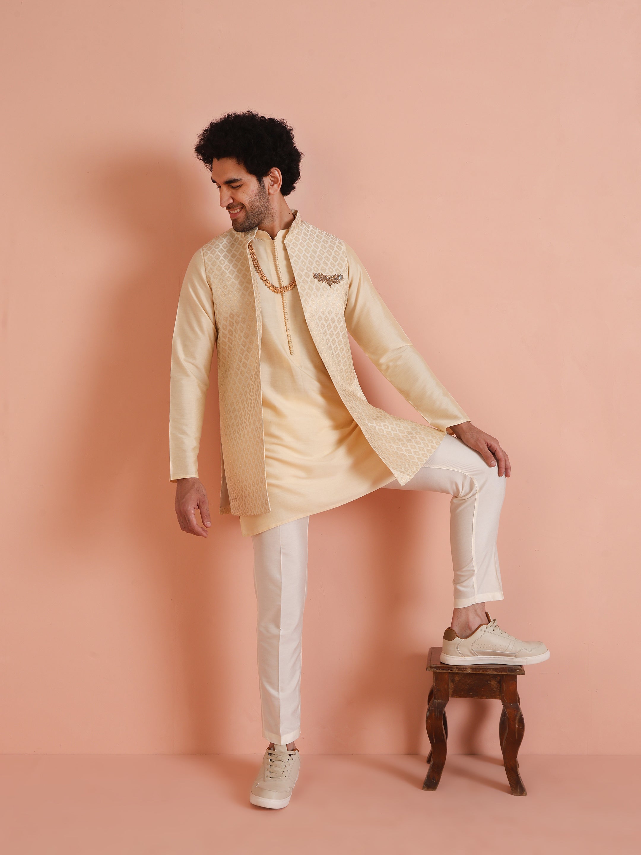 Cream Jacquard Ethnic Motif Nehru Jacket Kurta Trouser Set – Wedding & Festive Wear