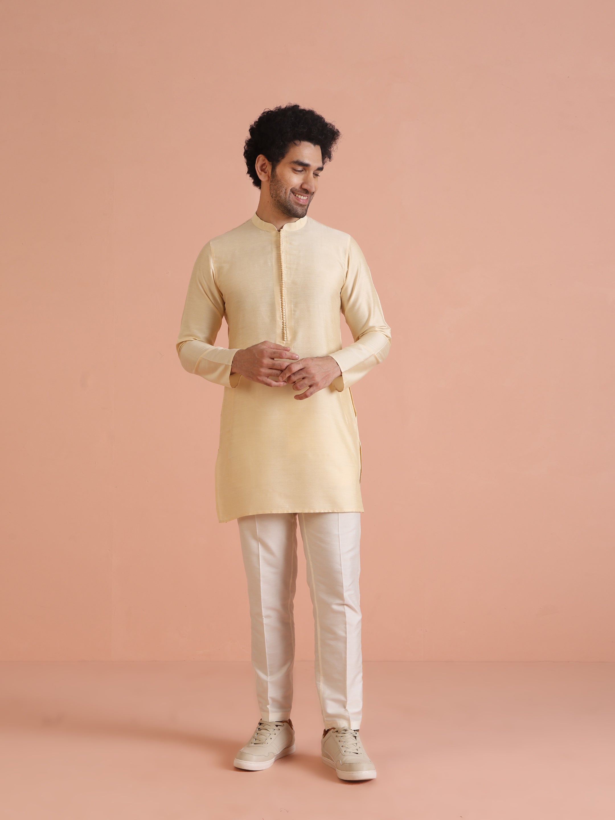 Experience classic elegance with this Kisah Men Cream Jacquard Kurta Jacket Trouser Set. The breathable fabric ensures comfort throughout the day. Ideal for festive events or casual wear.