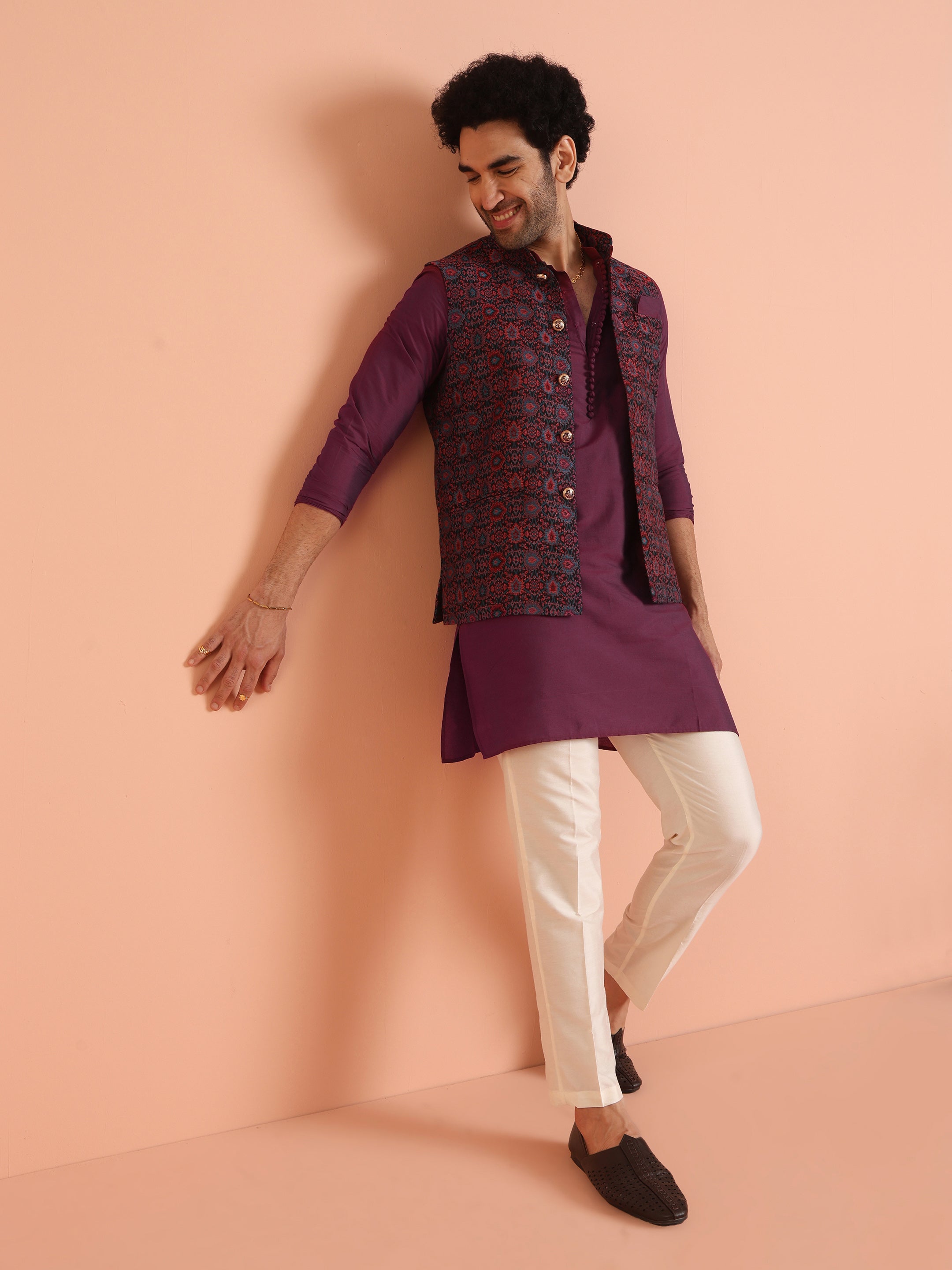 Wine Silk Blend Printed Jacket Kurta Trouser Set