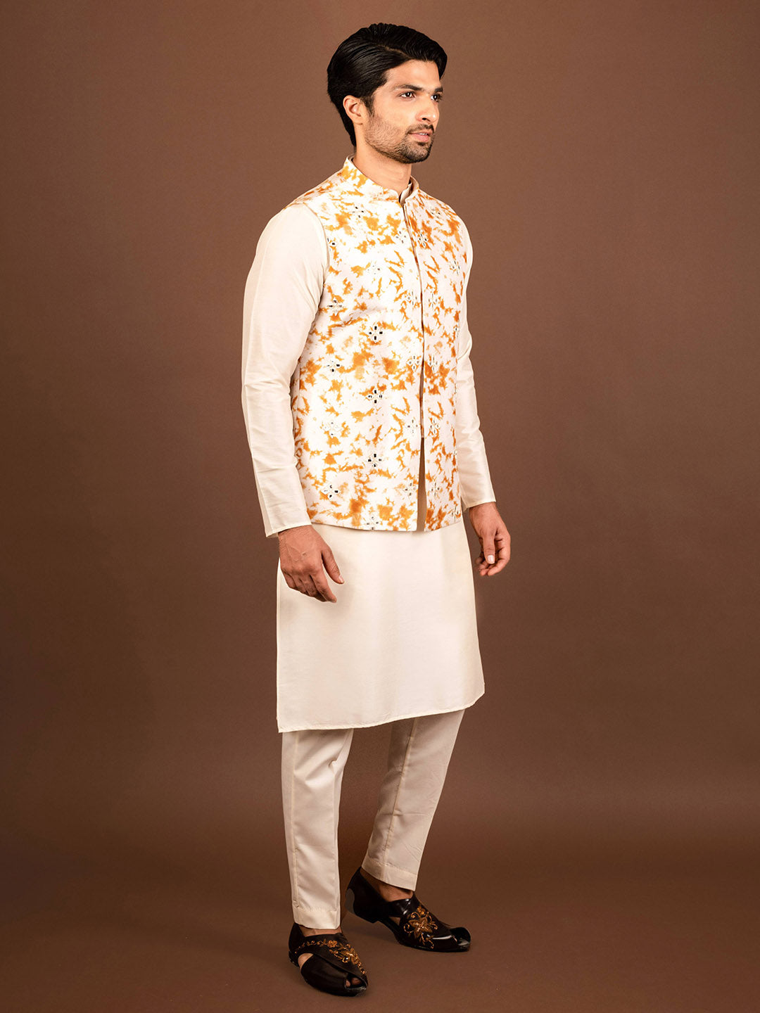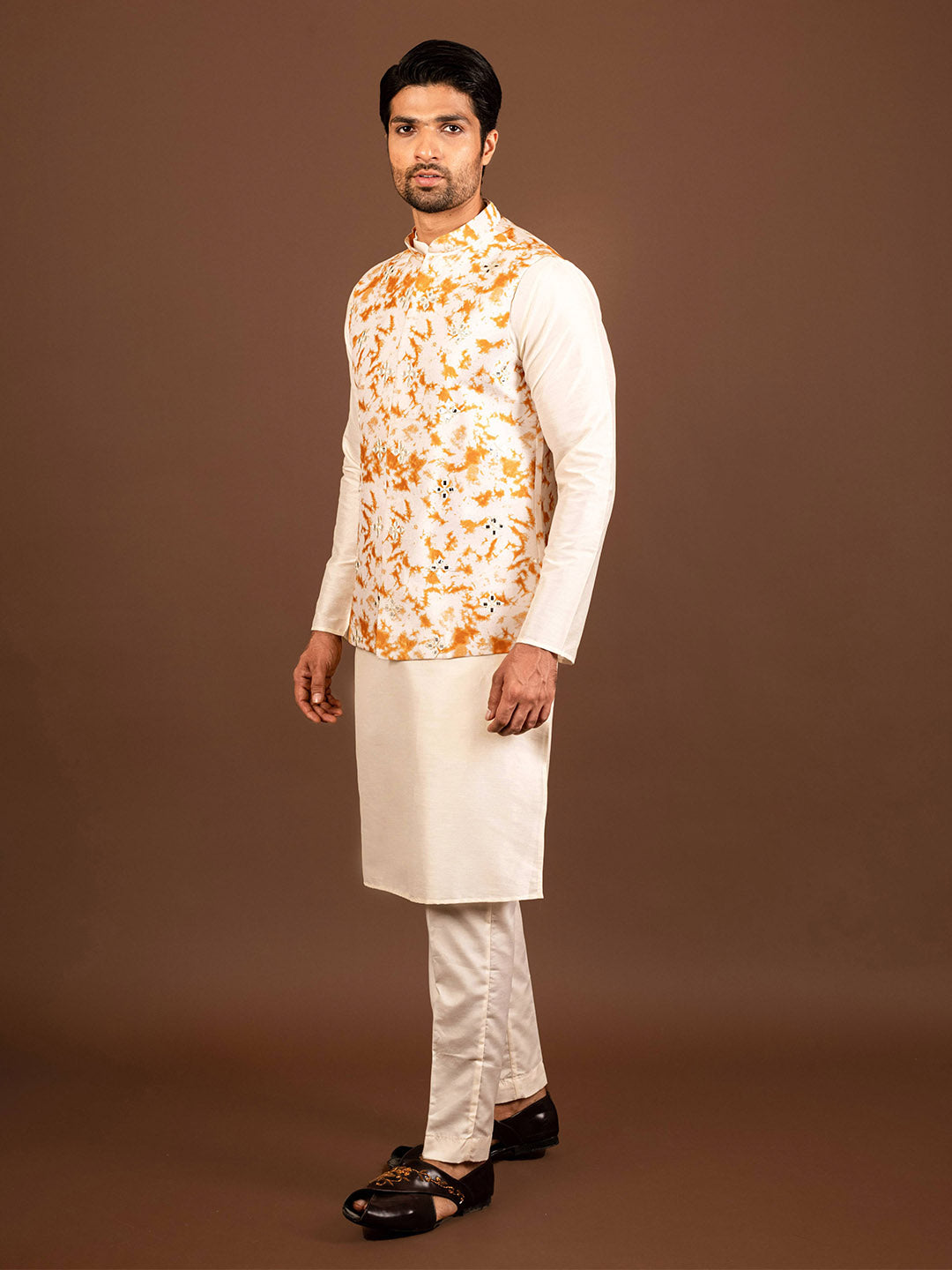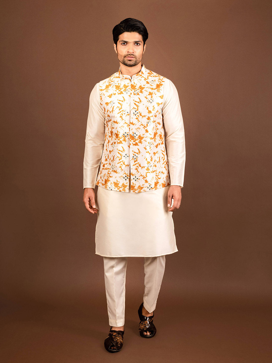 The Kisah Kurta Jacket Trouser Set is ideal for men looking for stylish yet comfortable attire. Crafted from Raw Silk fabric, Mustard color, stylish Embroidered pattern, and comfortable fit make it perfect for festive wear.