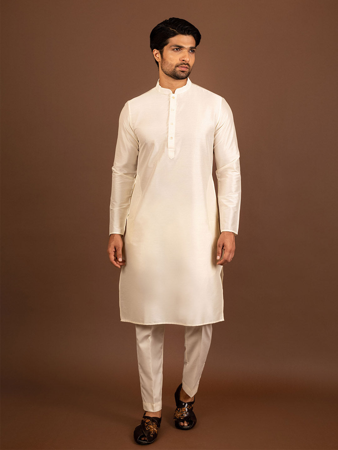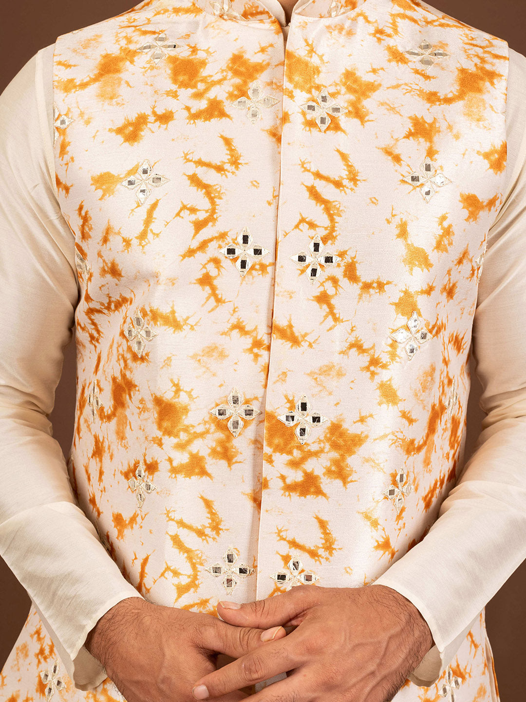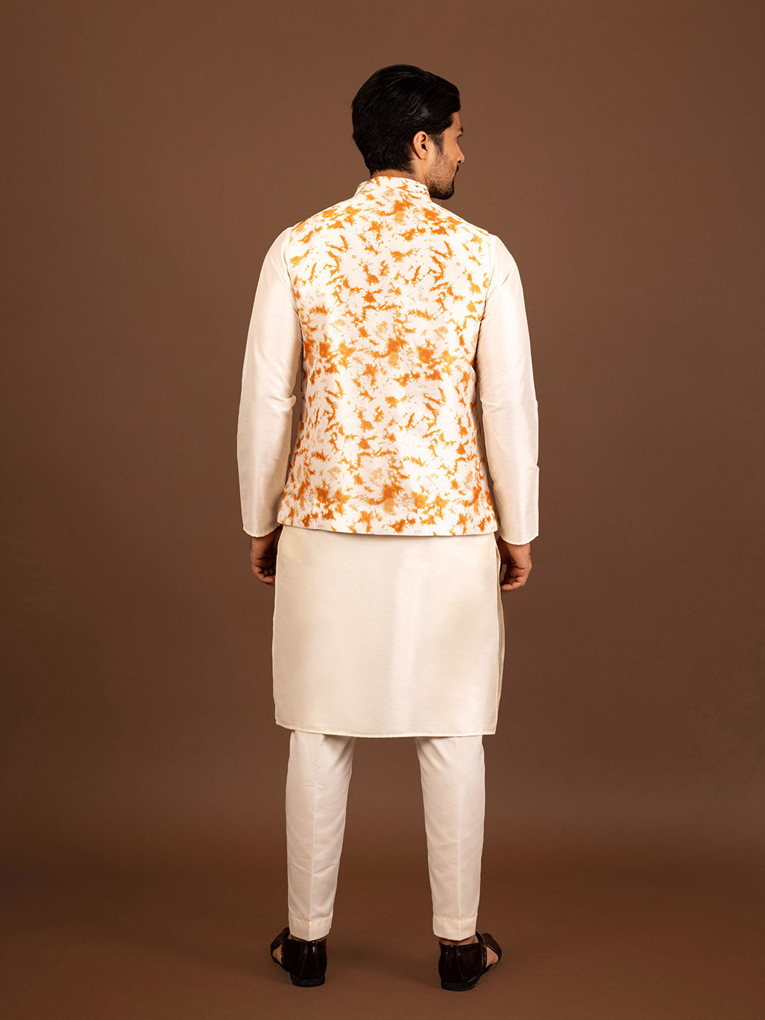 The Kisah Kurta Jacket Trouser Set is ideal for men looking for stylish yet comfortable attire. Crafted from Raw Silk fabric, Mustard color, stylish Embroidered pattern, and comfortable fit make it perfect for festive wear.