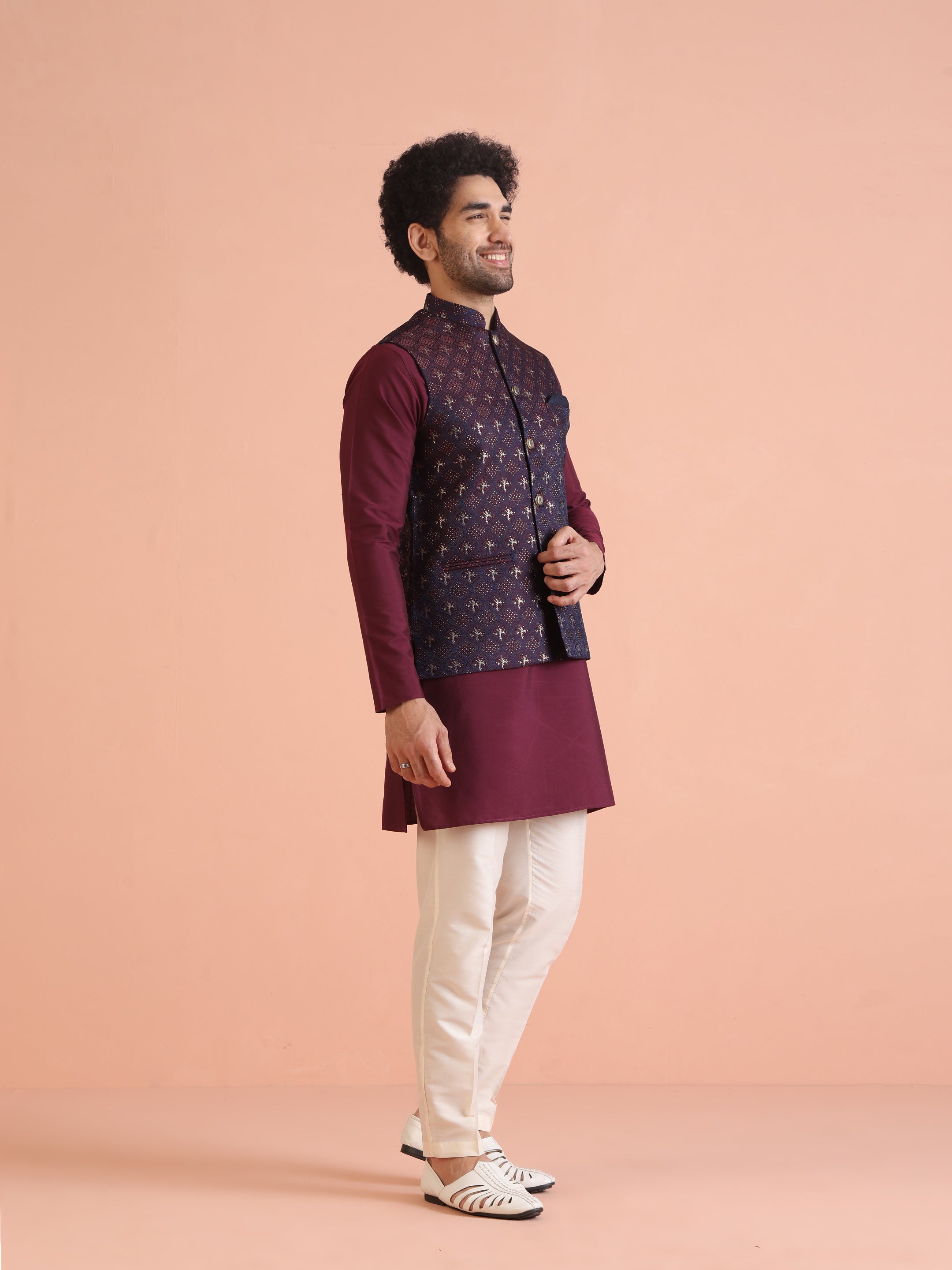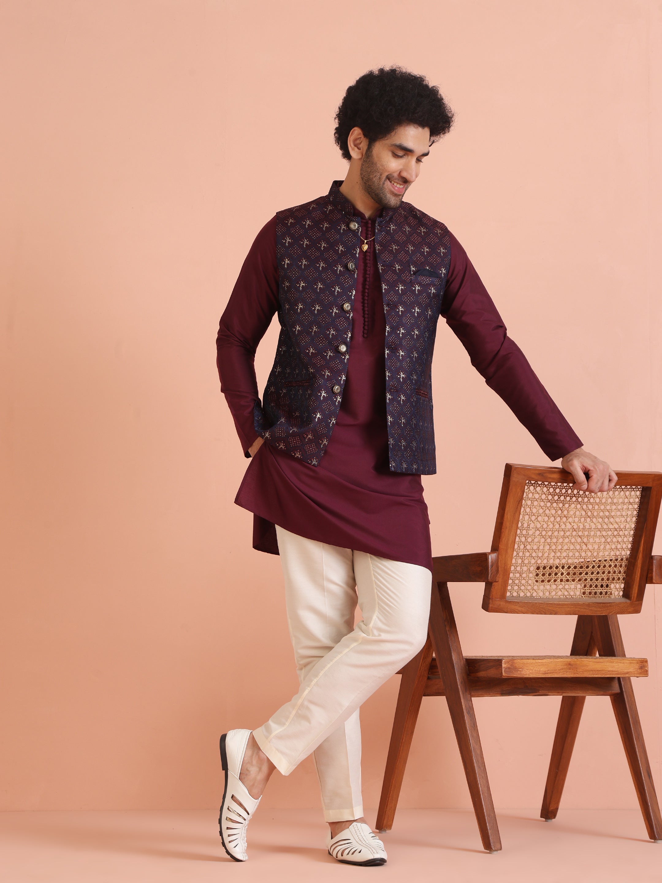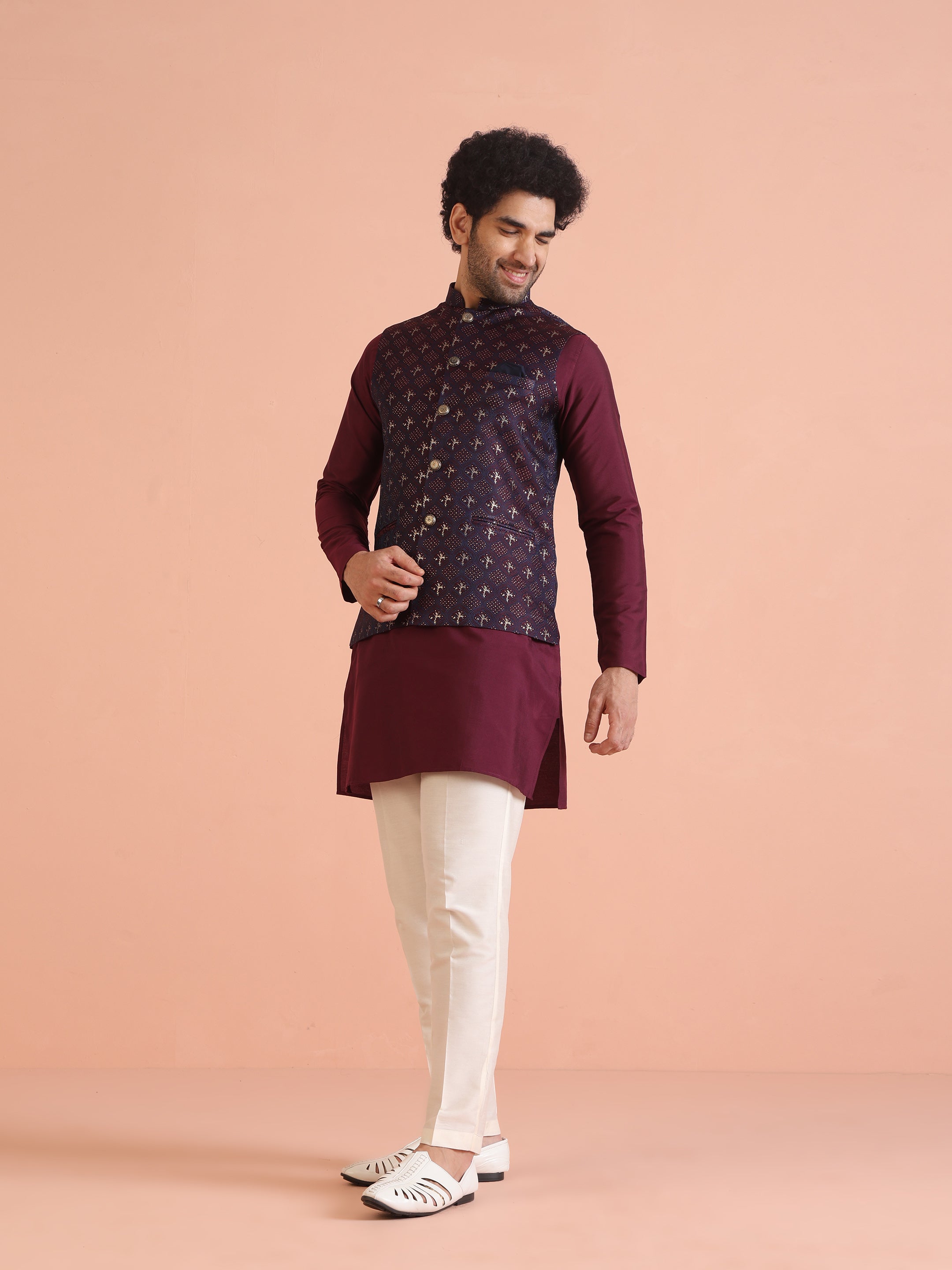 Experience classic elegance with this Kisah Men Grey Jacquard Kurta Jacket Trouser Set. The breathable Silk Blend fabric with Jacquard Patternn ensures comfort throughout the day. Ideal for festive events or casual wear.