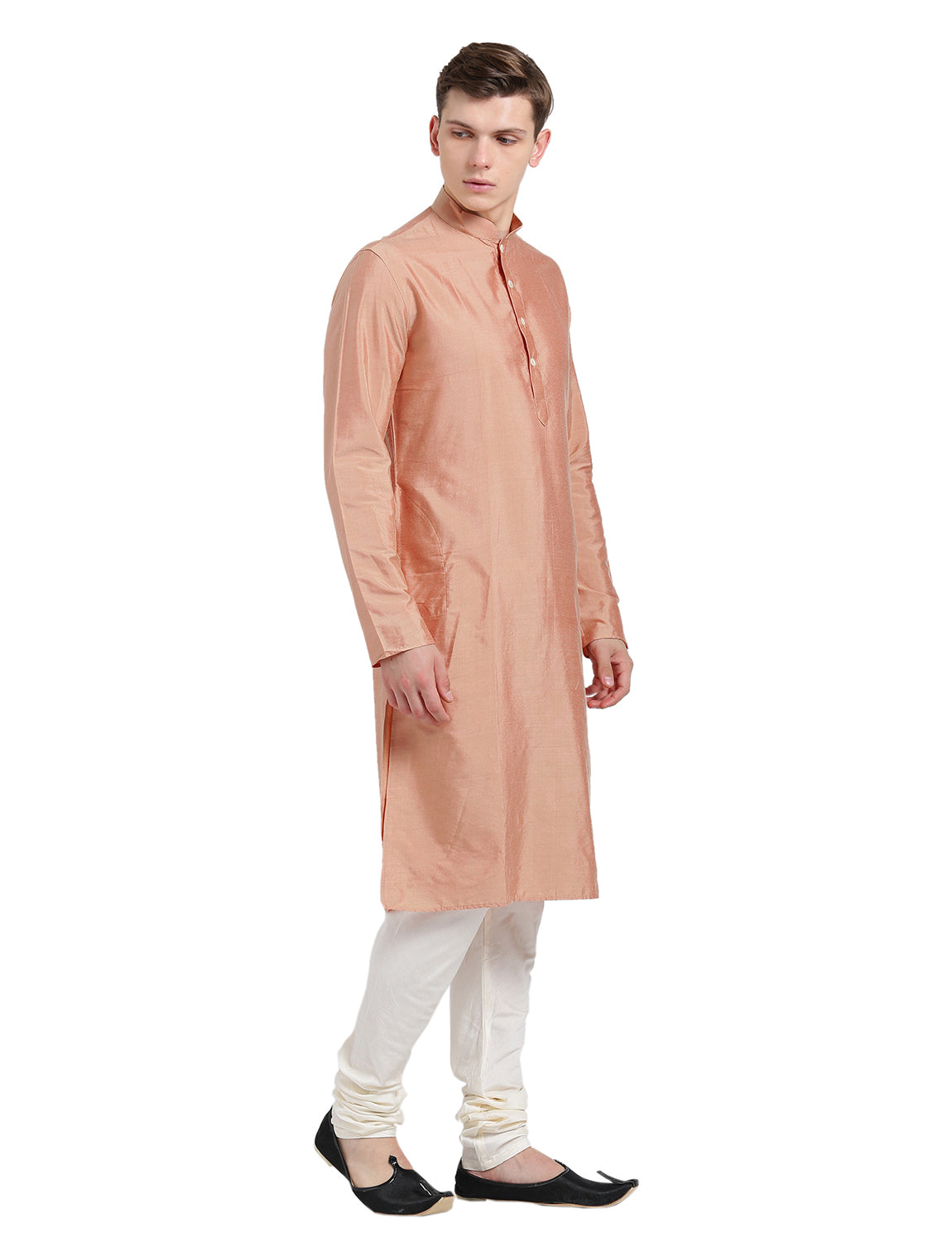 Men Peach Silk Blend Solid Kurta Churidar Set – Elegant Classic Festive Wear