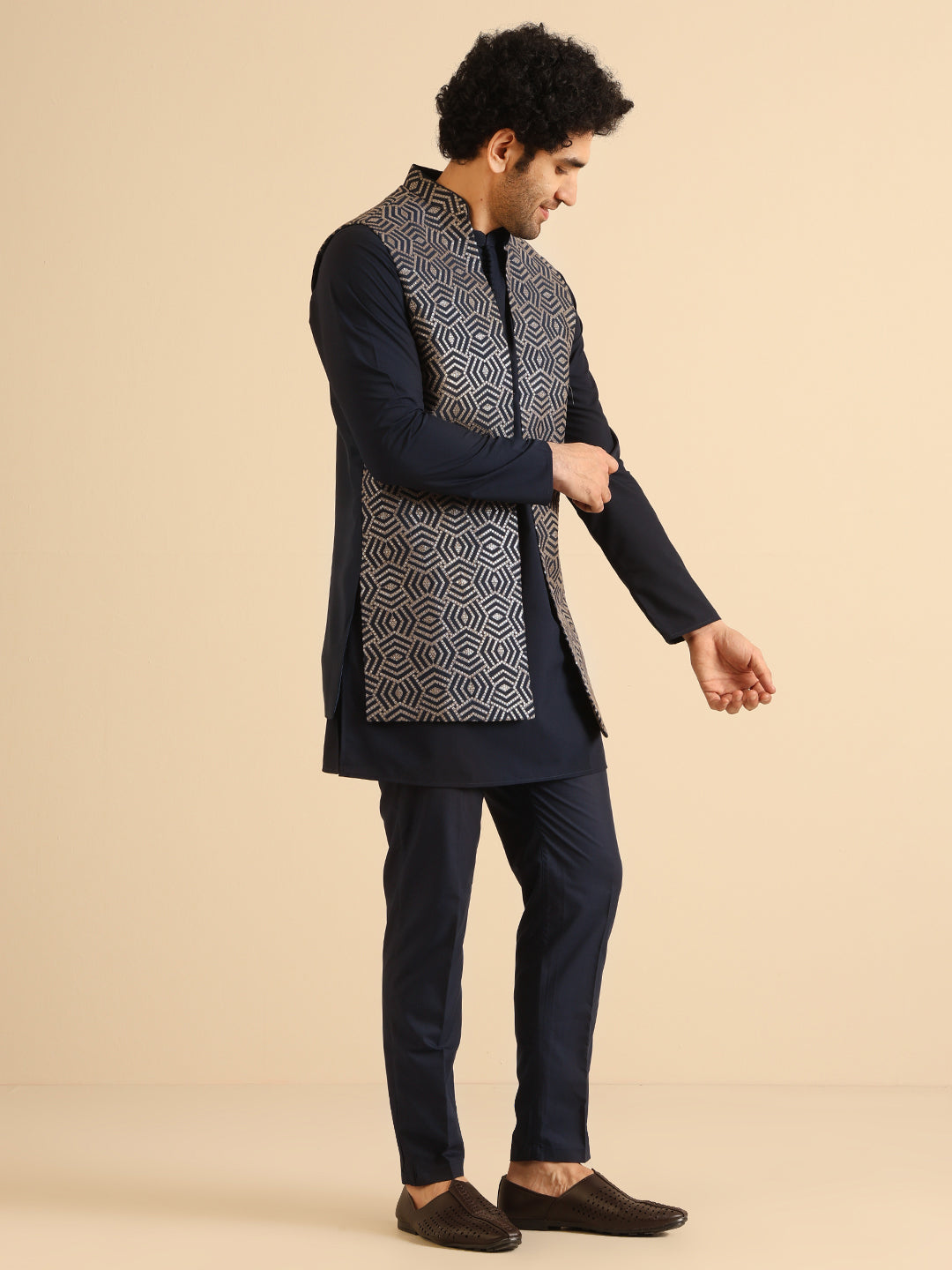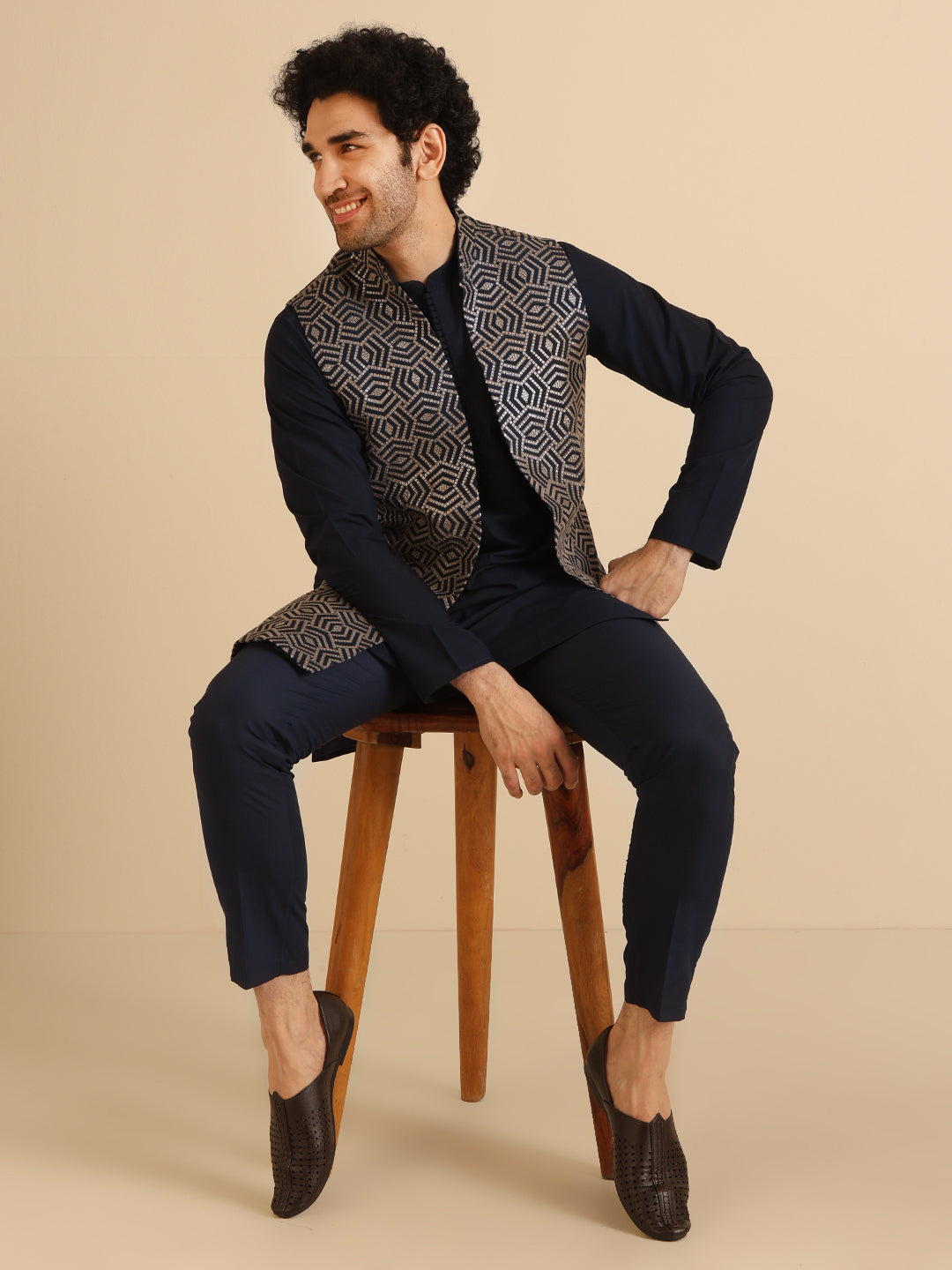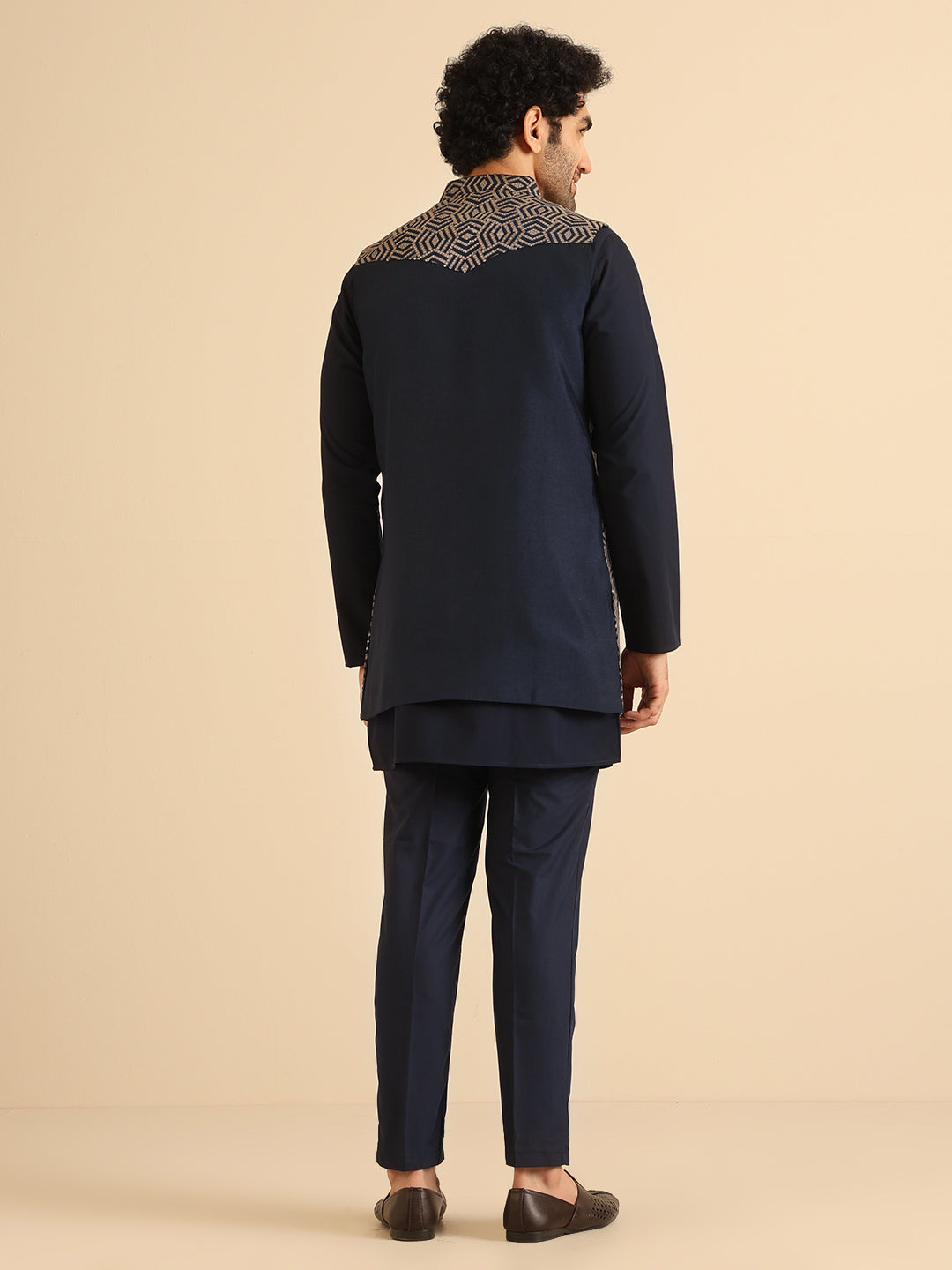This Navy Blue Kurta Jacket Trouser Set is a yes for all your casual occasions. The Jacket is of Cotton Blend which adds on to the defined and modern look. This set to complete your look