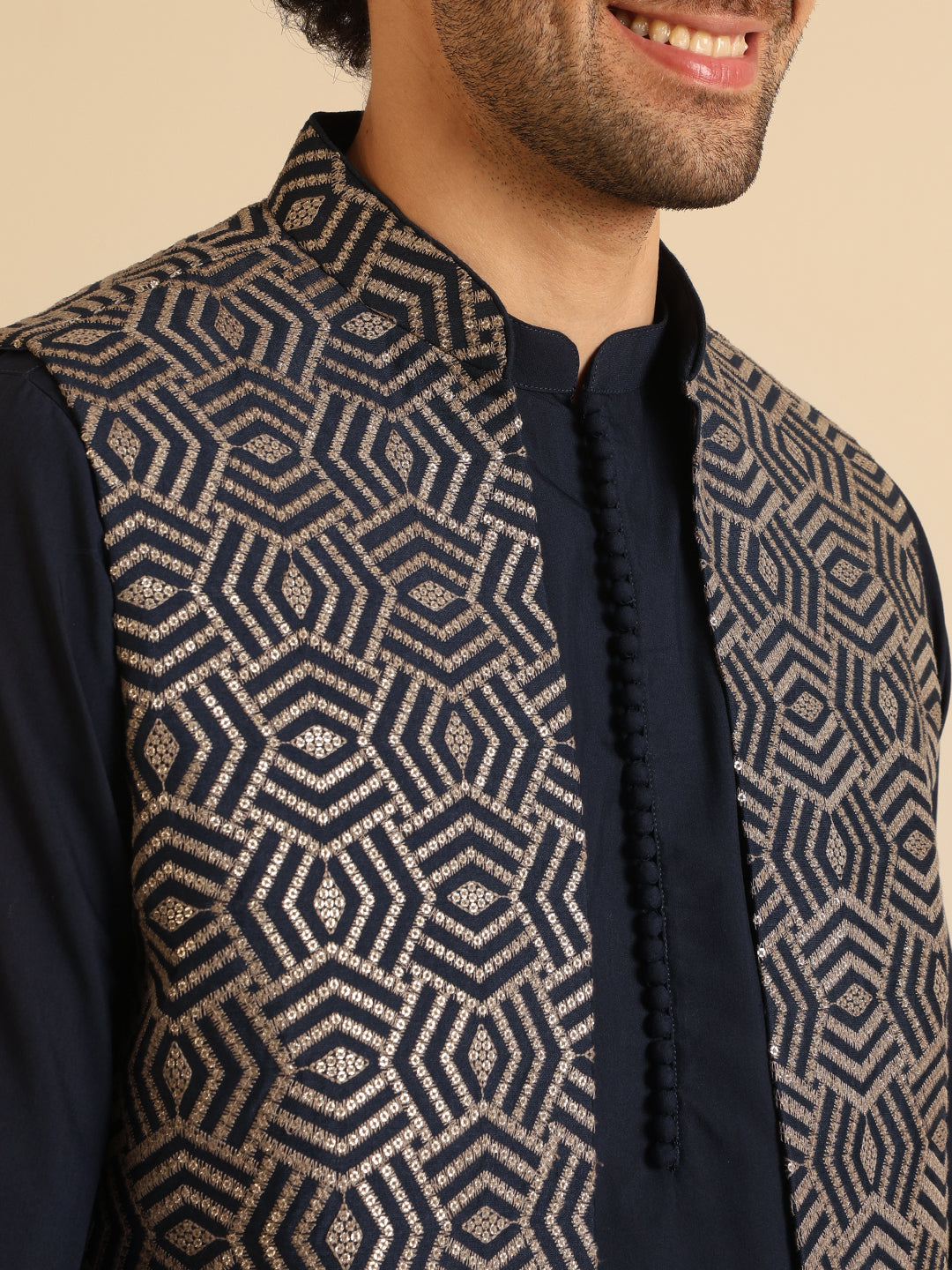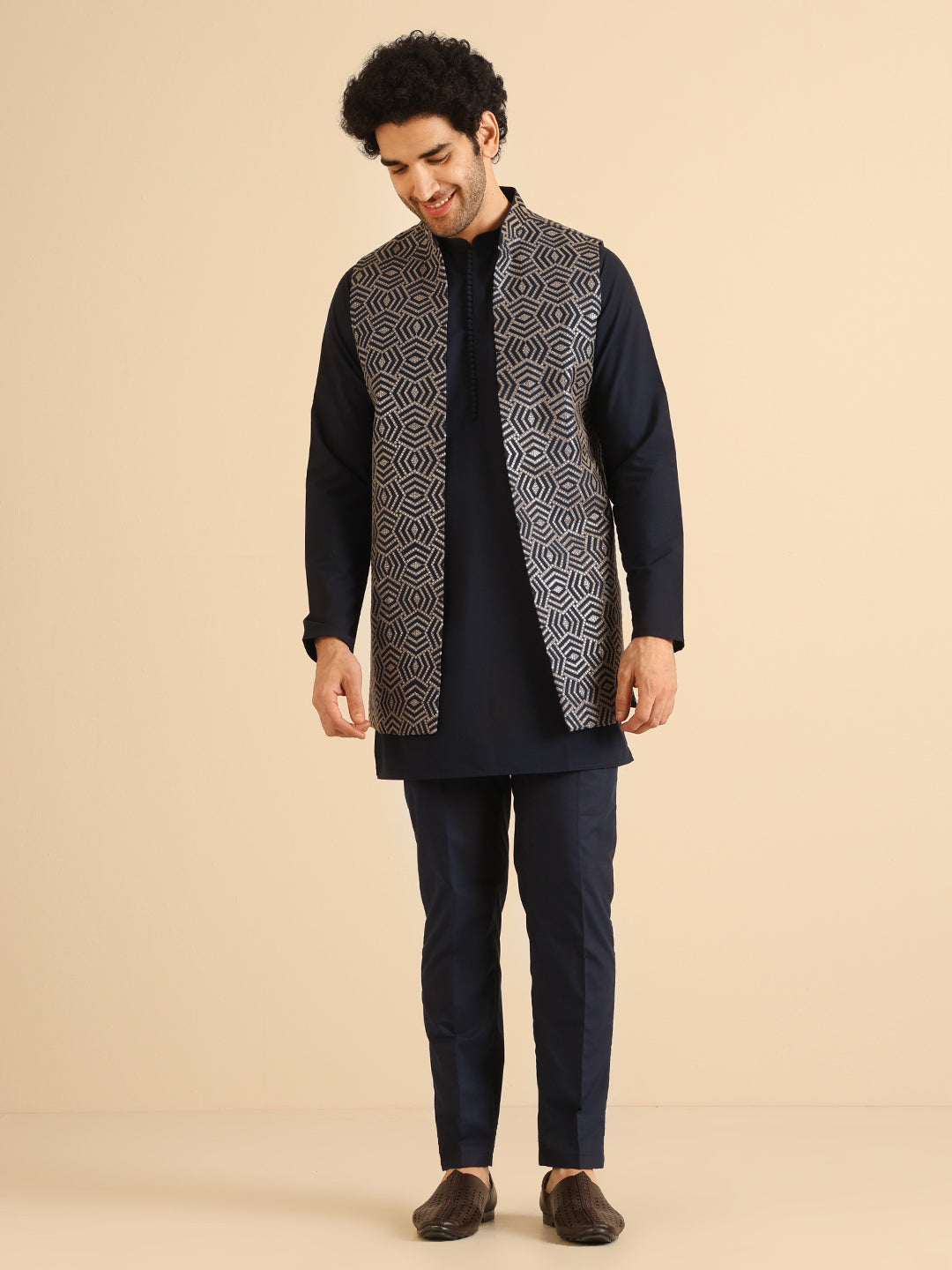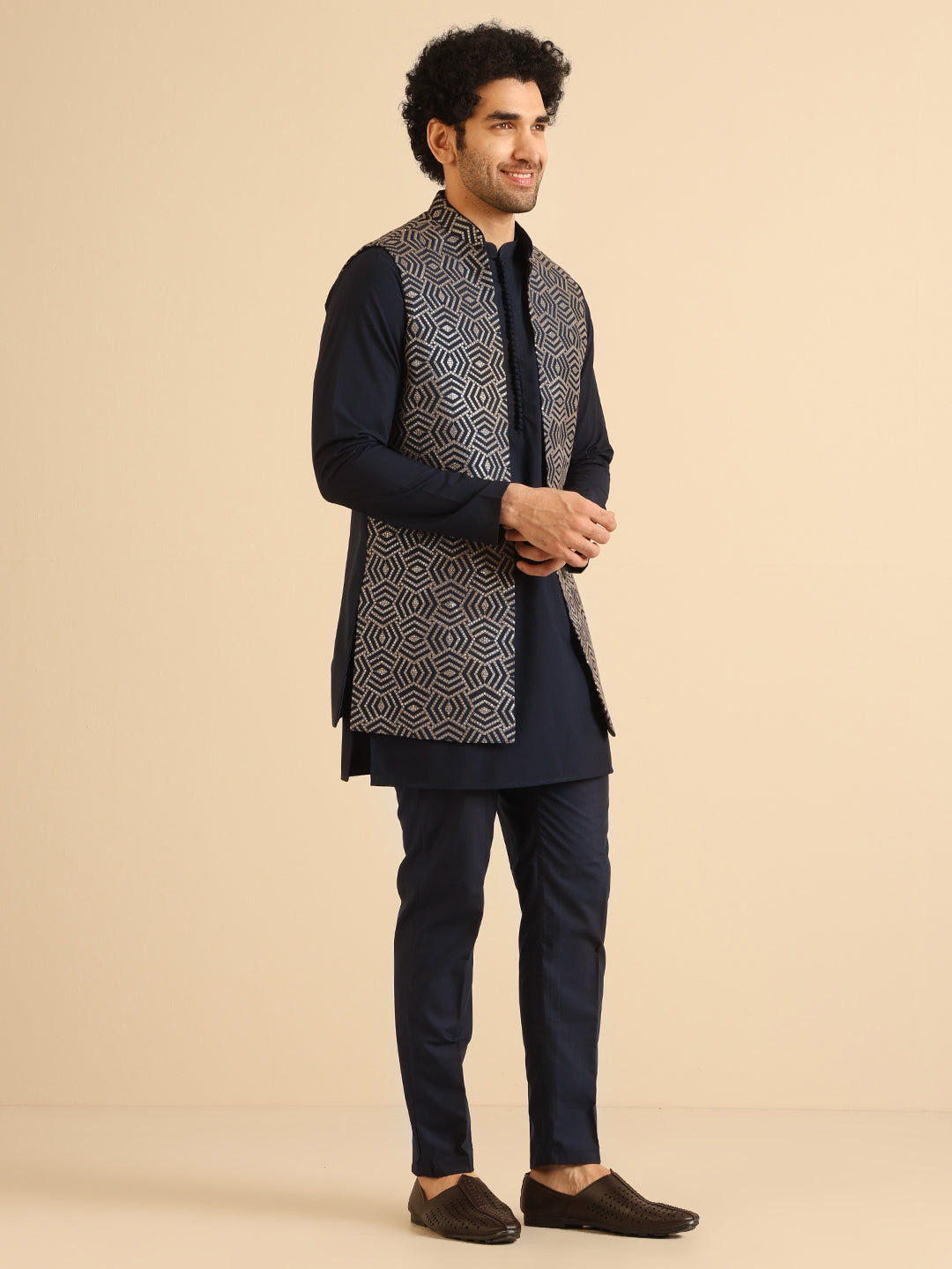 This Navy Blue Kurta Jacket Trouser Set is a yes for all your casual occasions. The Jacket is of Cotton Blend which adds on to the defined and modern look. This set to complete your look