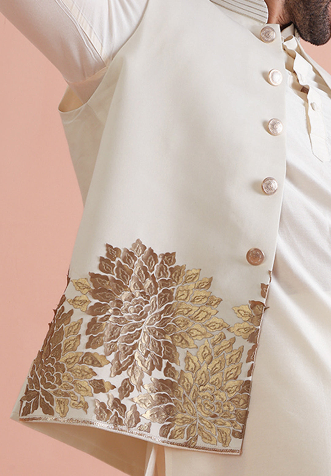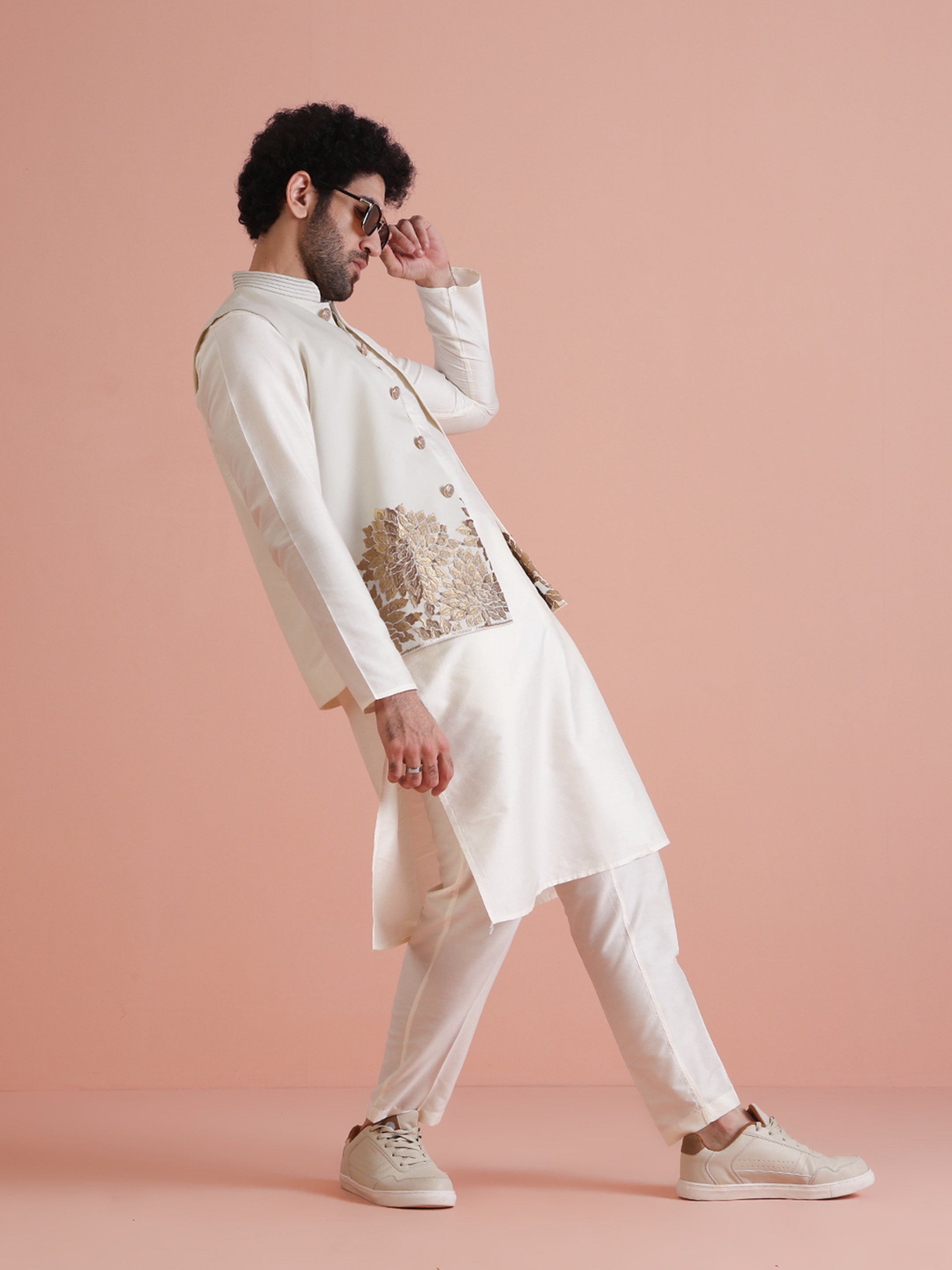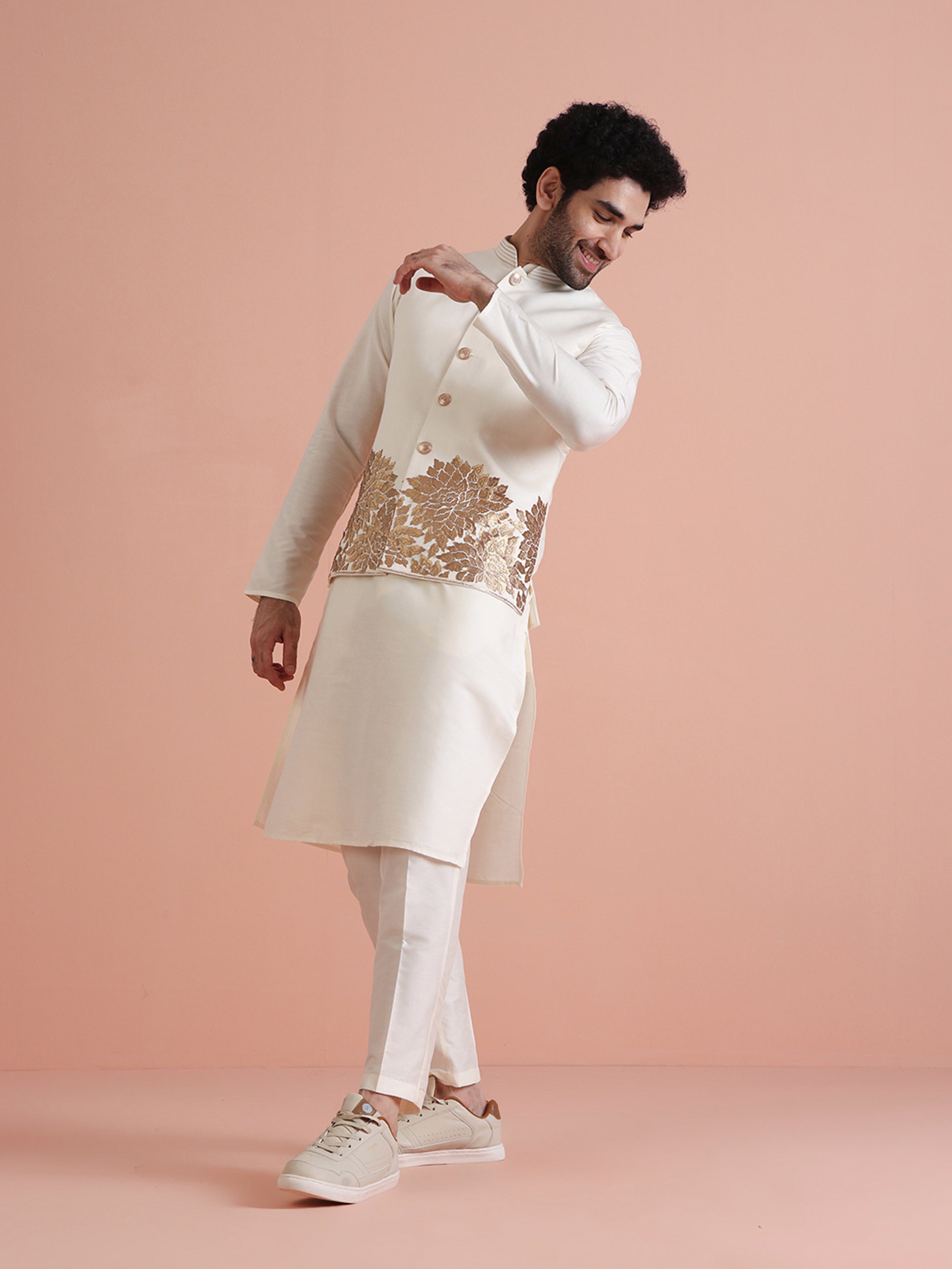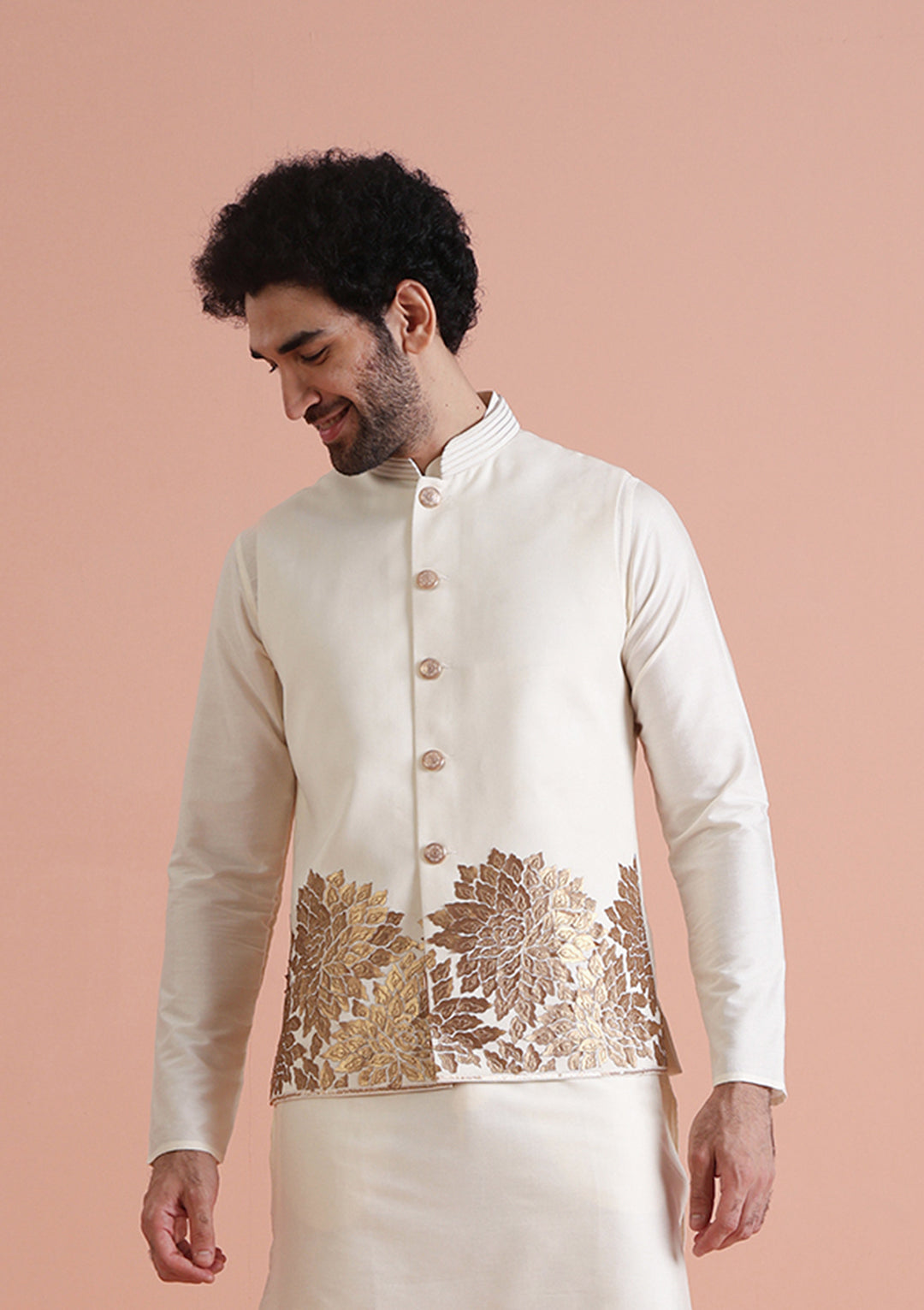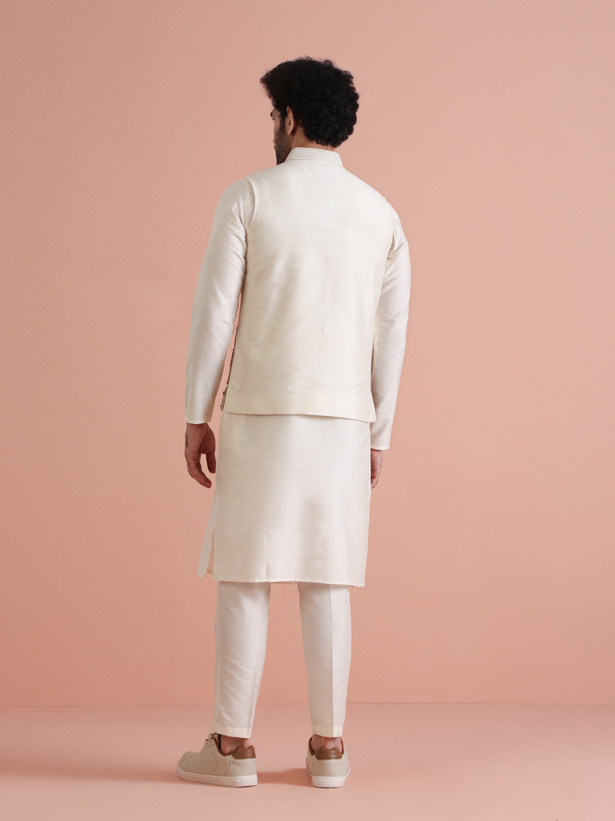 Experience classic elegance with this Men's Off White Color Cotton Blend Nehru Jacket. The Embellished Pattern adds a refined touch, while the breathable fabric ensures comfort throughout the day. Ideal for festive events or casual wear, this Nehru Jacket is a wardrobe essential.