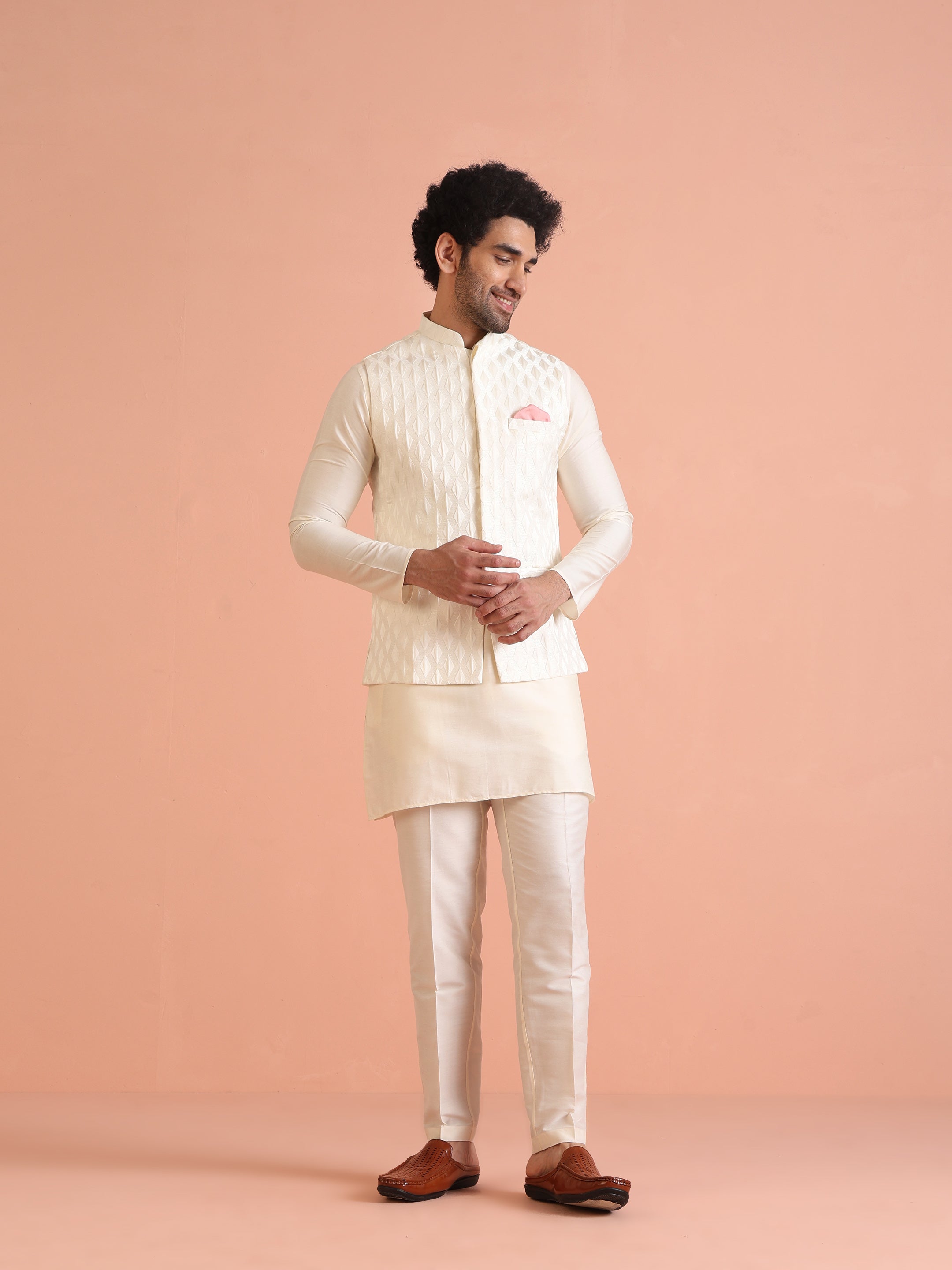Cream Silk Blend Textured Nehru Jacket Kurta Set