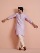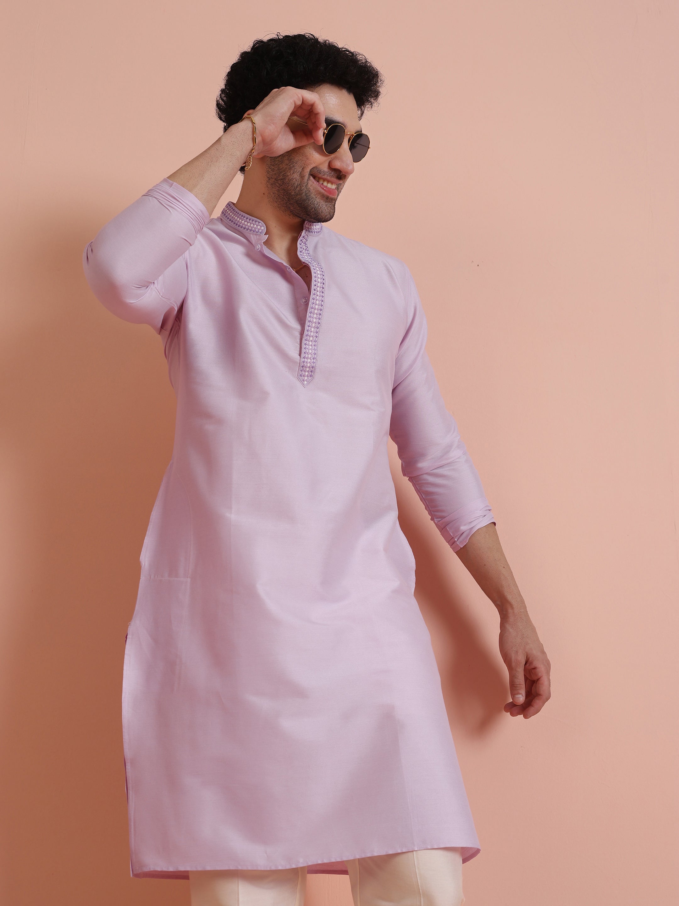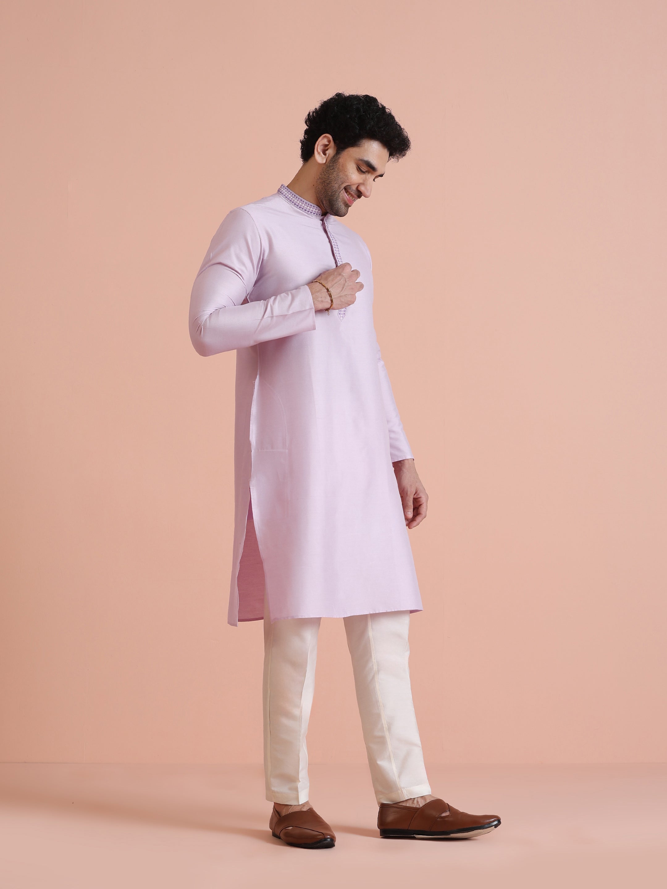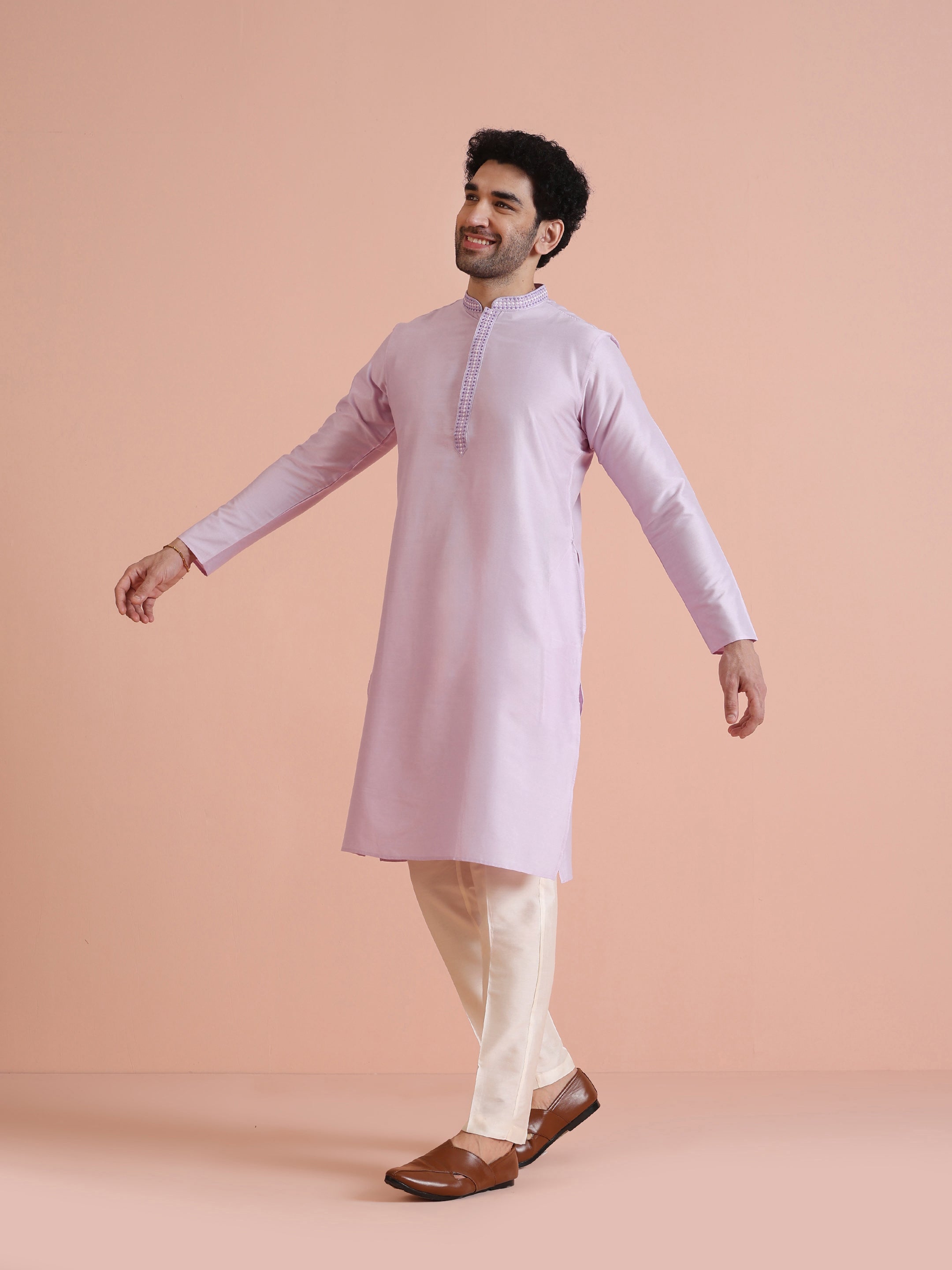 This Kurta Set with Lavender Color is an elegant mandarin collar style that is perfect for occasional wear. With a full sleeve Embroidered design and comfortable fabric, it will make you look stylish.