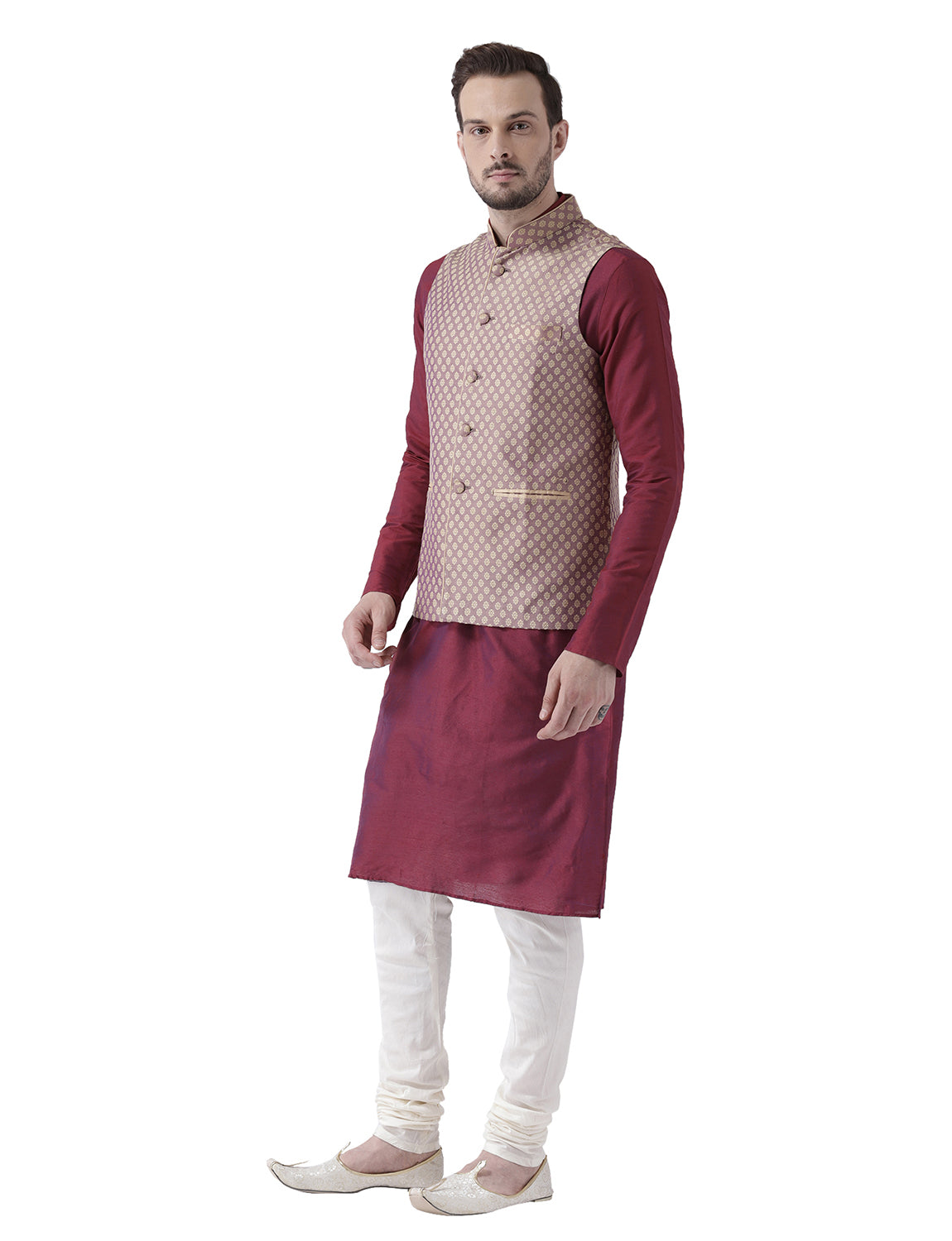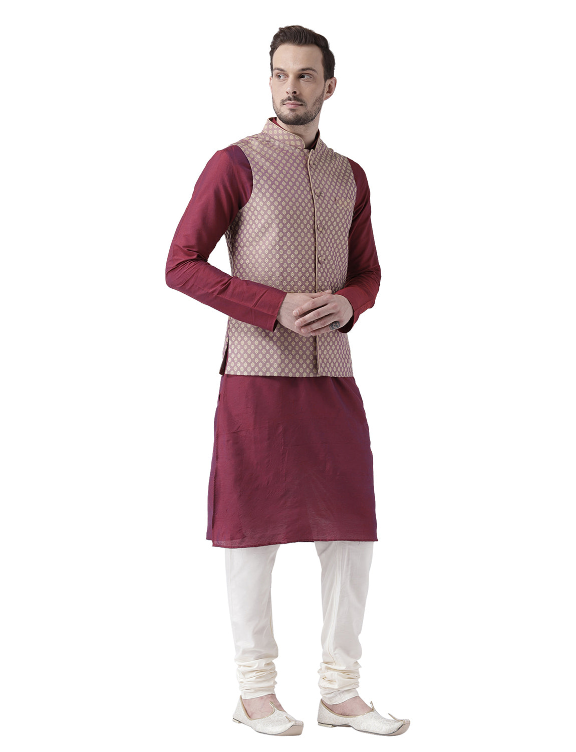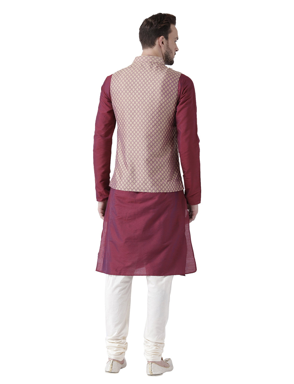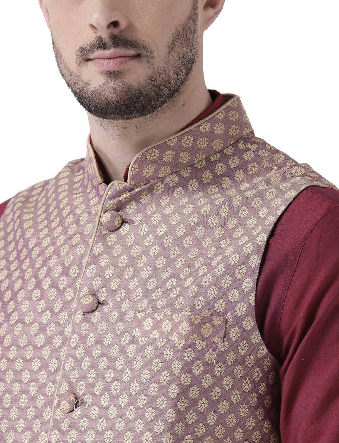 This Kurta Jacket Set with Mauve Color is an elegant mandarin collar style that is perfect for occasional wear. With a full sleeve Jacquard Pattern and comfortable Silk Blend fabric, it will make you look stylish.
