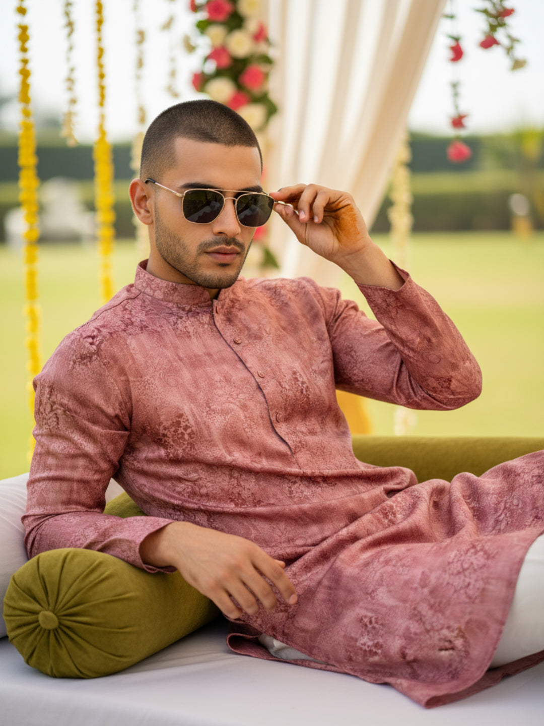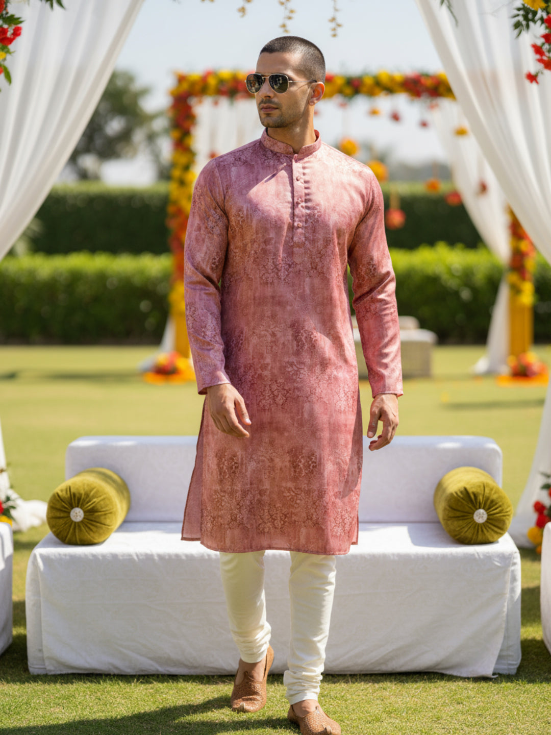 This Kurta Set with Pink Color is an elegant mandarin collar style that is perfect for occasional wear. With a full sleeve Floral design and comfortable fabric, it will make you look stylish.