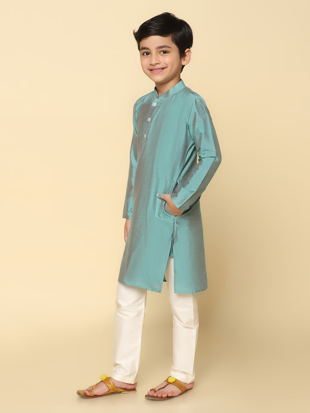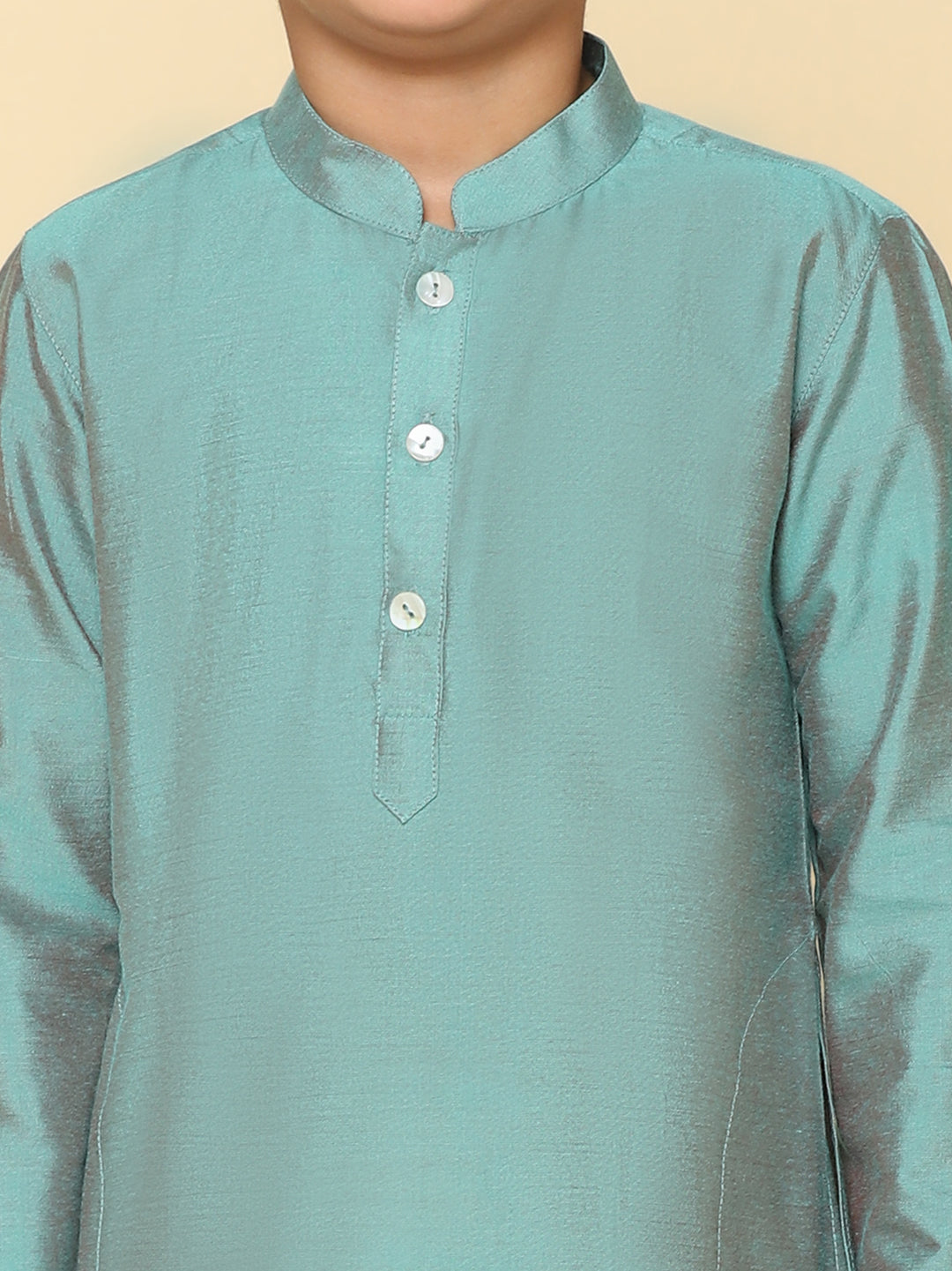 This Kurta is just perfect for festivals, or any kind off occasions. Its mandarin collar, style gives a charming look, this classic design is made from Cotton Blend fabric with Solid Dyed patterns and comes in Green colours. Perfect for any occasion.