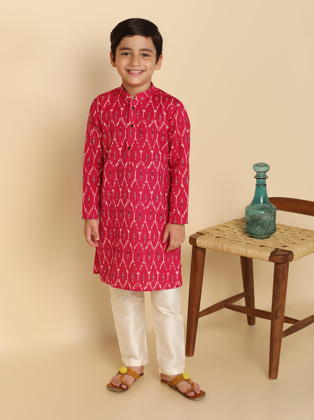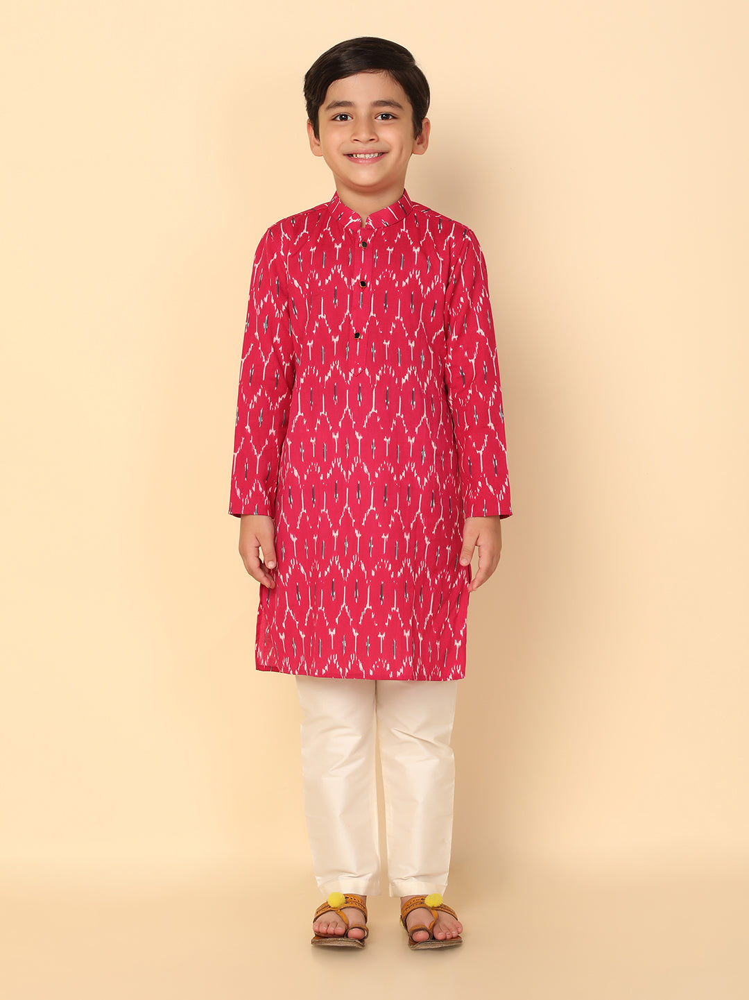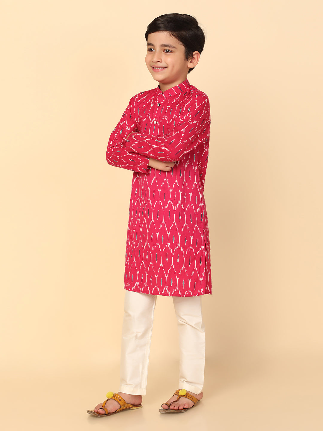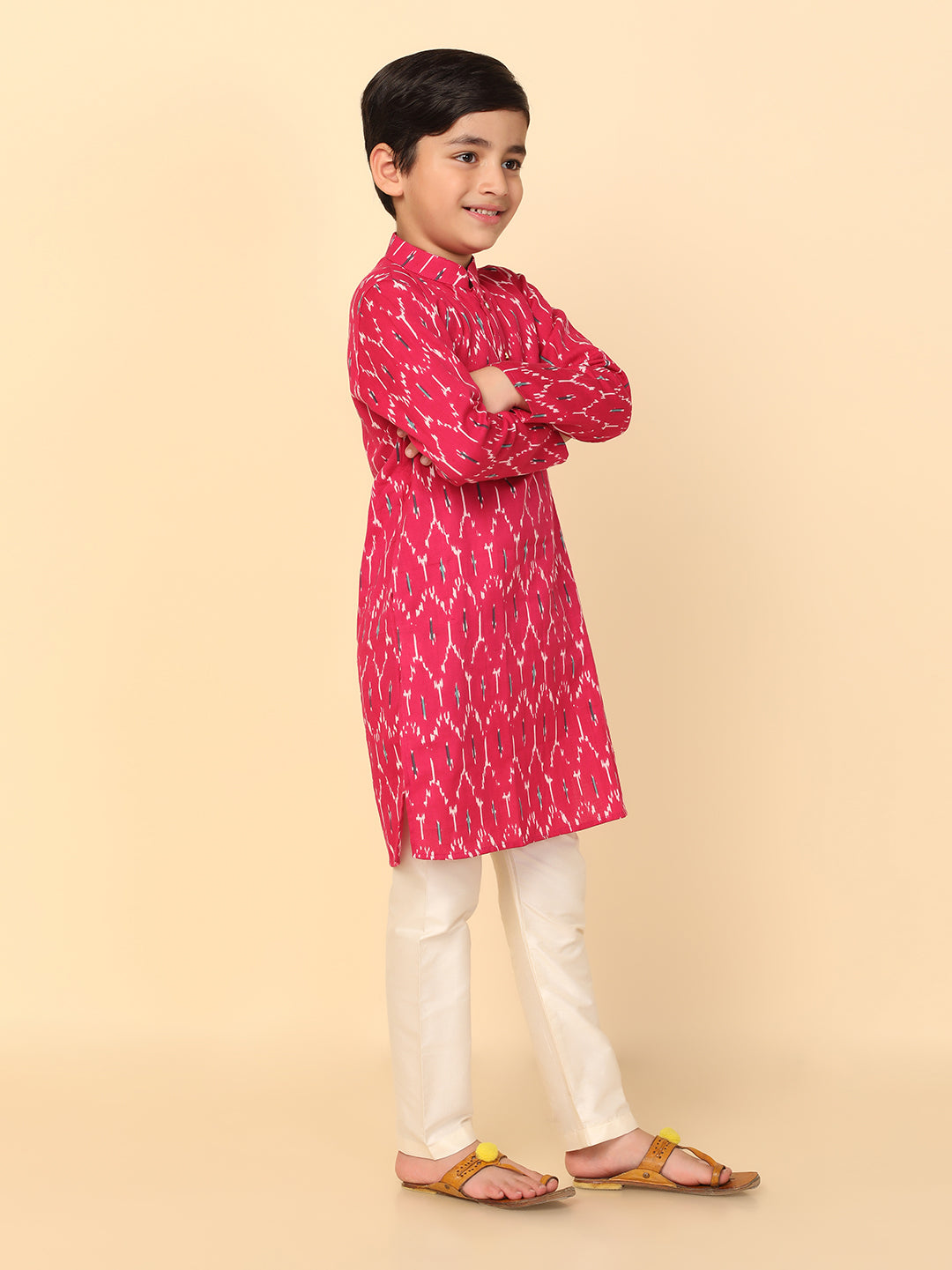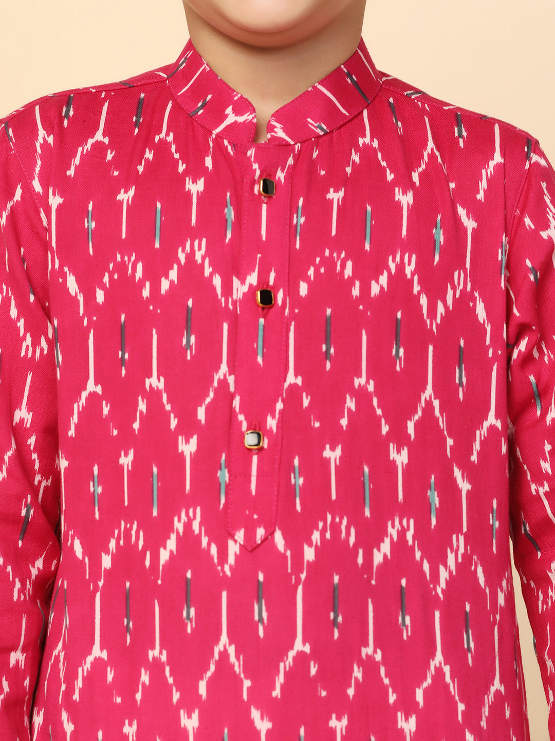 This Kurta Set is just perfect for festivals, or any kind off occasions. Its mandarin collar, style gives a charming look, this classic design is made from Cotton Blend fabric with Printed patterns and comes in Pink colours. Perfect for any occasion.