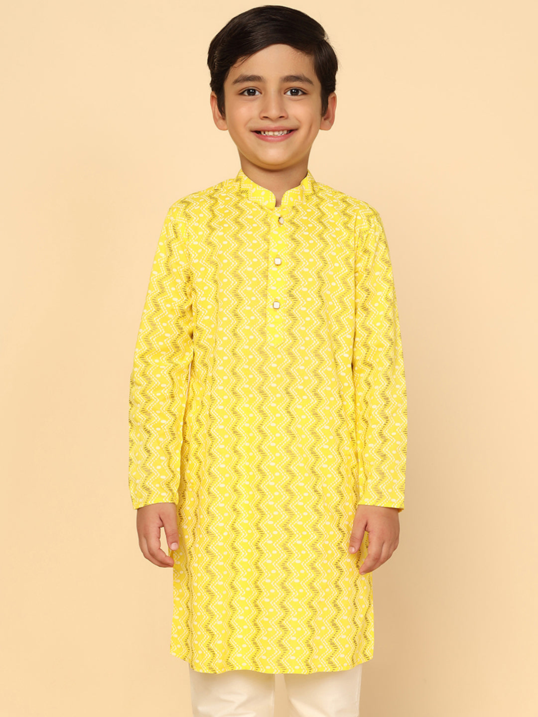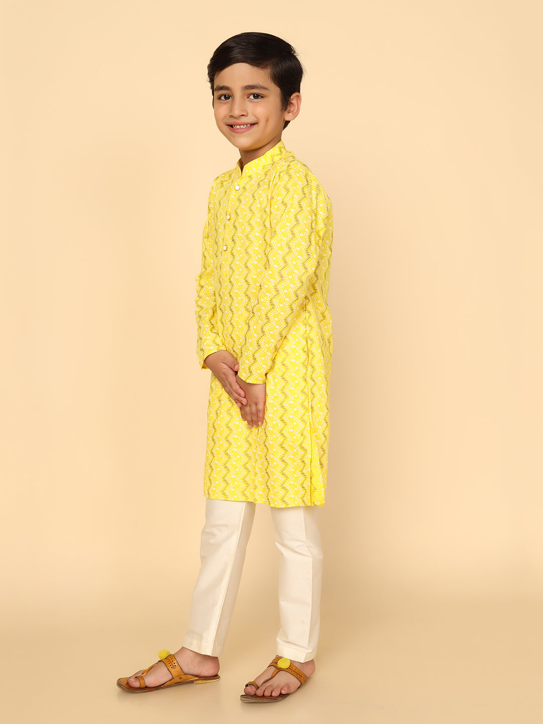 This Kurta is just perfect for festivals, or any kind off occasions. Its mandarin collar, style gives a charming look, this classic design is made from Cotton Blend fabric with Printed patterns and comes in Yellow colours. Perfect for any occasion.