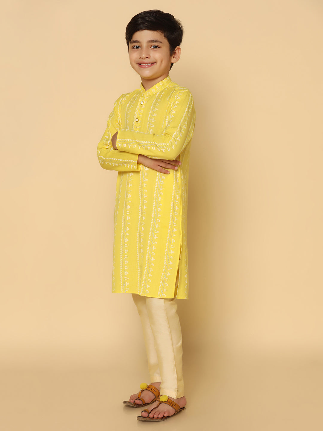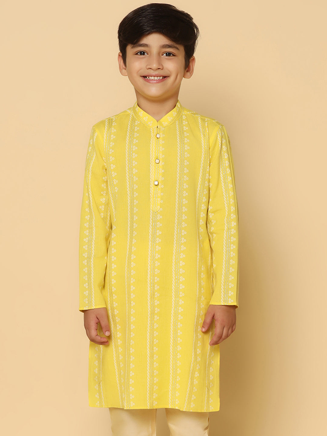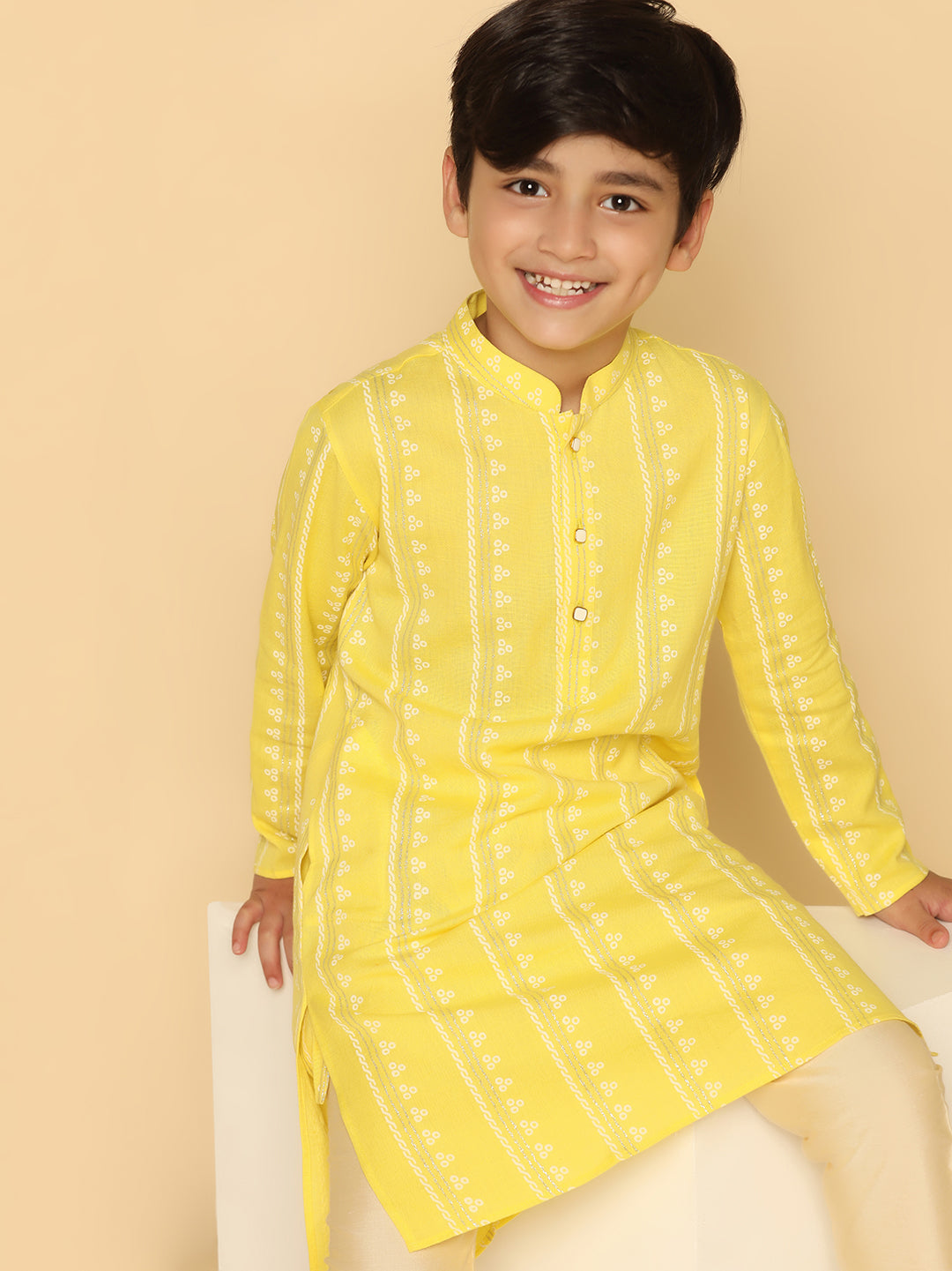This Kurta is just perfect for festivals, or any kind off occasions. Its mandarin collar, style gives a charming look, this classic design is made from Cotton Blend fabric with Printed patterns and comes in Yellow colours. Perfect for any occasion.