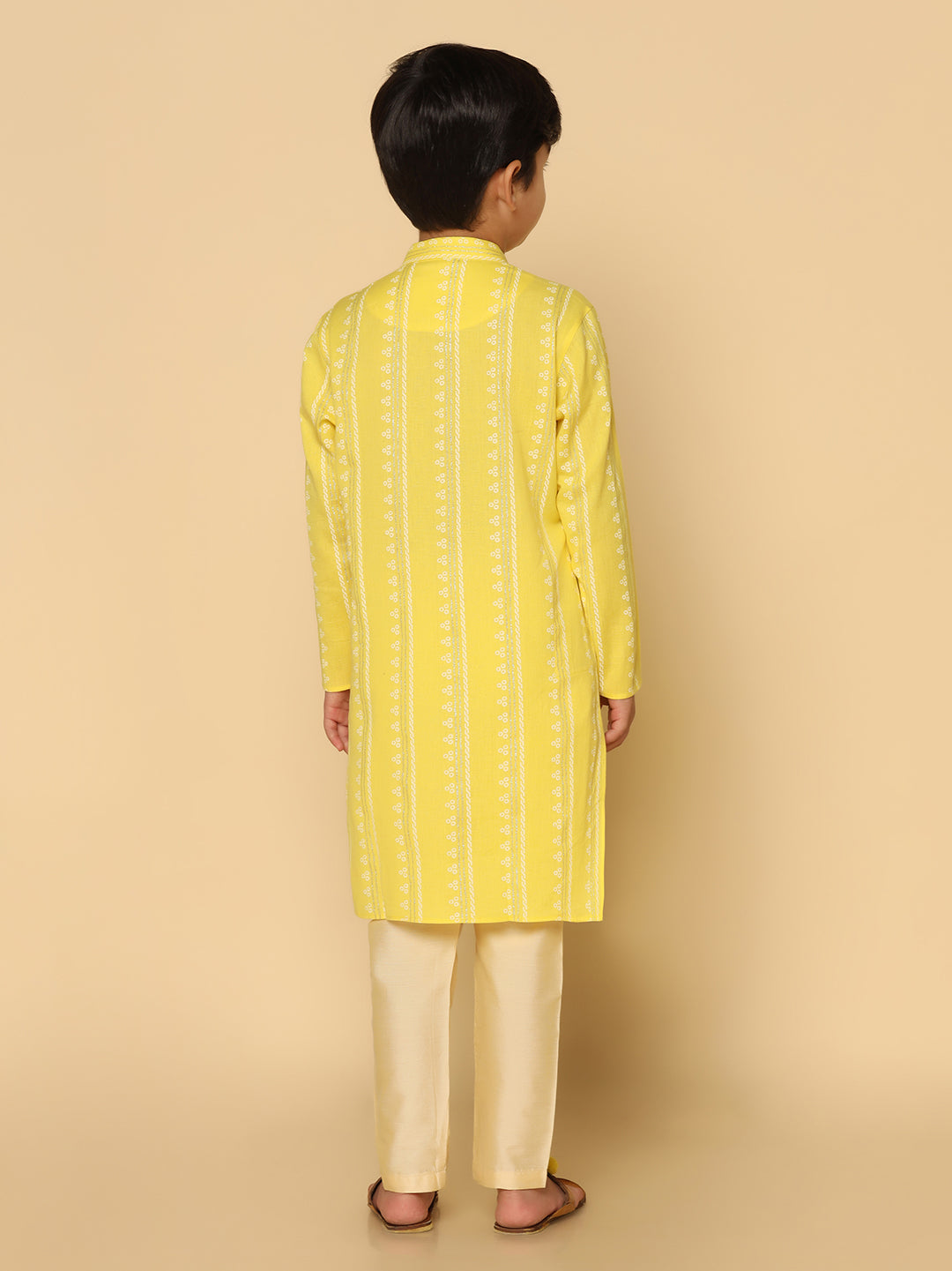 This Kurta Set is just perfect for festivals, or any kind off occasions. Its mandarin collar, style gives a charming look, this classic design is made from Cotton Blend fabric with Printed patterns and comes in Yellow colours. Perfect for any occasion.