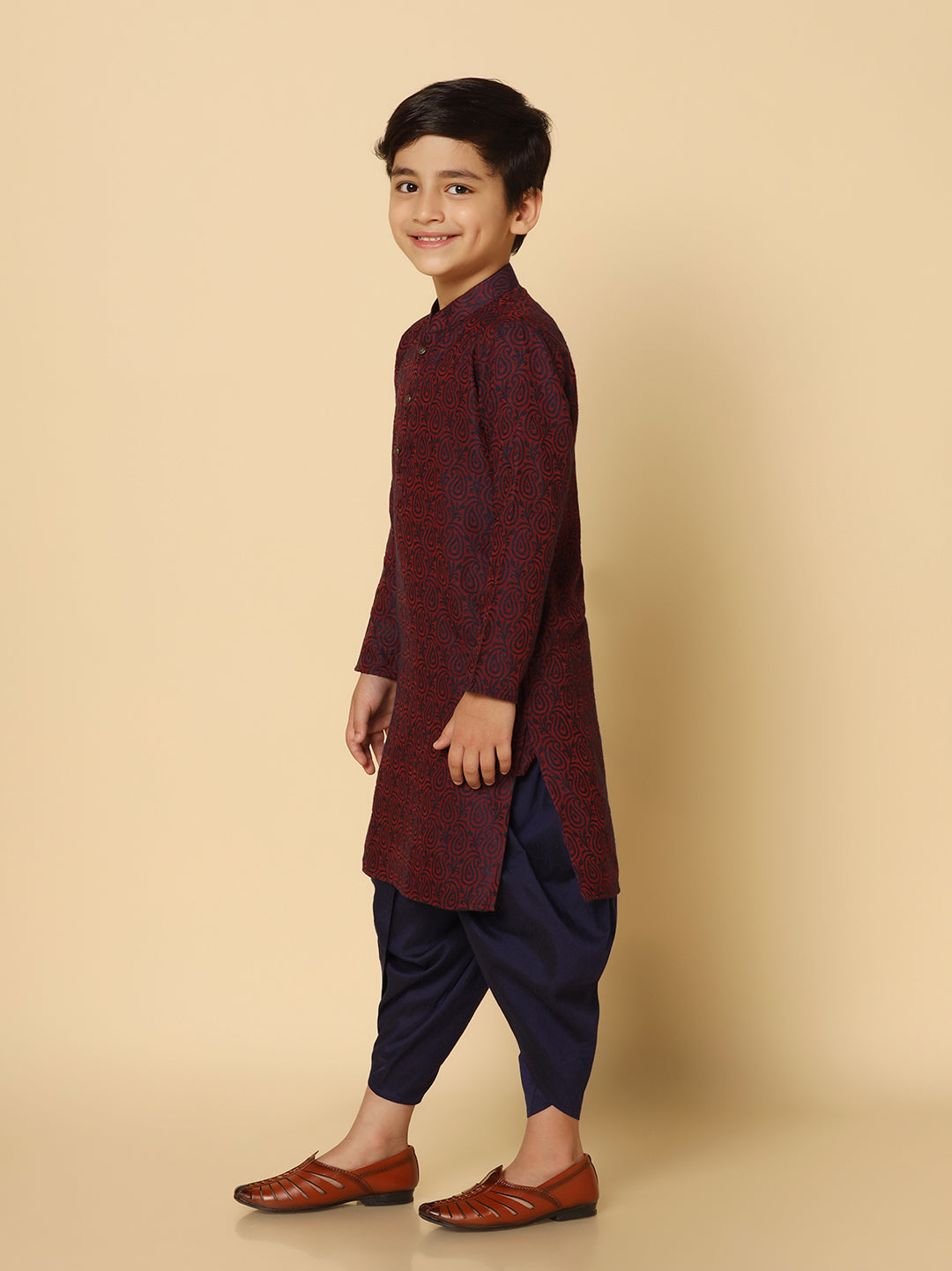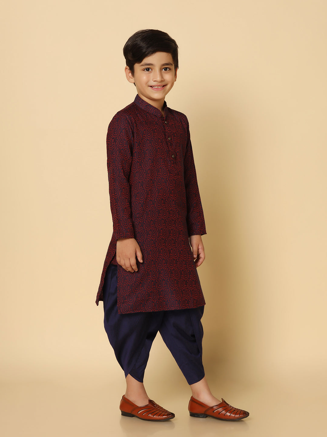The Kisah kurta Set is ideal for Kids Boy looking for stylish yet comfortable attire. Crafted from fabric, Purple color, stylish pattern, and comfortable fit make it perfect for festive wear.