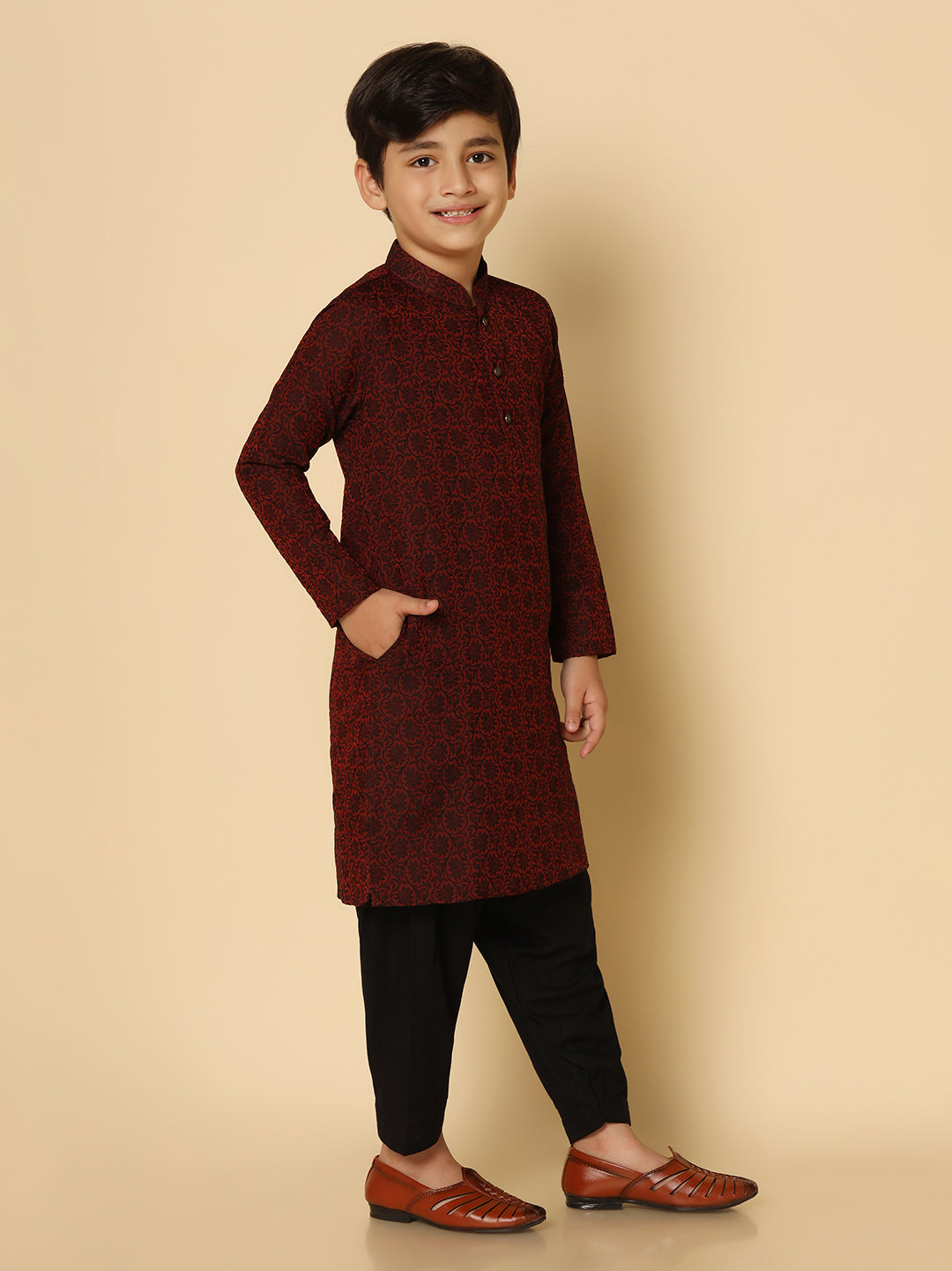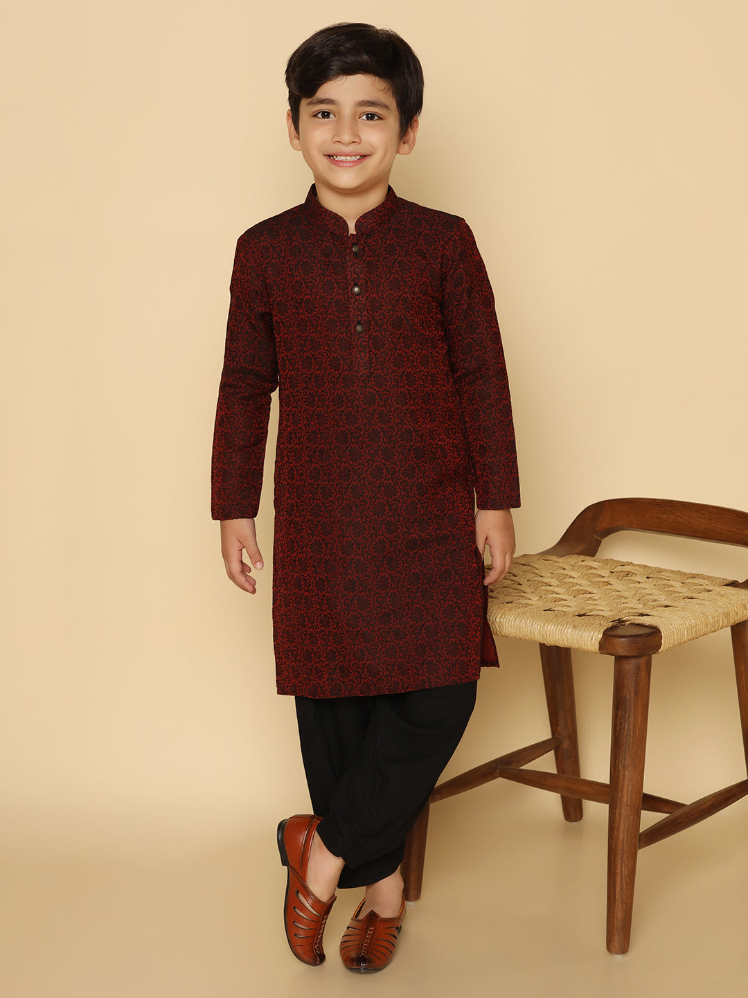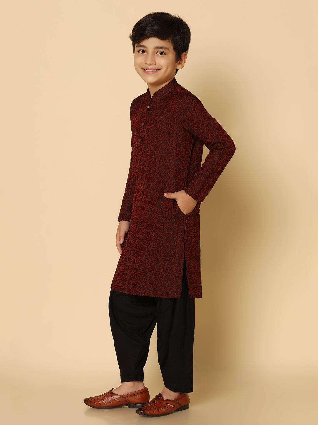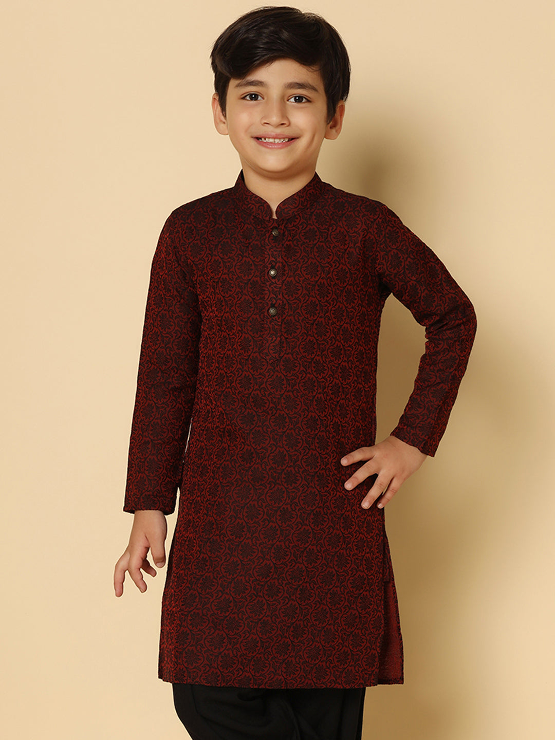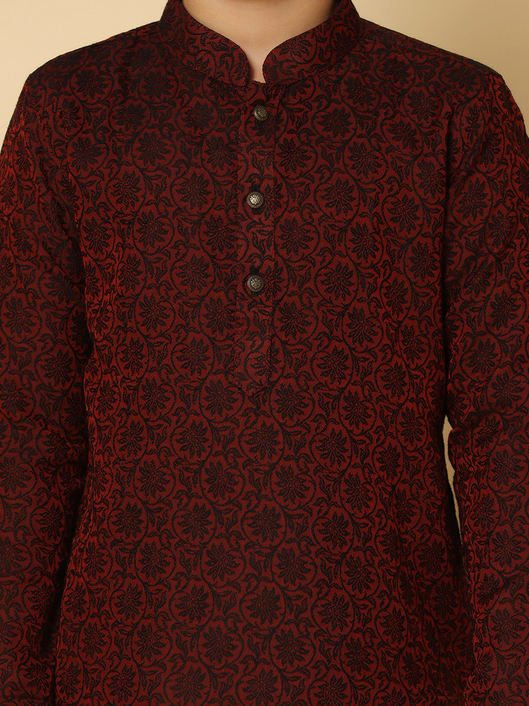 This Kurta is just perfect for festivals, or any kind off occasions. Its mandarin collar, style gives a charming look, this classic design is made from Silk Blend fabric with Jacquard patterns and comes in Maroon colours. Perfect for any occasion.