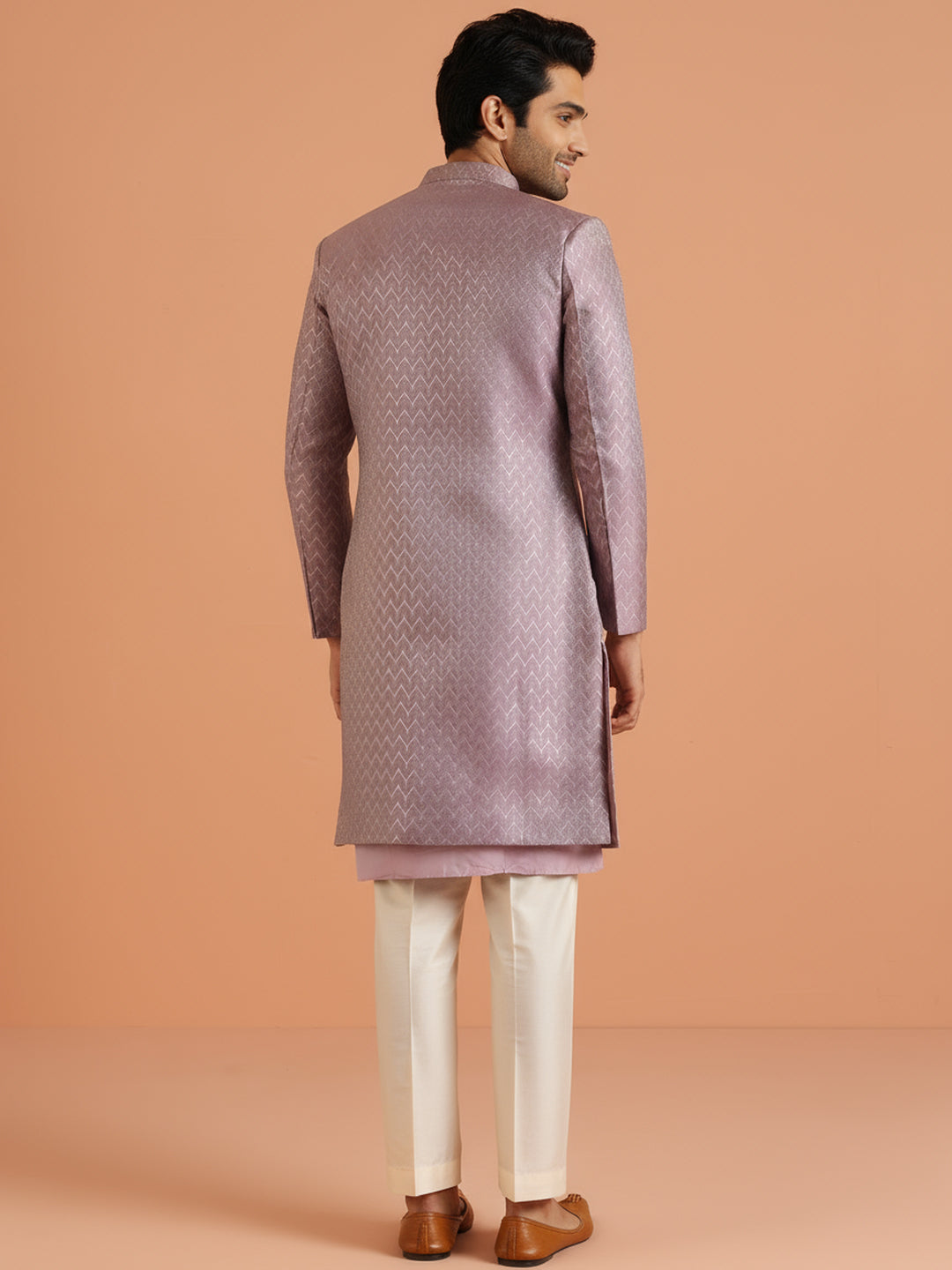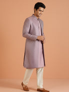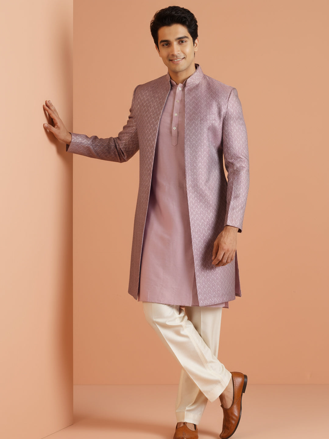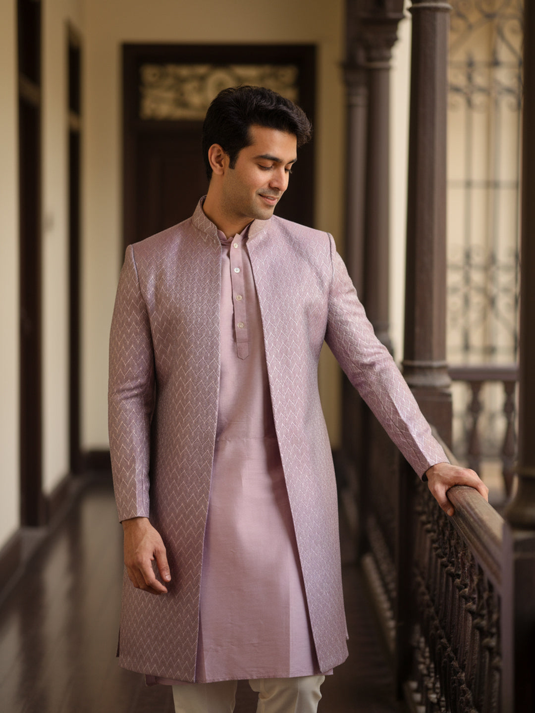 Lilac silk blend sherwani trouser set with wide-leg pants stylish front-open festive wear for weddings and celebrations by Kisah.