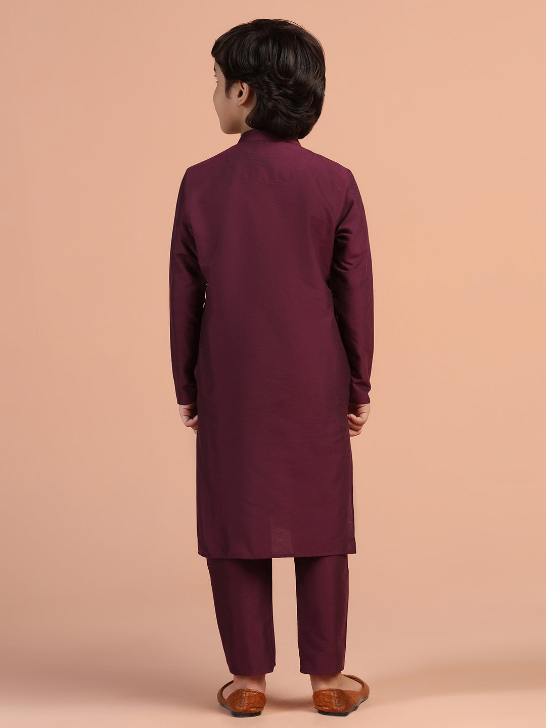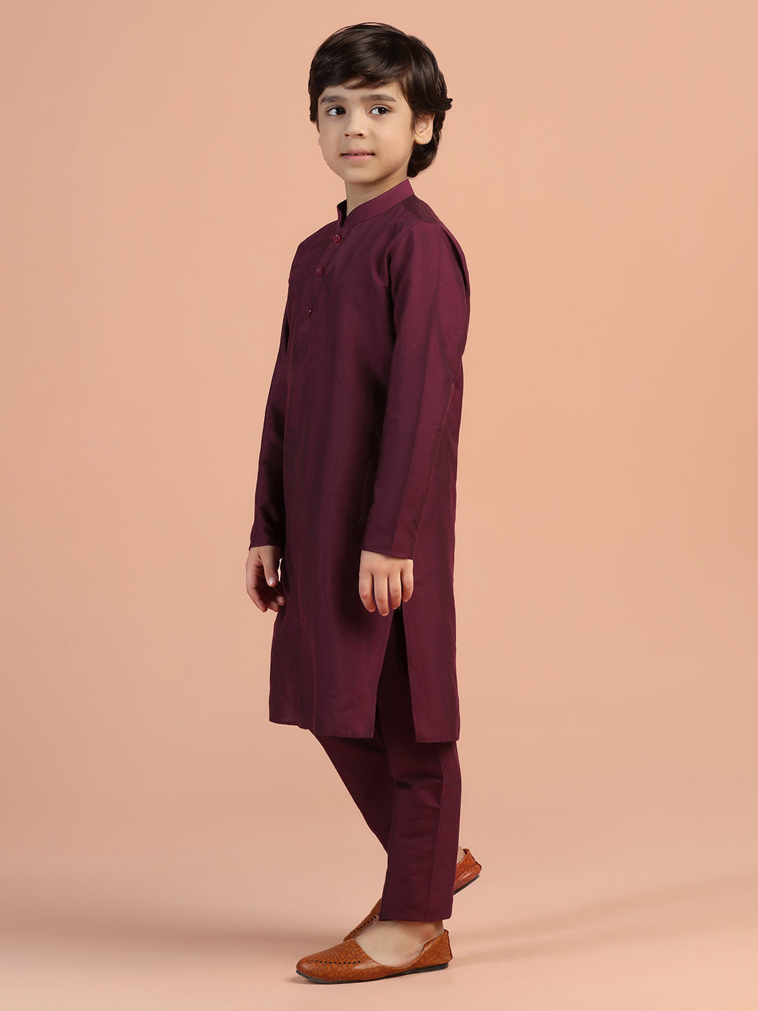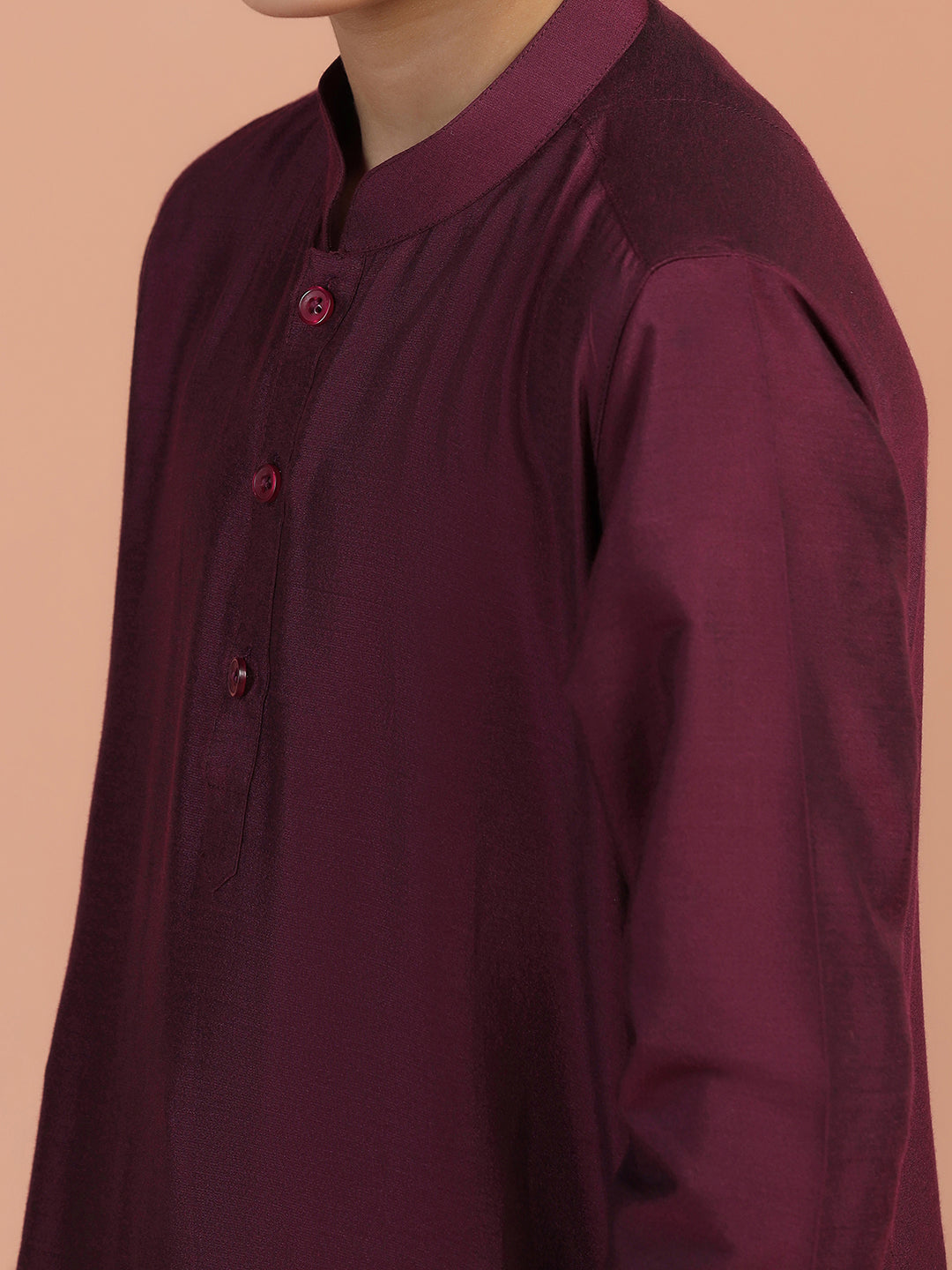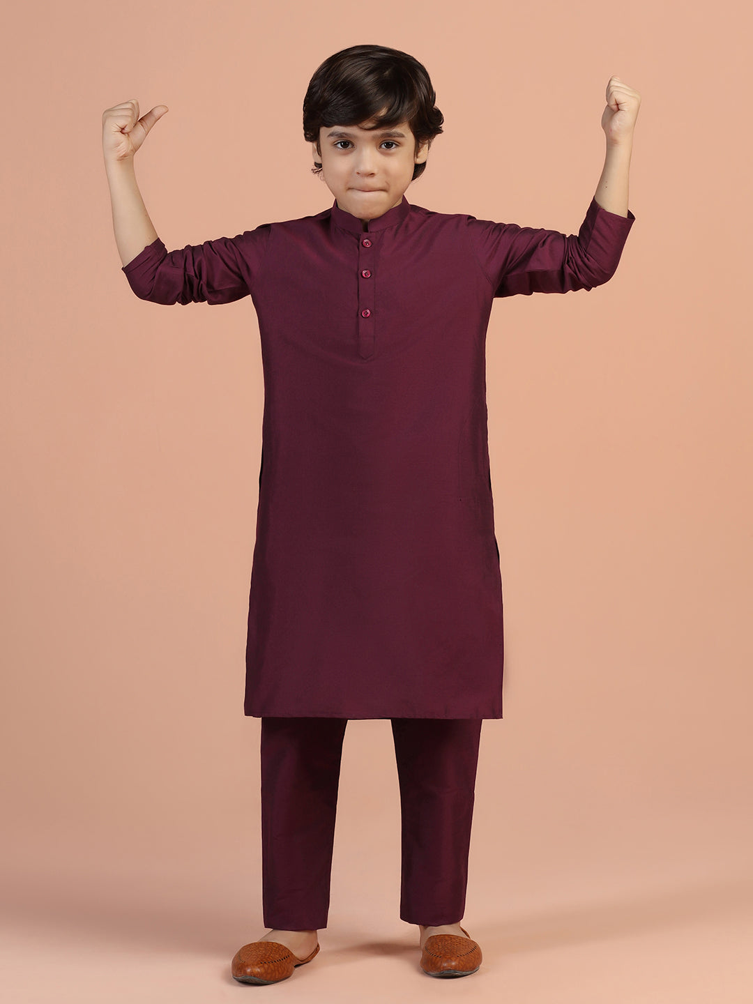 Maroon satin blend kurta pyjama set for boys – elegant, comfortable, and perfect for weddings or festive celebrations.
