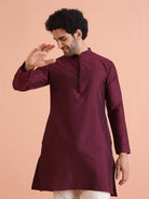 Kisah Men’s Maroon Silk Blend Kurta with mandarin collar, elegant button placket, perfect for weddings, festive occasions, or ethnic celebrations.