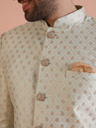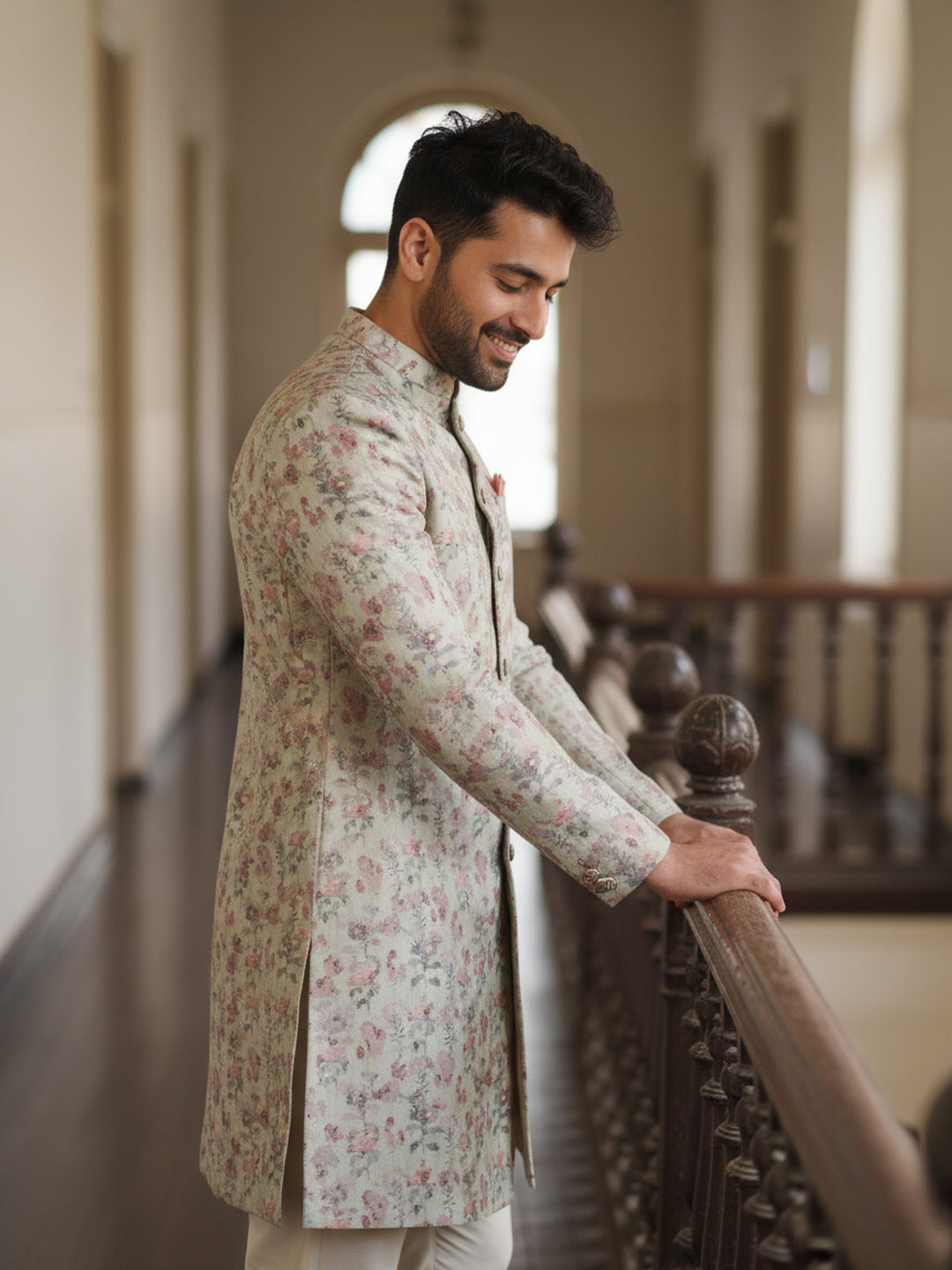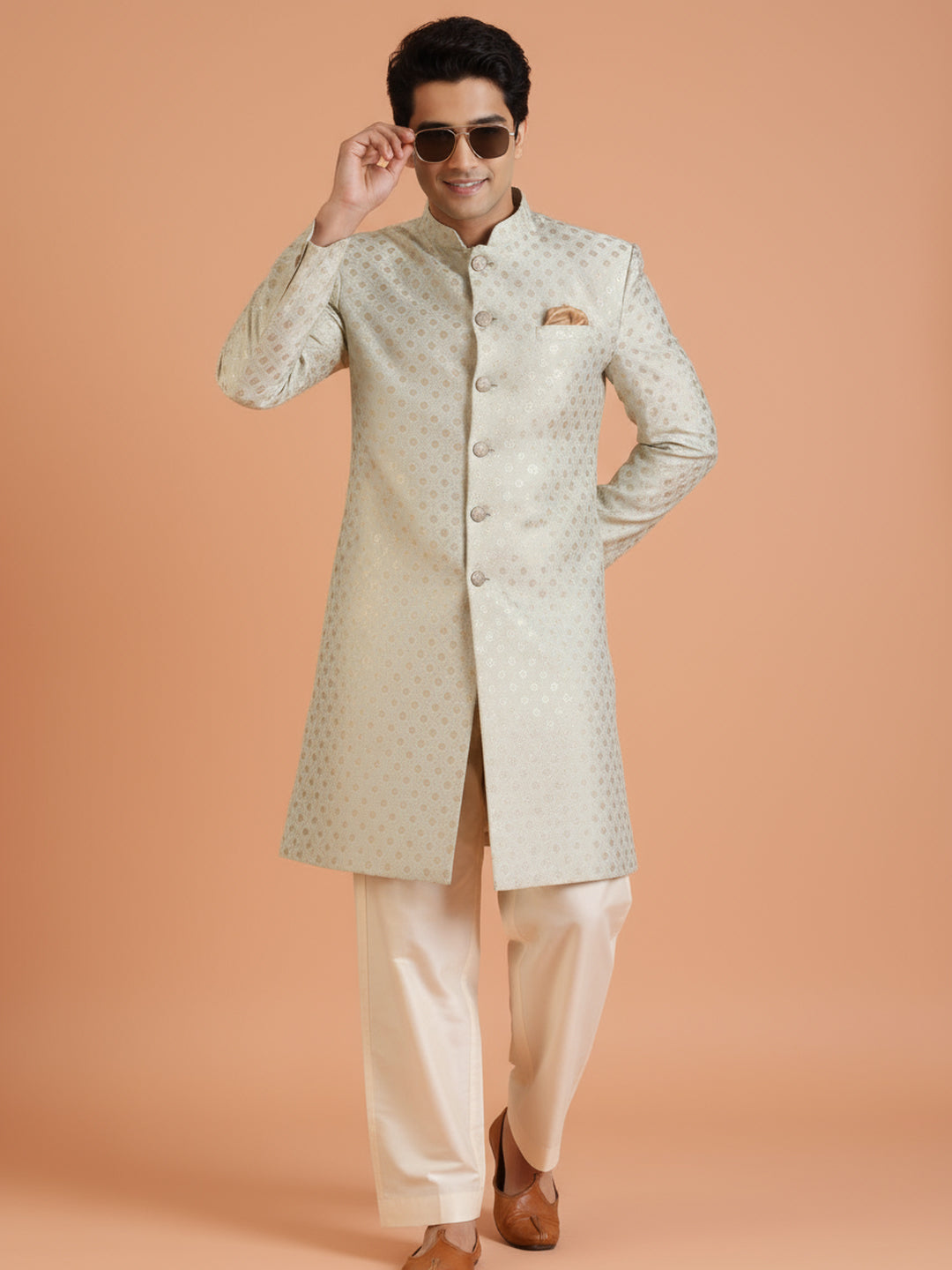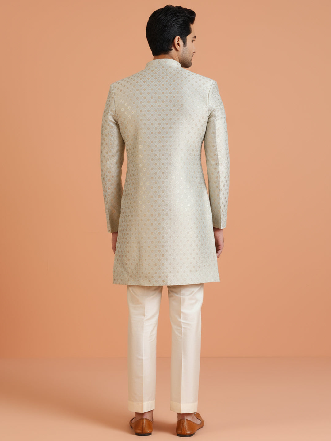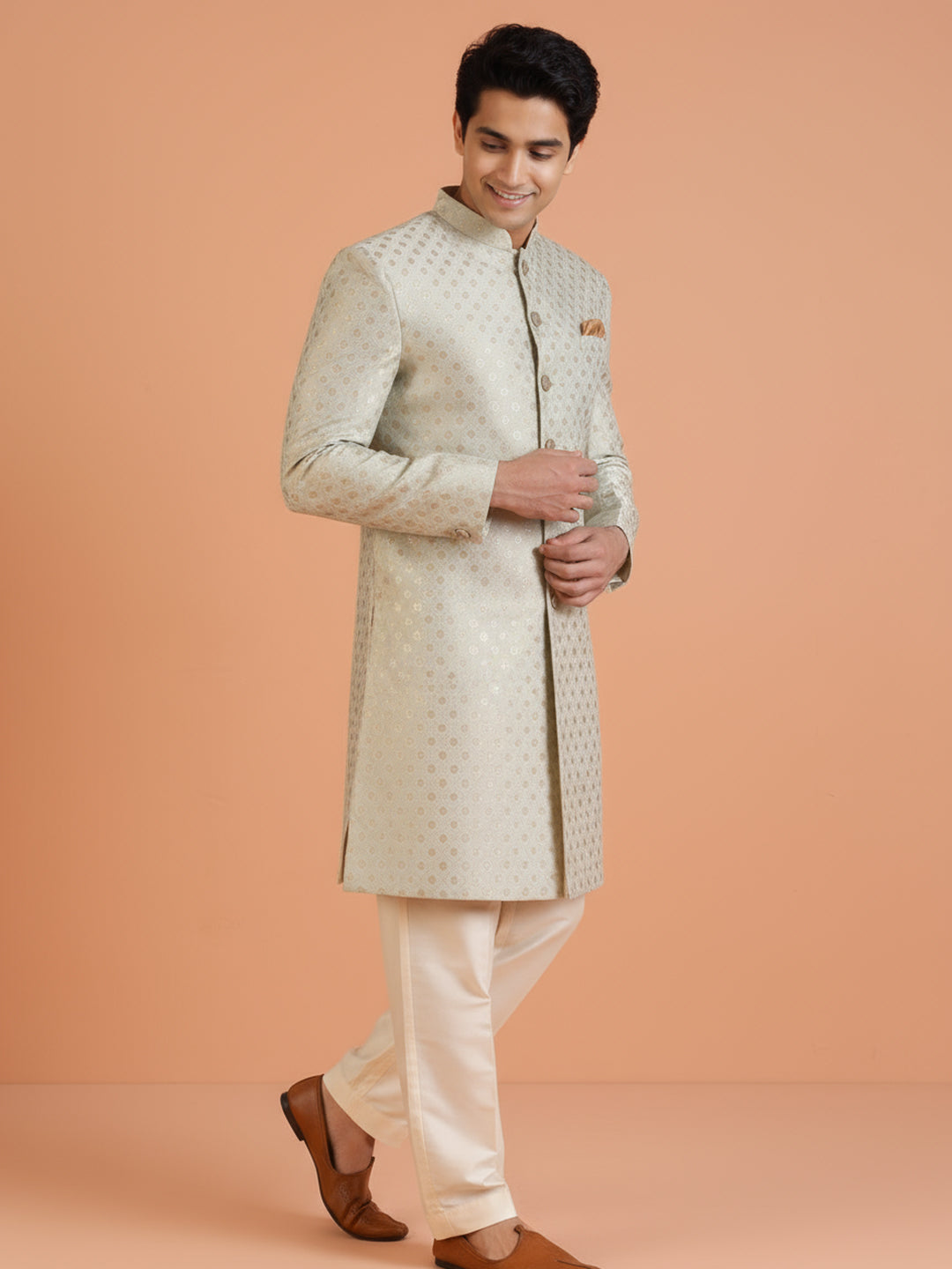 Mint green jacquard sherwani trouser set by Kisah a refined wedding & festive ensemble styled with ivory wide-leg trousers for modern elegance.