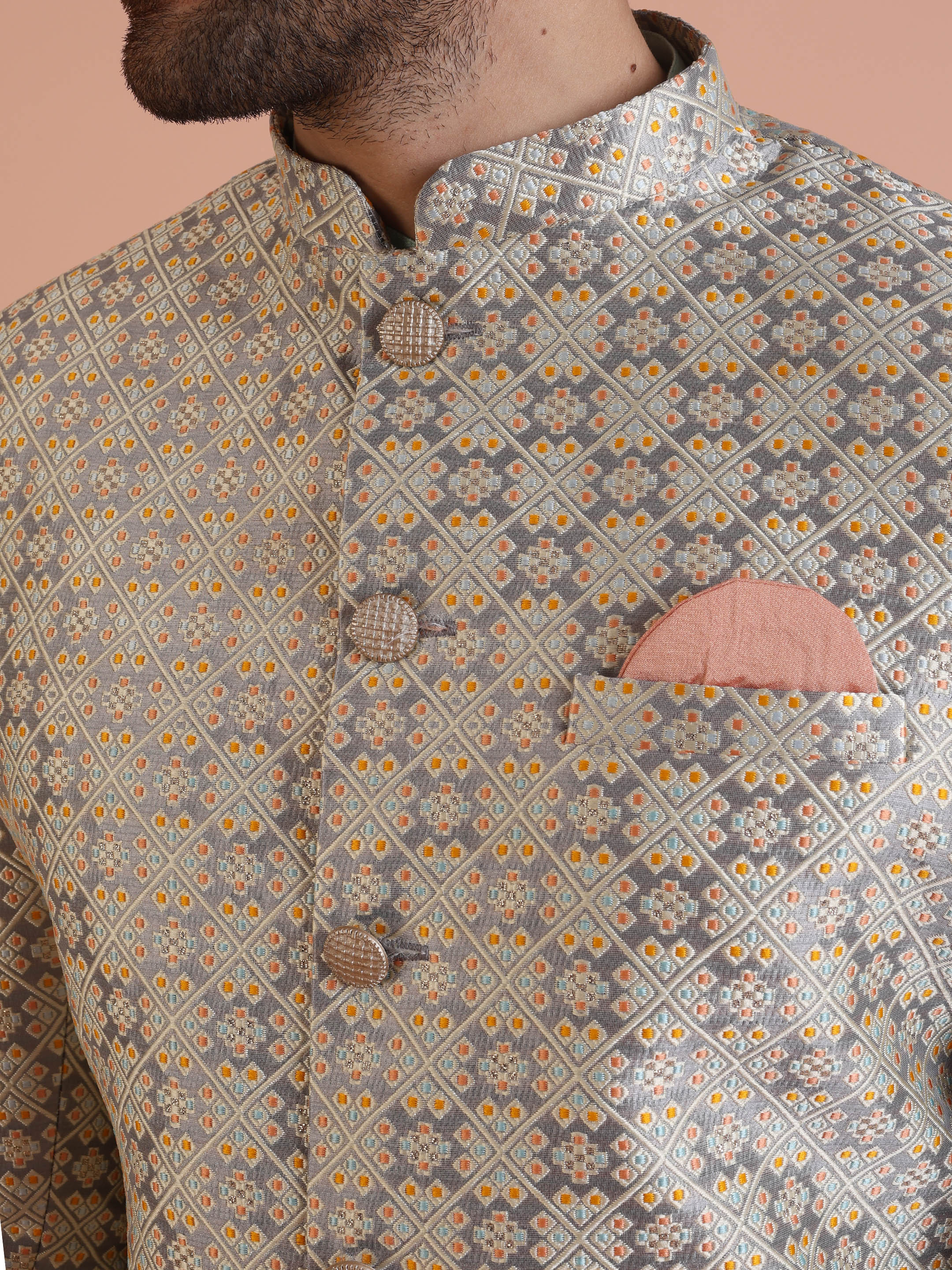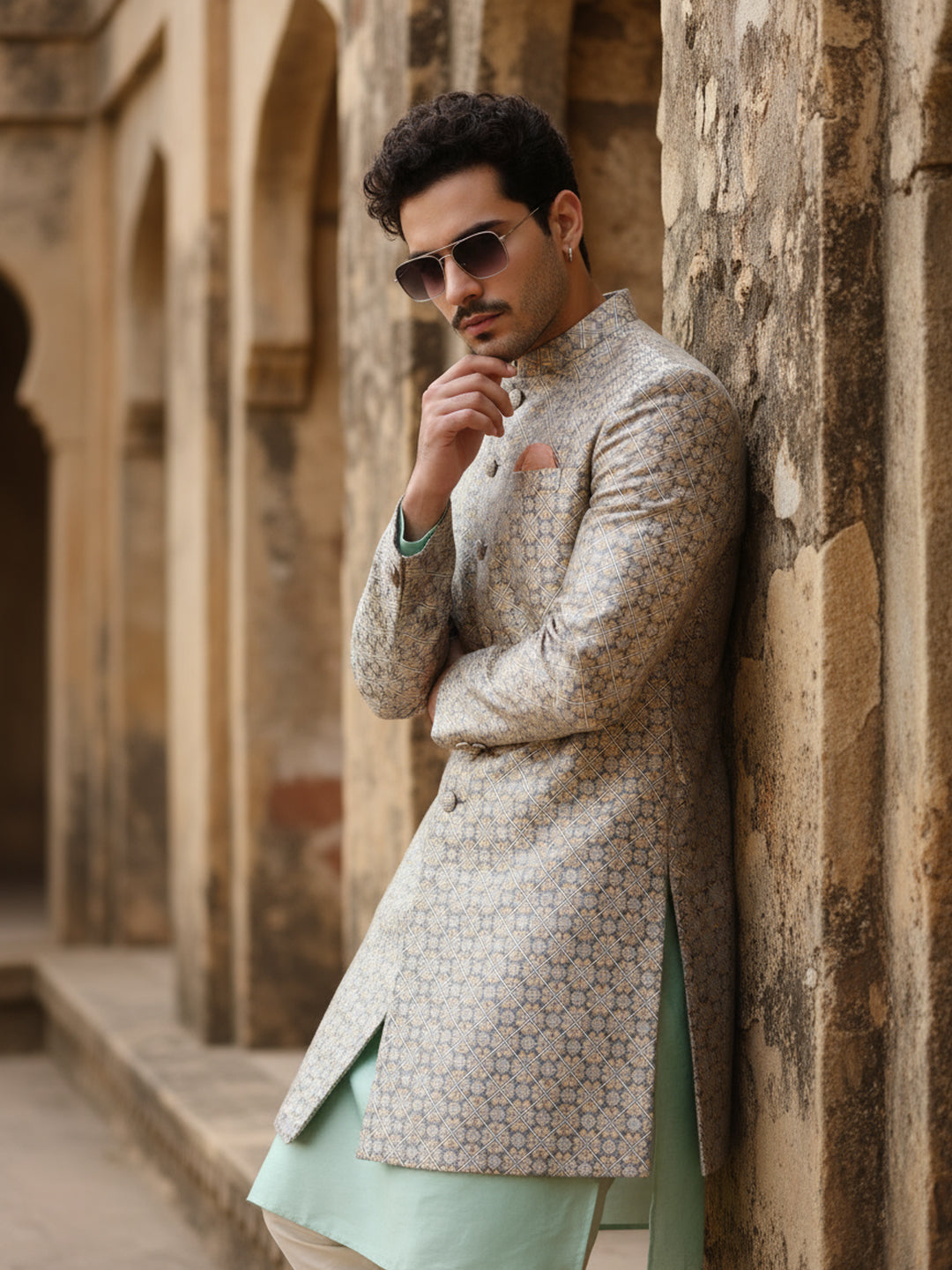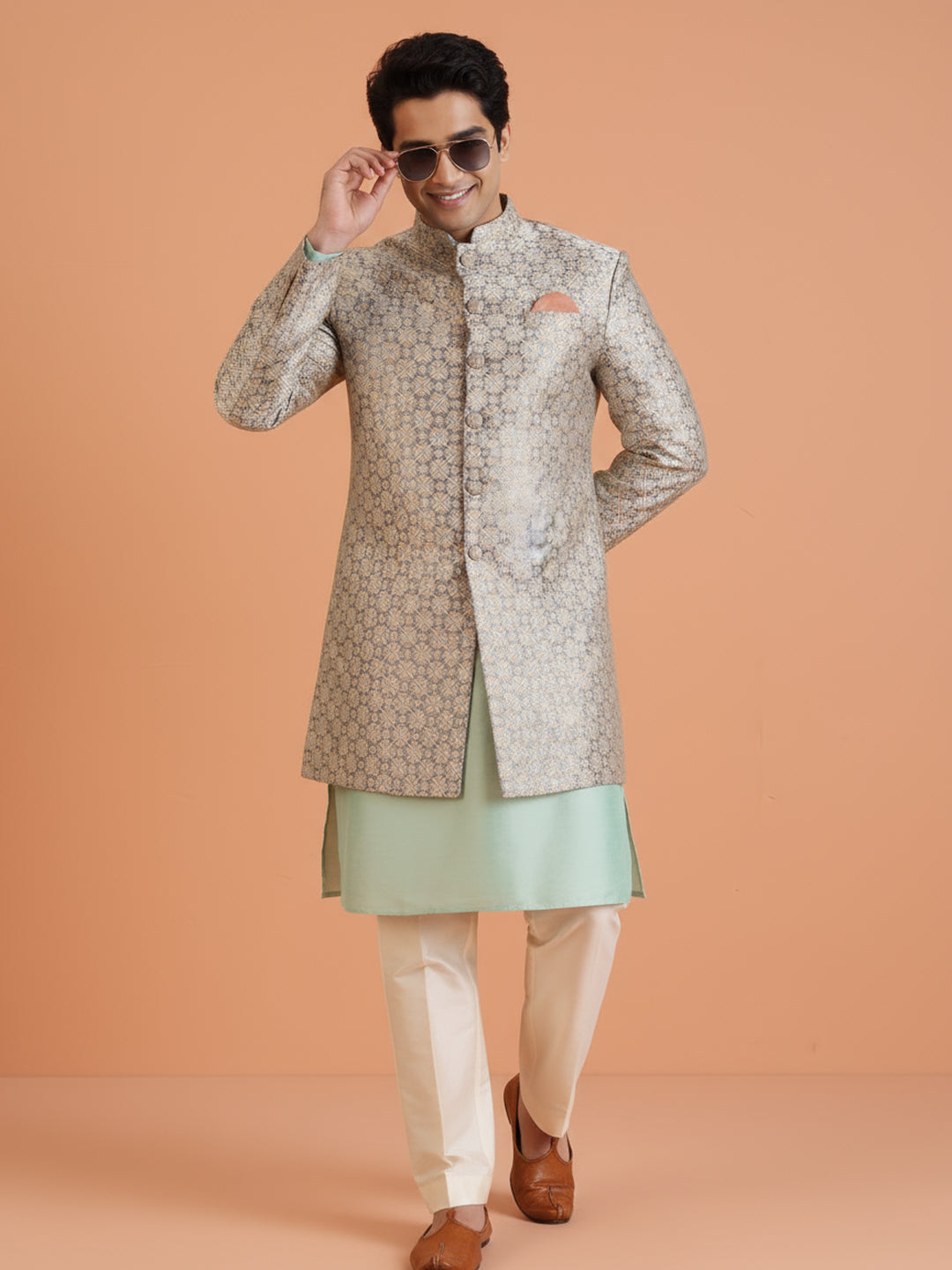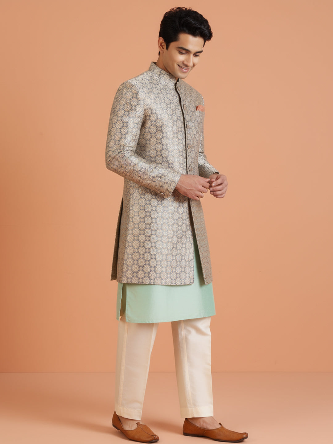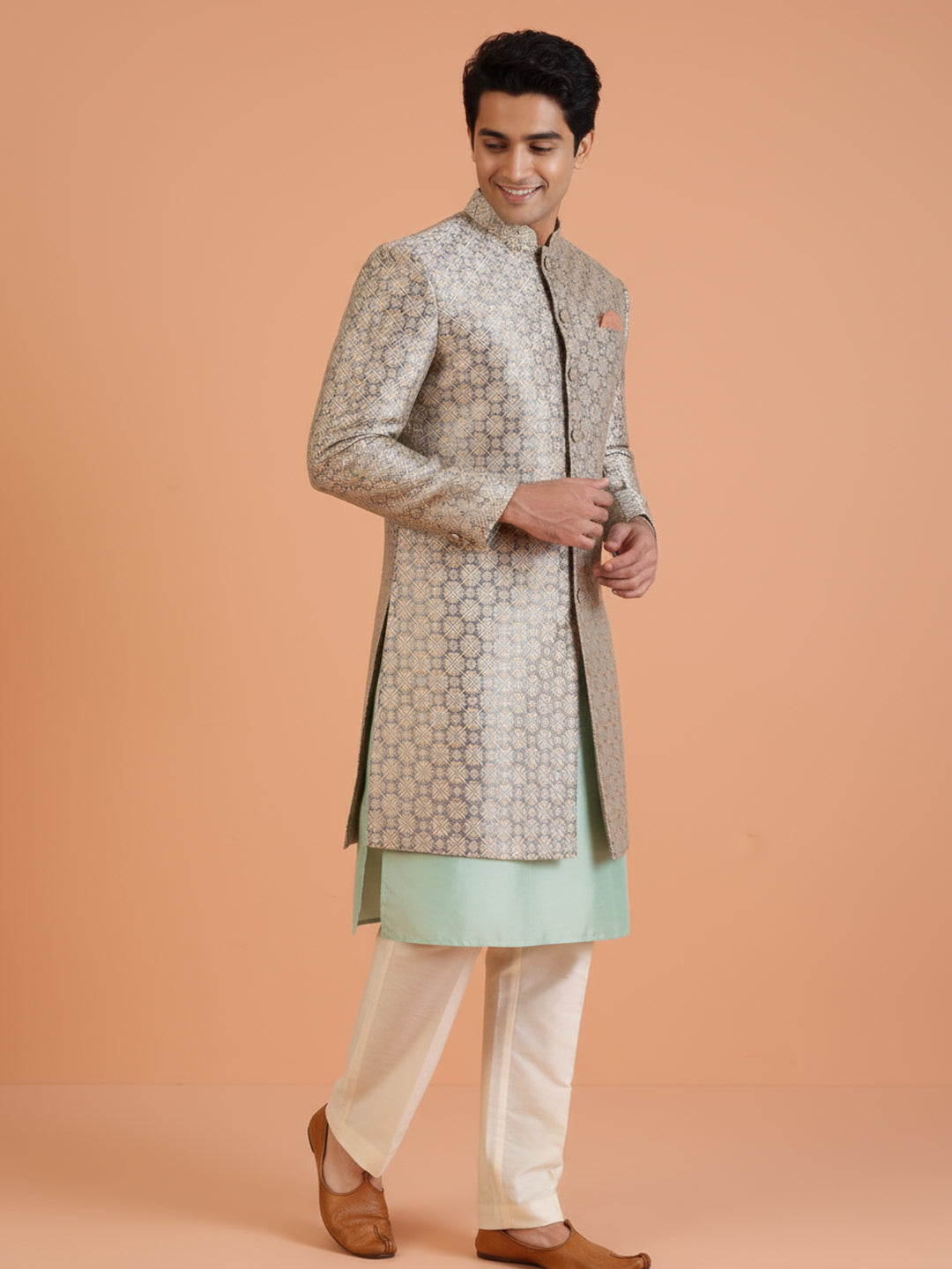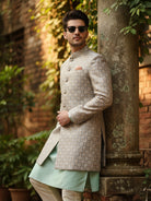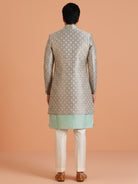 Mint green kurta and ivory embroidered sherwani set with wide-leg trouser — a fresh, modern festive look for weddings and celebrations.