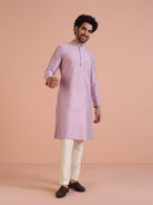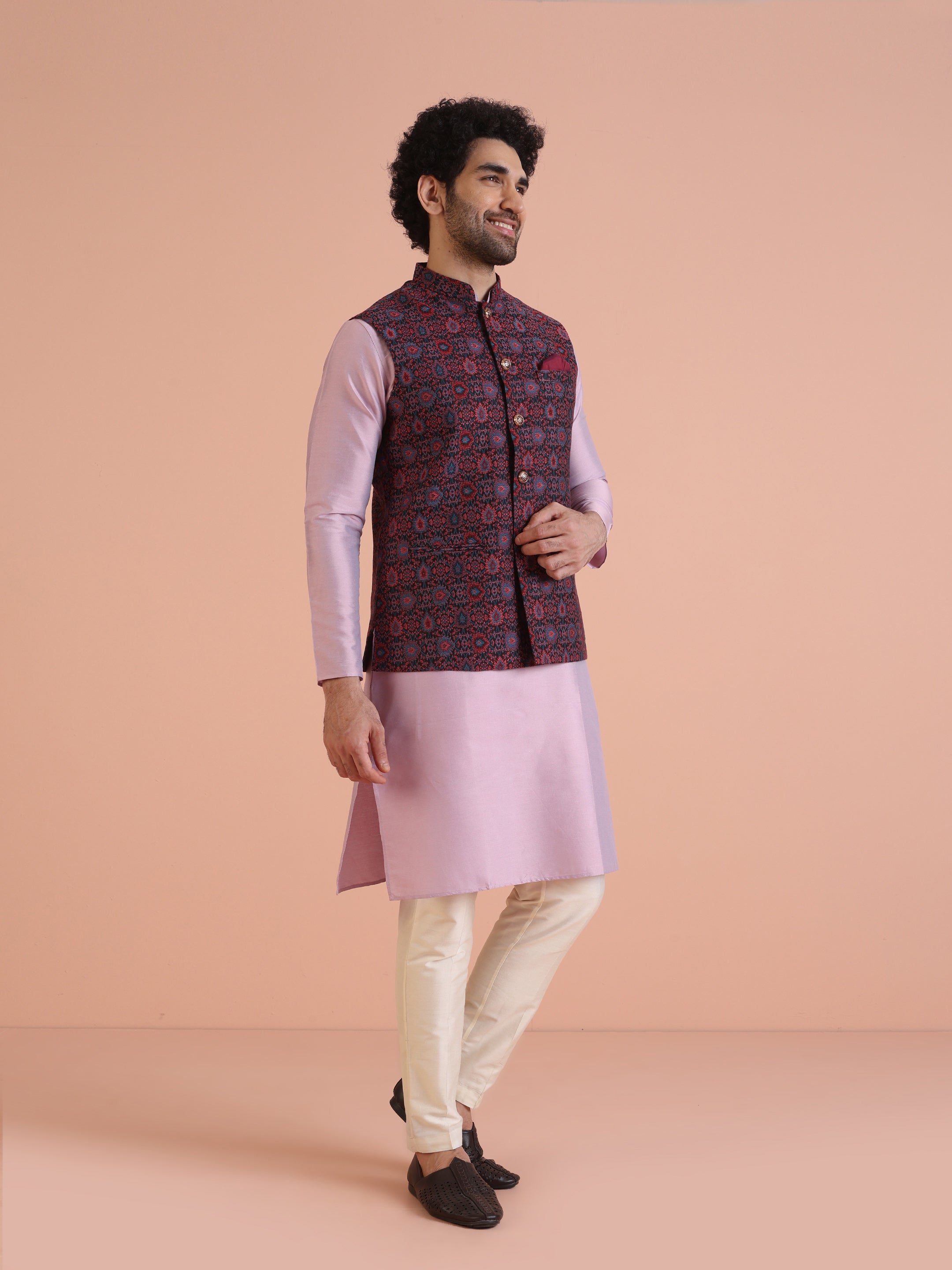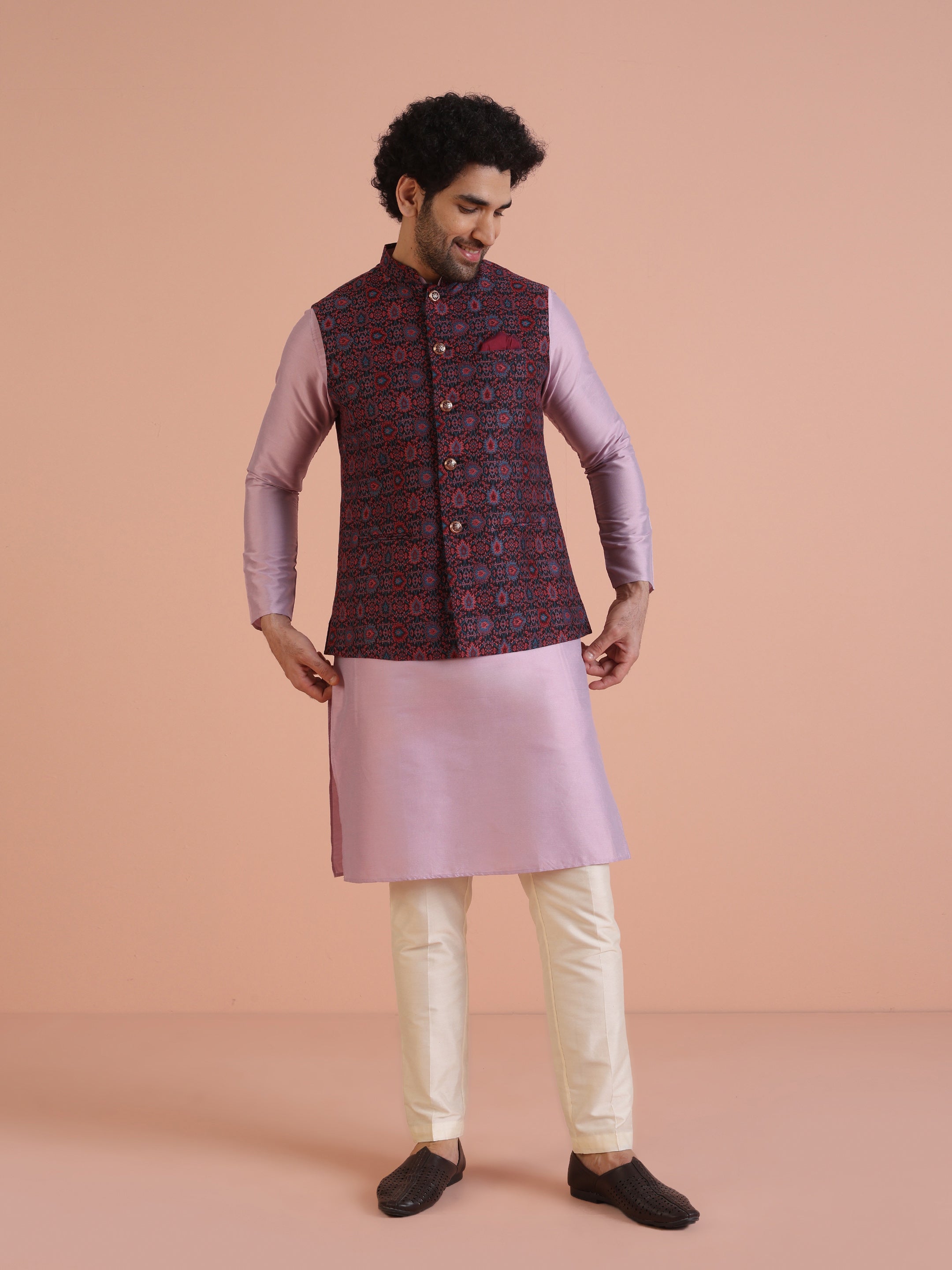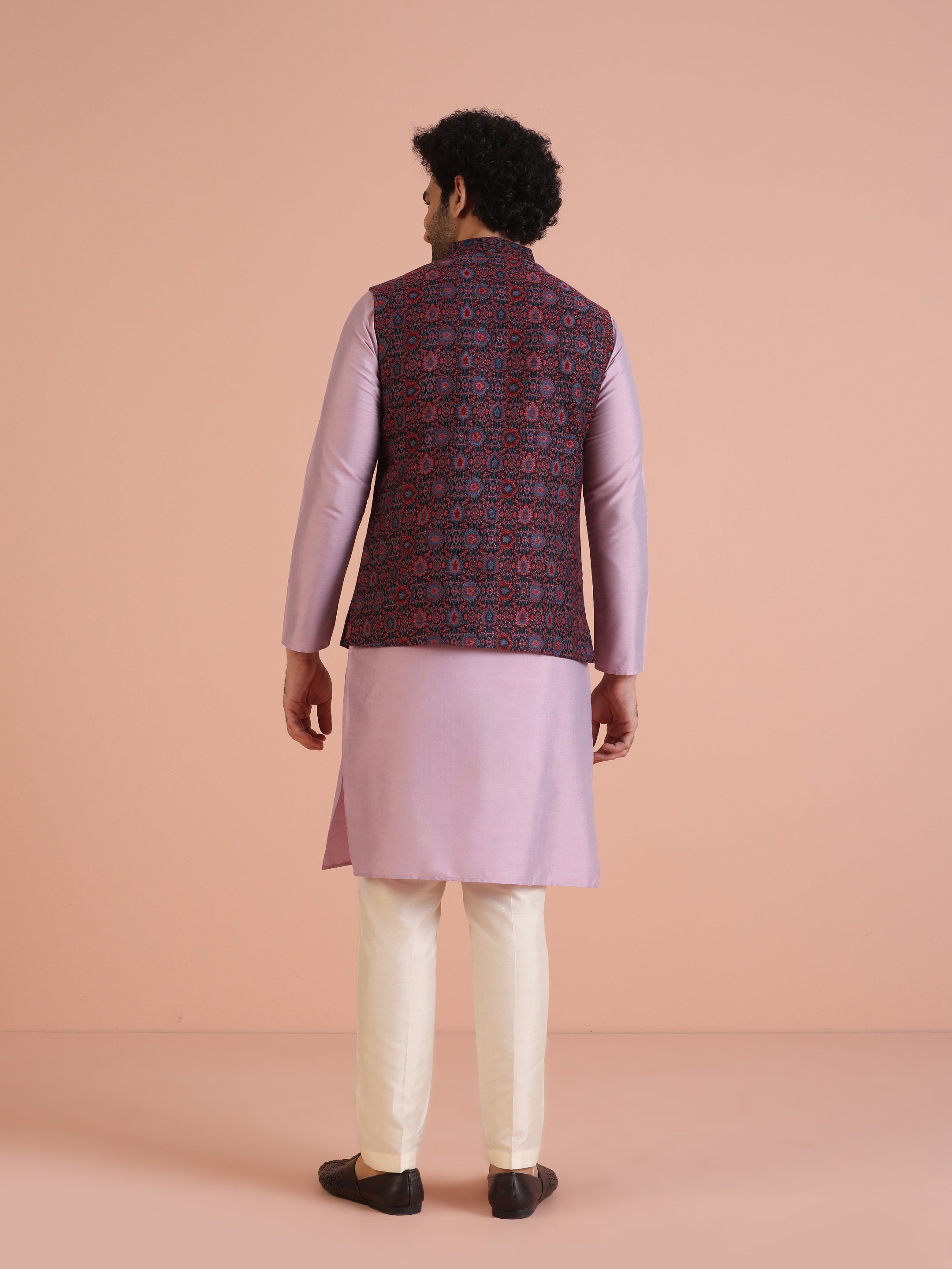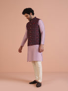 Multi-coloured textured Nehru jacket with lavender kurta & cream trousers. Festive 3-piece ethnicwear set perfect for weddings, Diwali & sangeet.