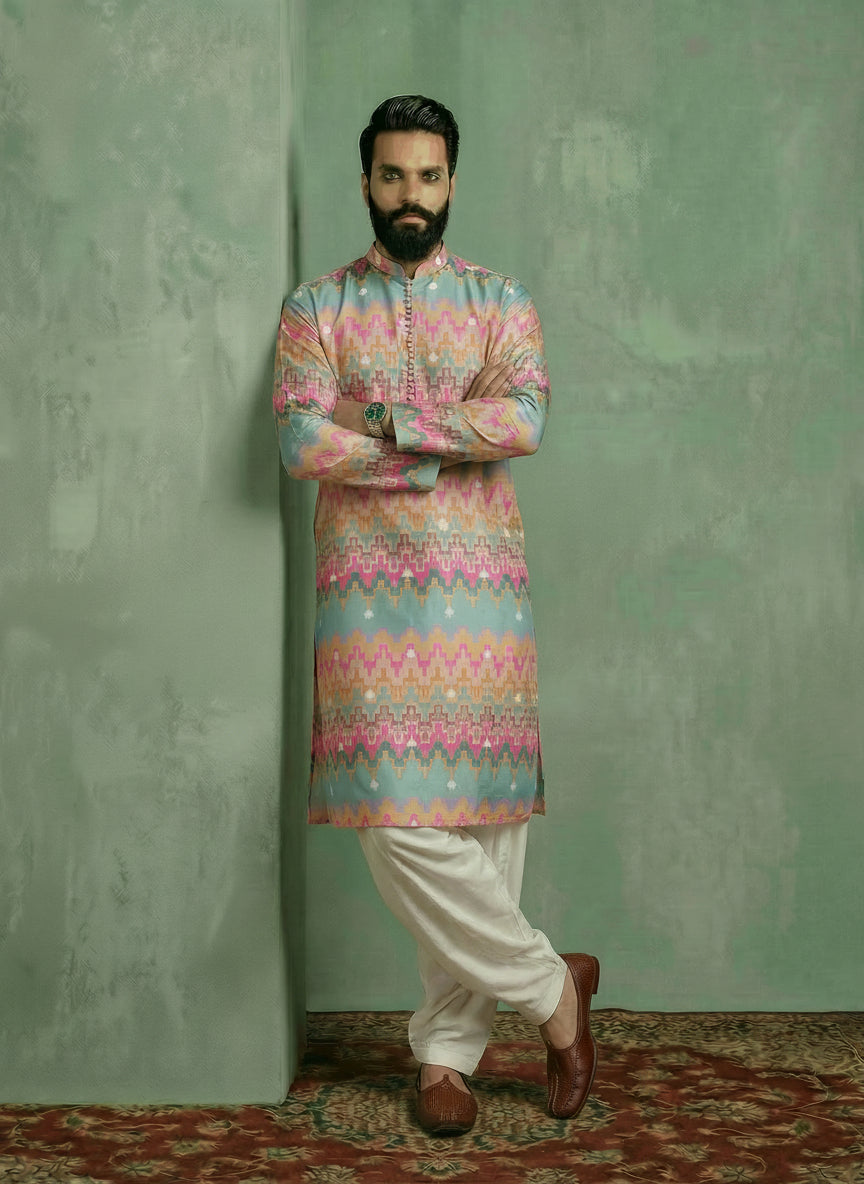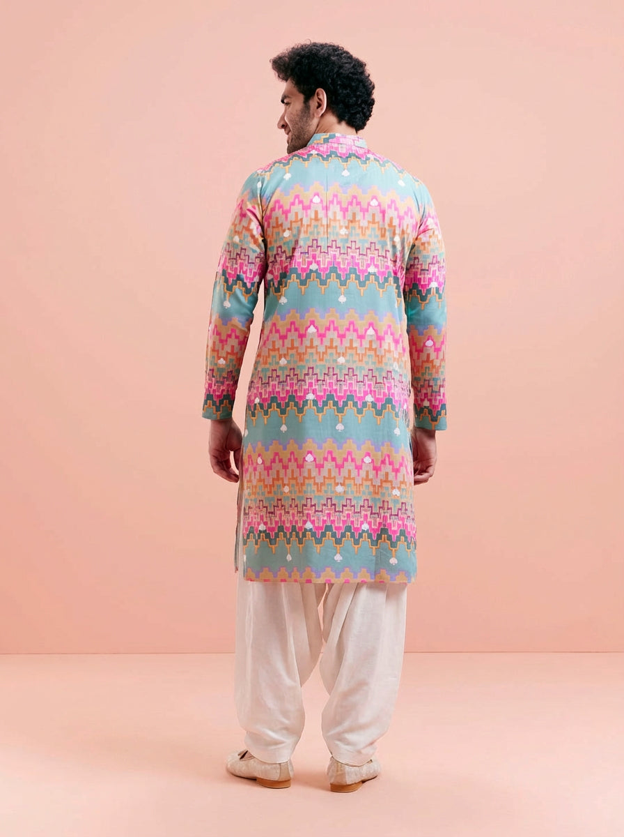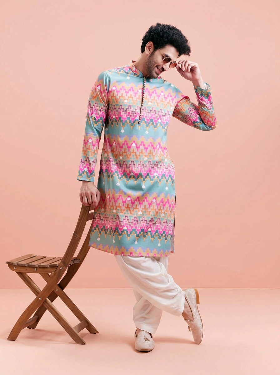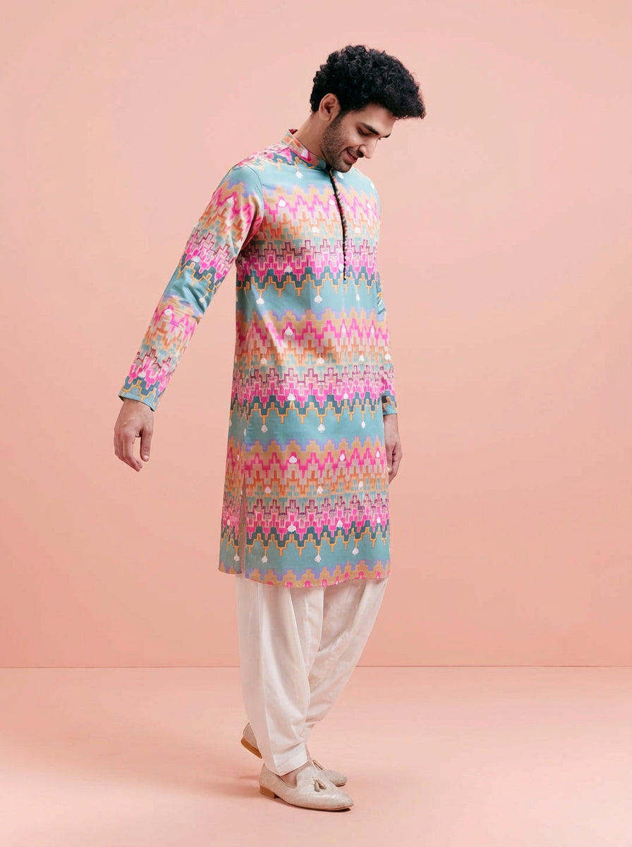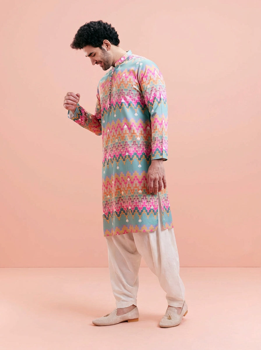 Multicolour Silk Blend Kurta Patiyala Set with printed design. Perfect for festive occasions, offering a stylish and comfortable fit. Ideal for Eid festival.