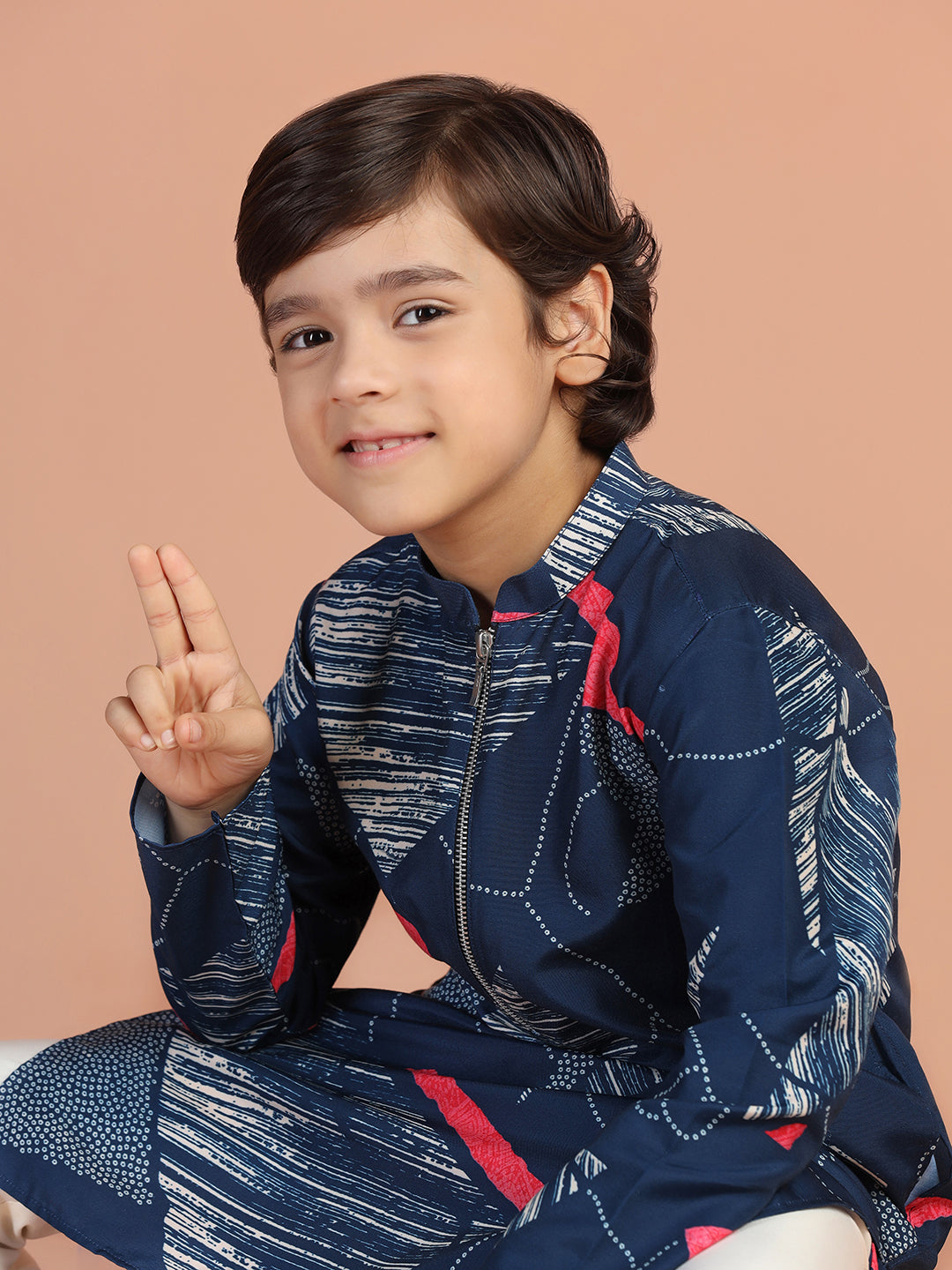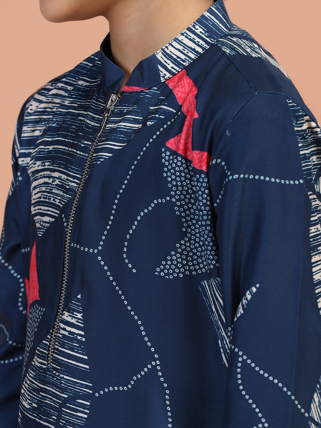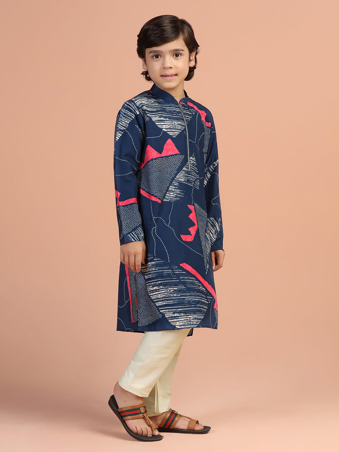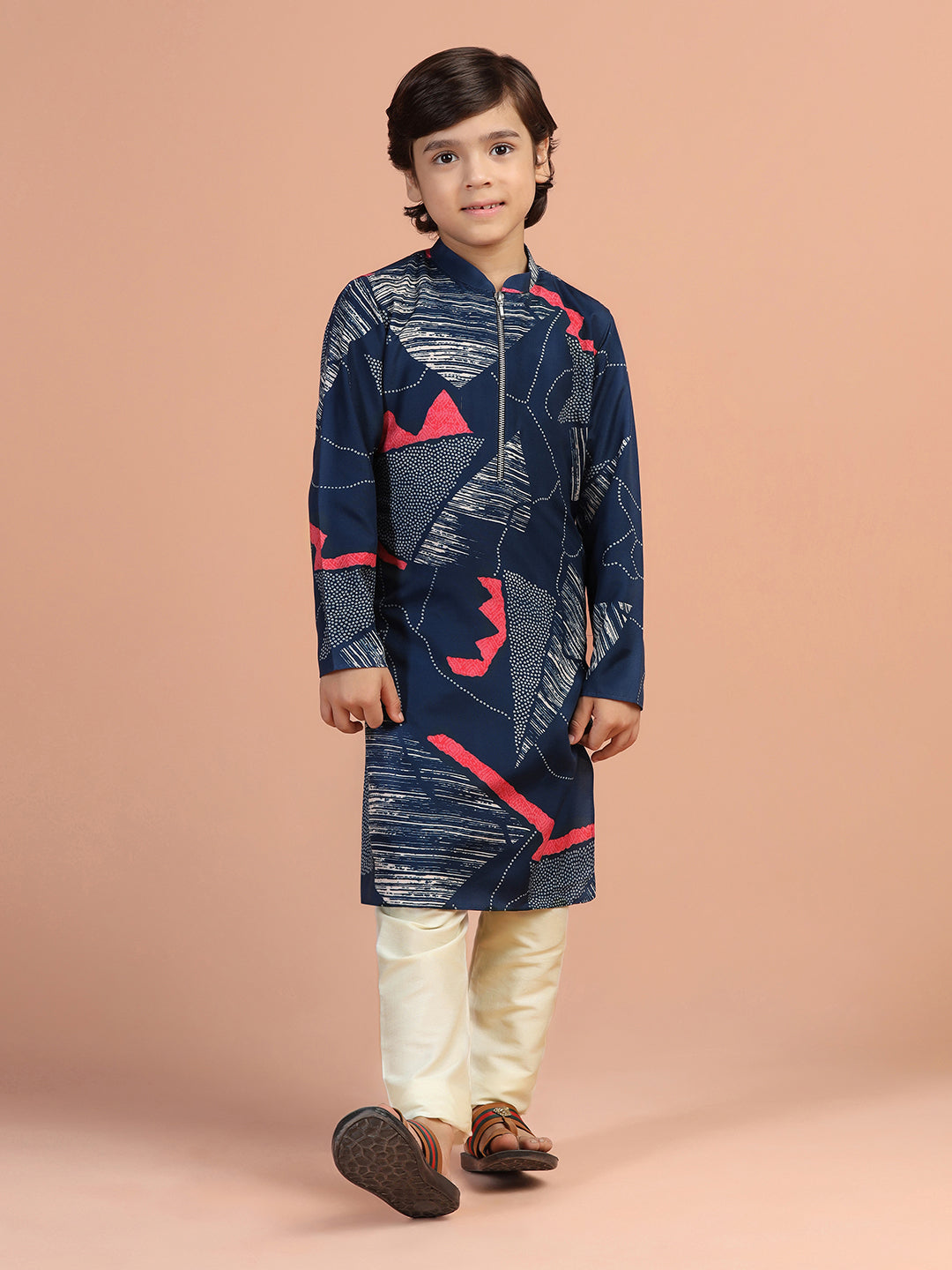 Trendy navy abstract printed kurta pyjama set for boys – cotton blend comfort with modern zip-neck design, perfect for festive and family events.