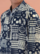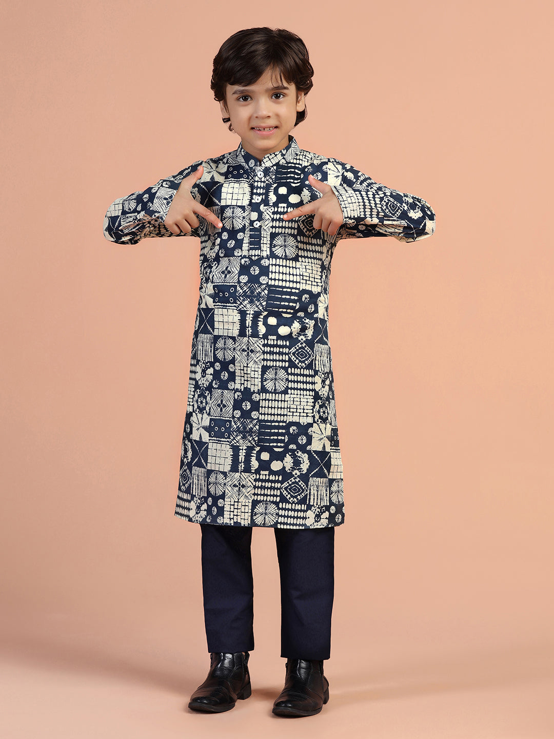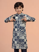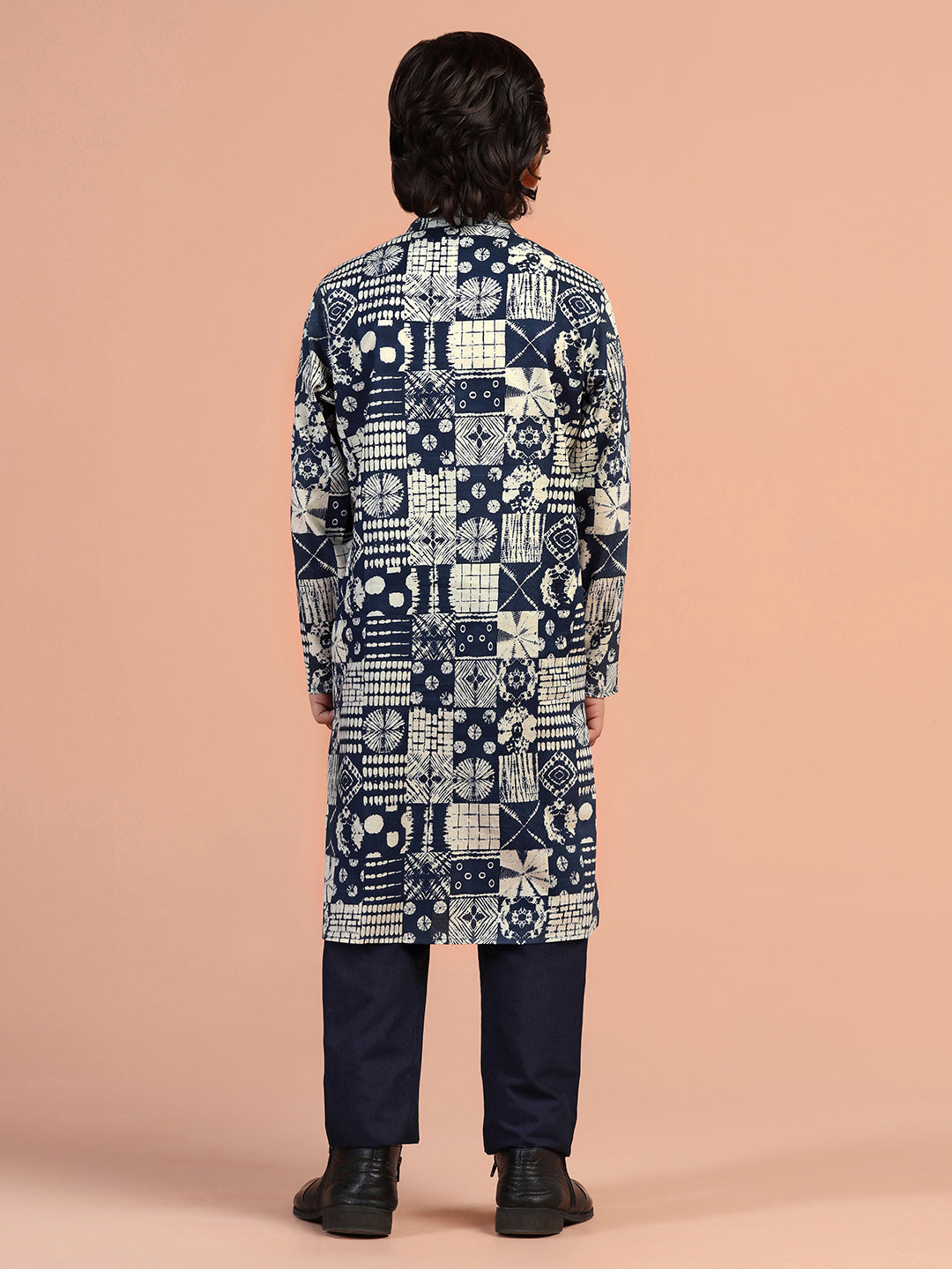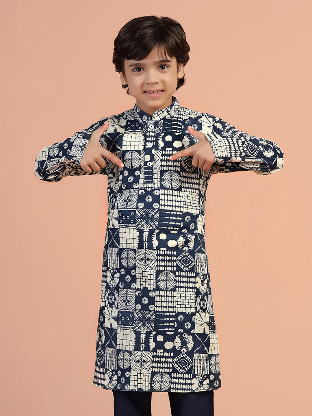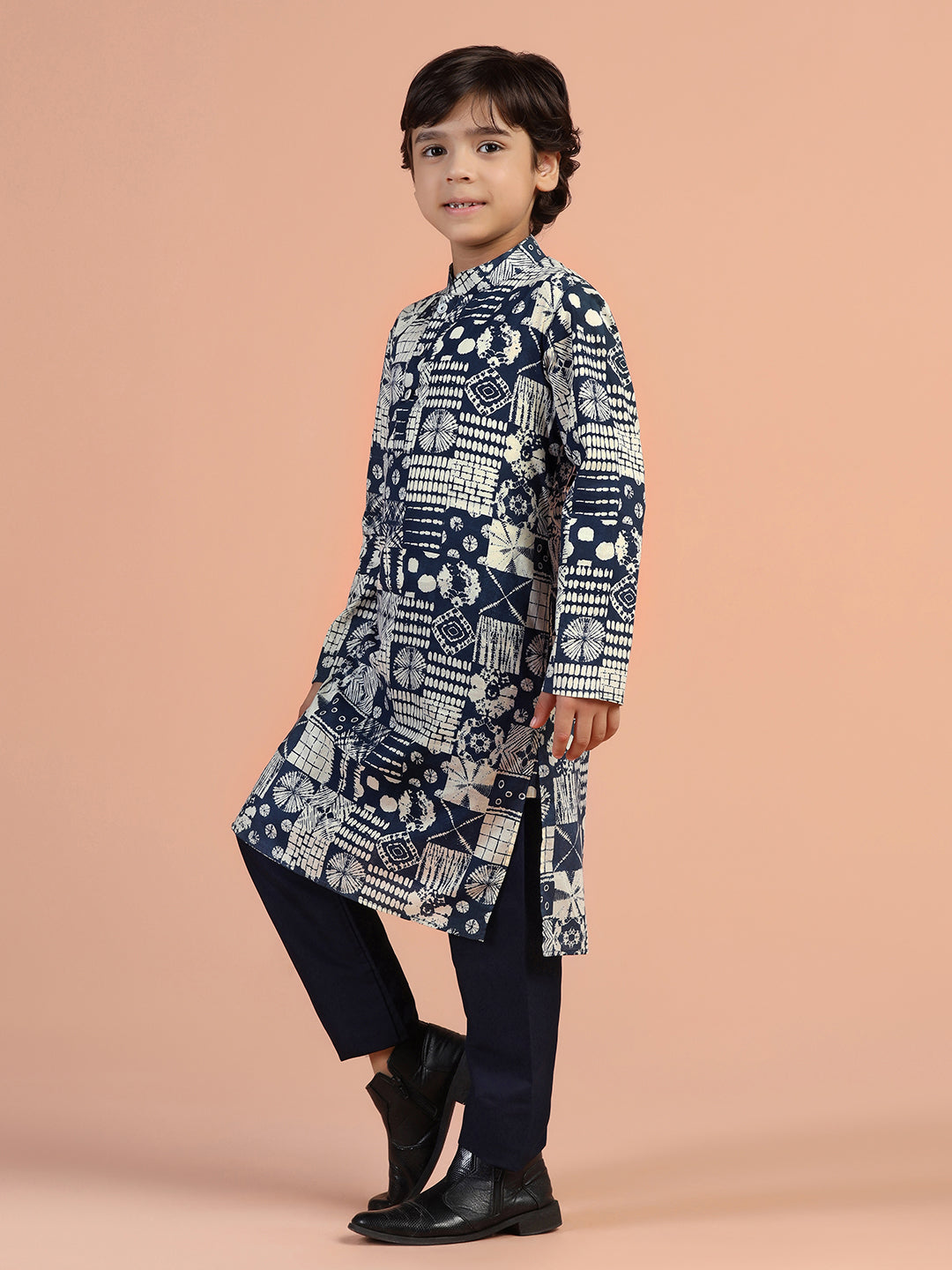 Navy blue abstract printed cotton blend kurta for boys – stylish, soft, and perfect for weddings or festive occasions.
