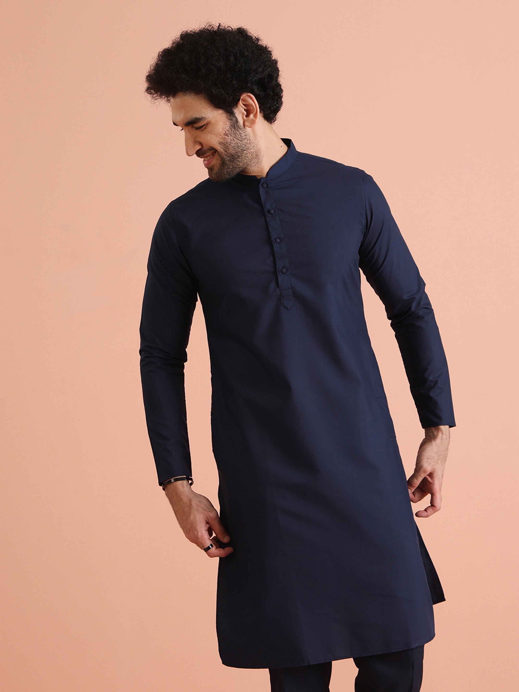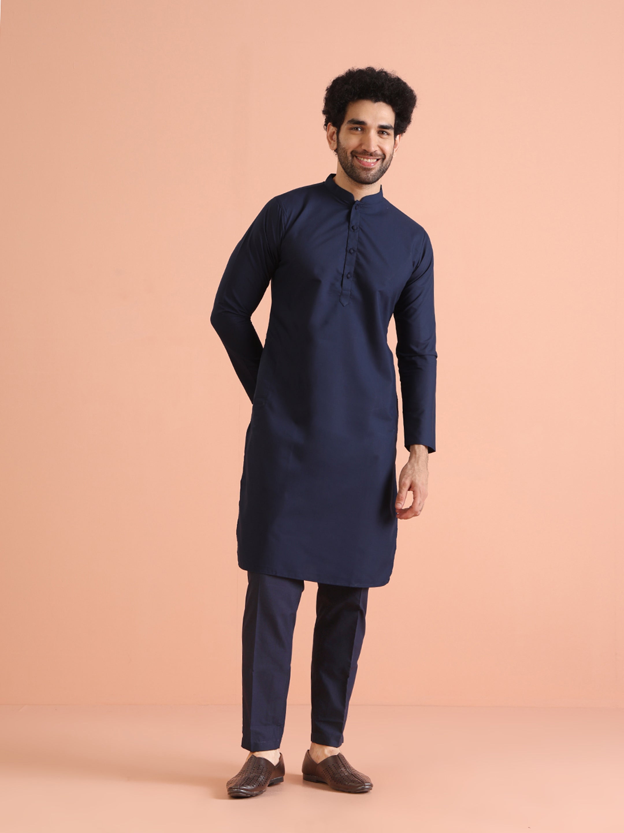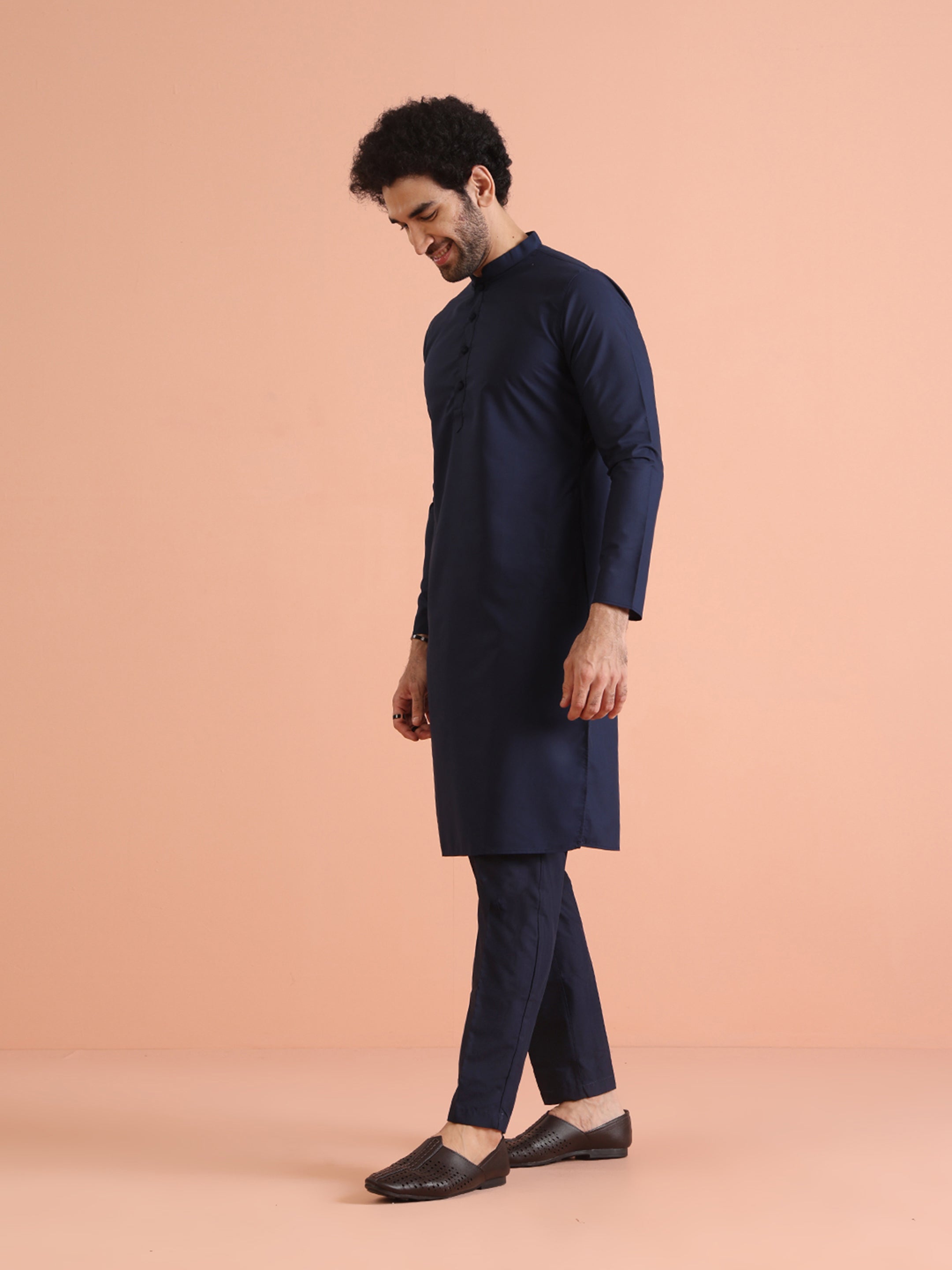 Navy blue cotton silk kurta trouser set in solid design. A minimal ethnic outfit ideal for receptions, cocktails, and festive occasions.