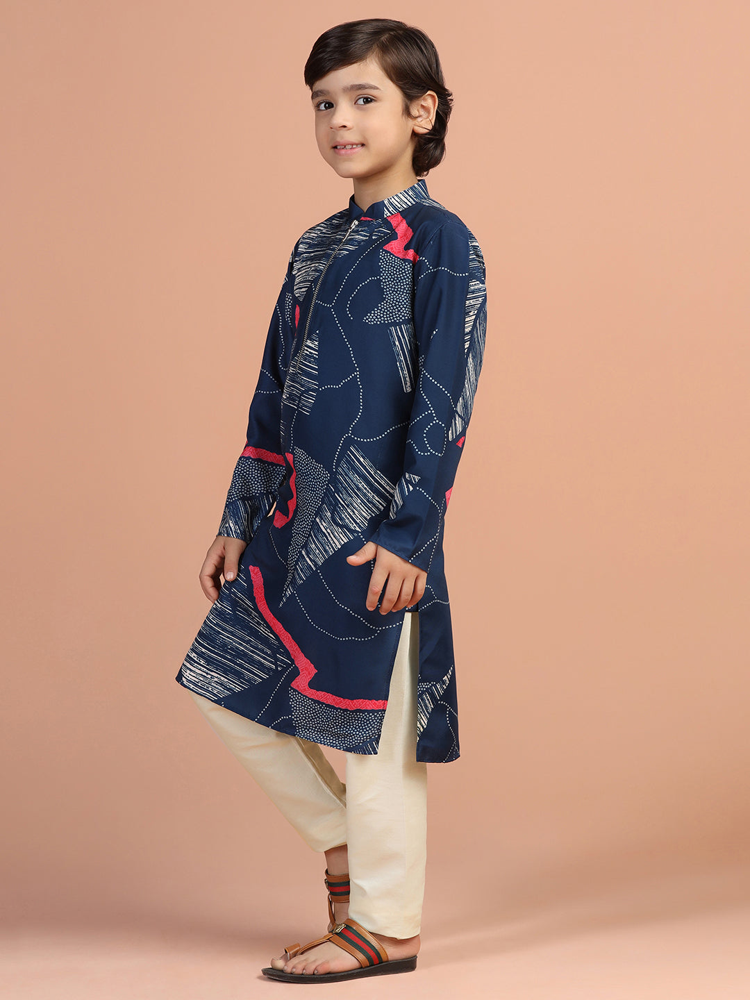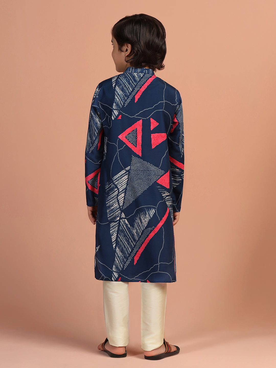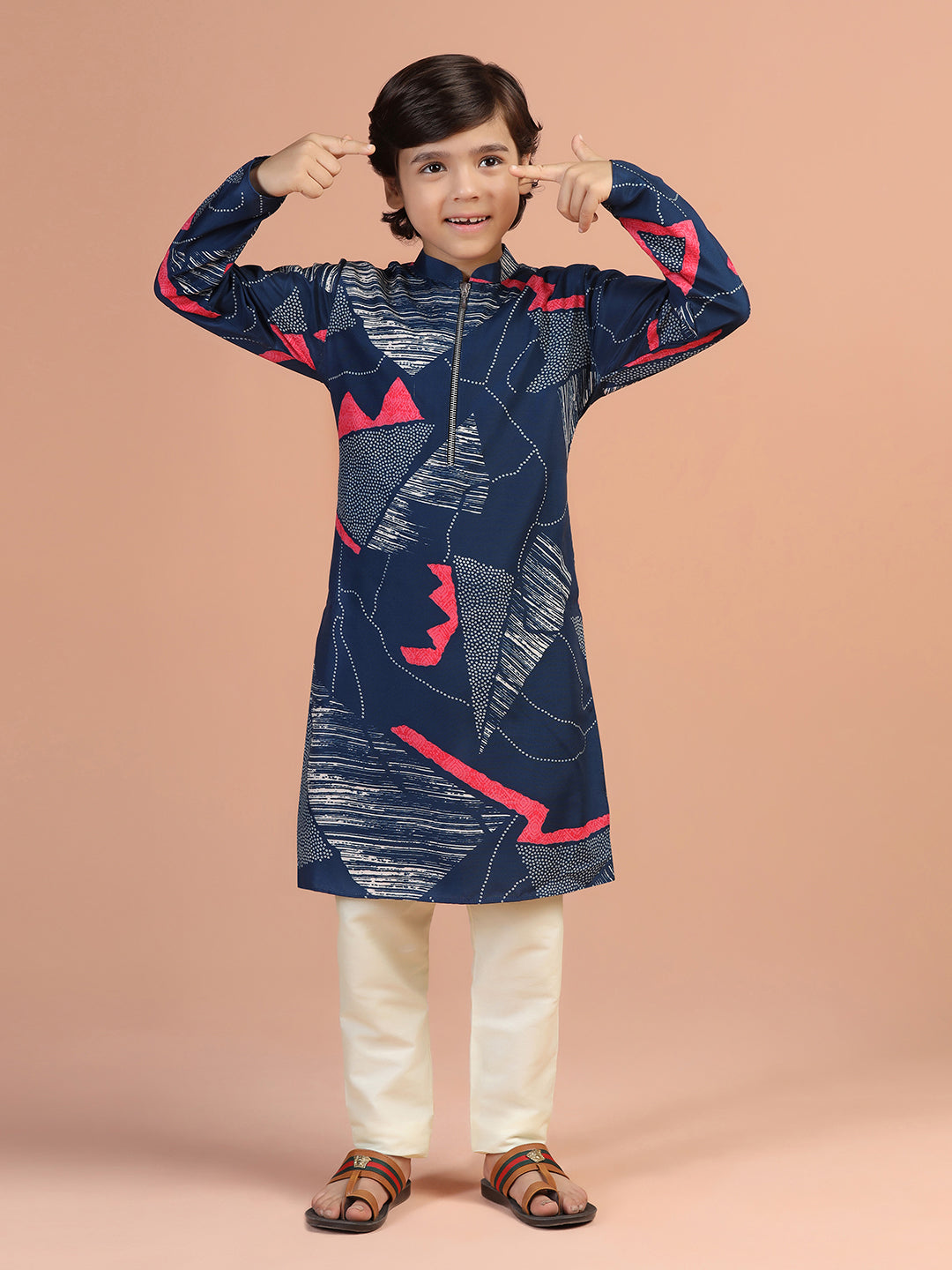 Stylish navy blue geometric printed kurta for boys – modern design in a soft cotton blend, perfect for festive and cultural occasions.