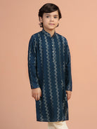 Navy blue jacquard kurta pyjama set for boys – elegant festive outfit with woven pattern, perfect for weddings and traditional functions.