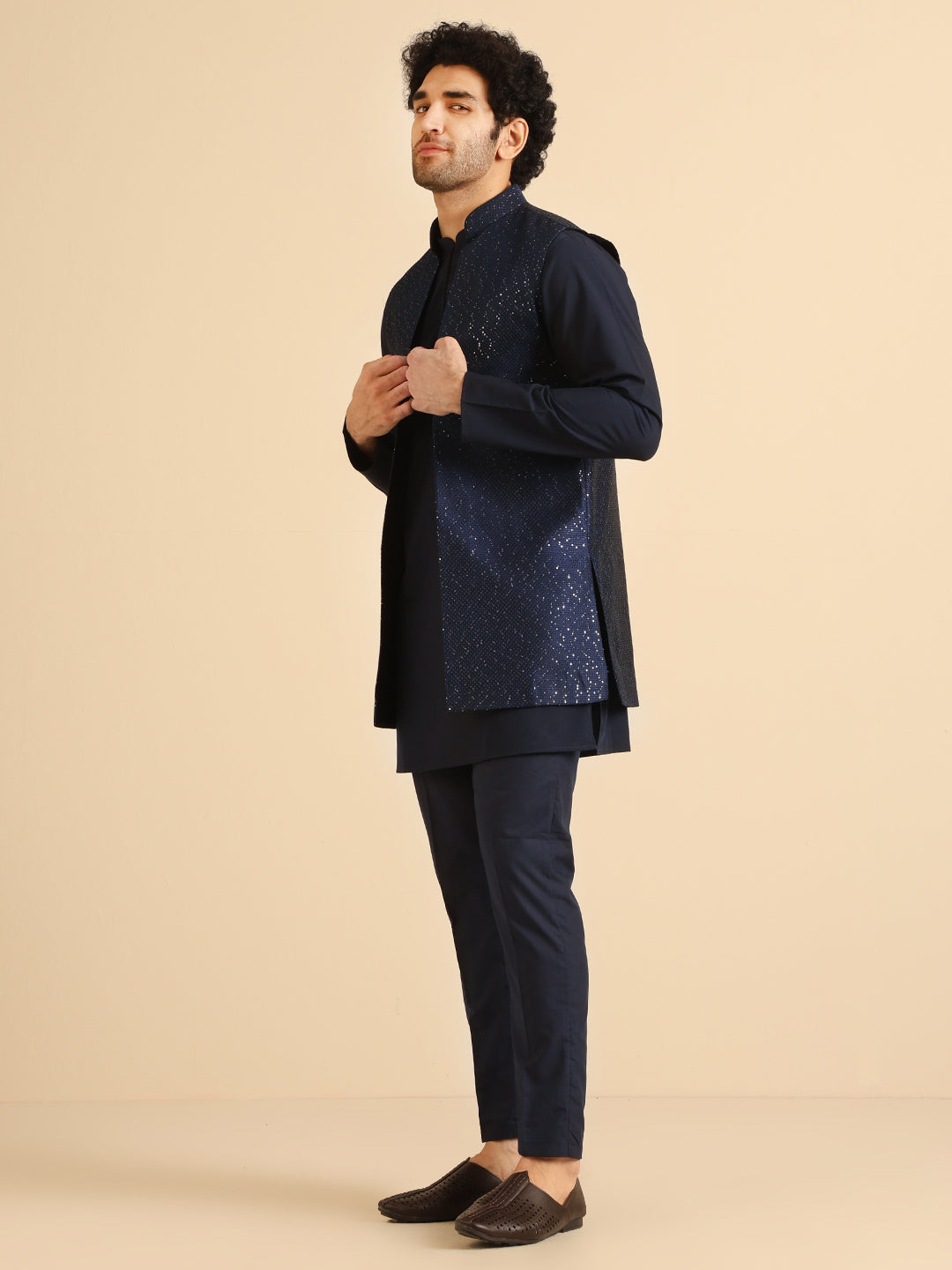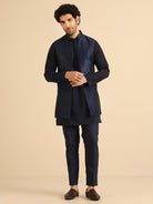 Navy silk blend kurta with metallic textured Nehru jacket & trouser. A stylish evening ethnic set for weddings, cocktails & festive occasions.