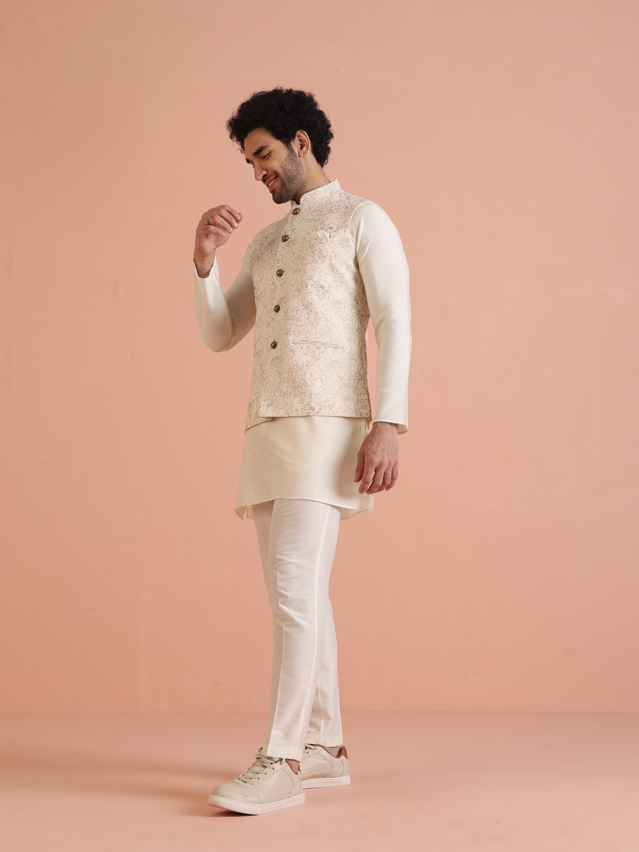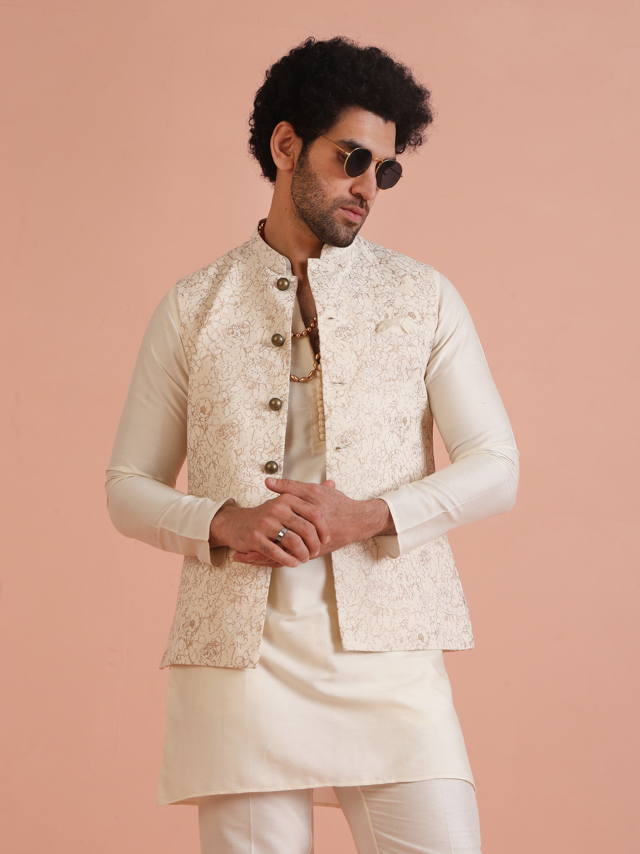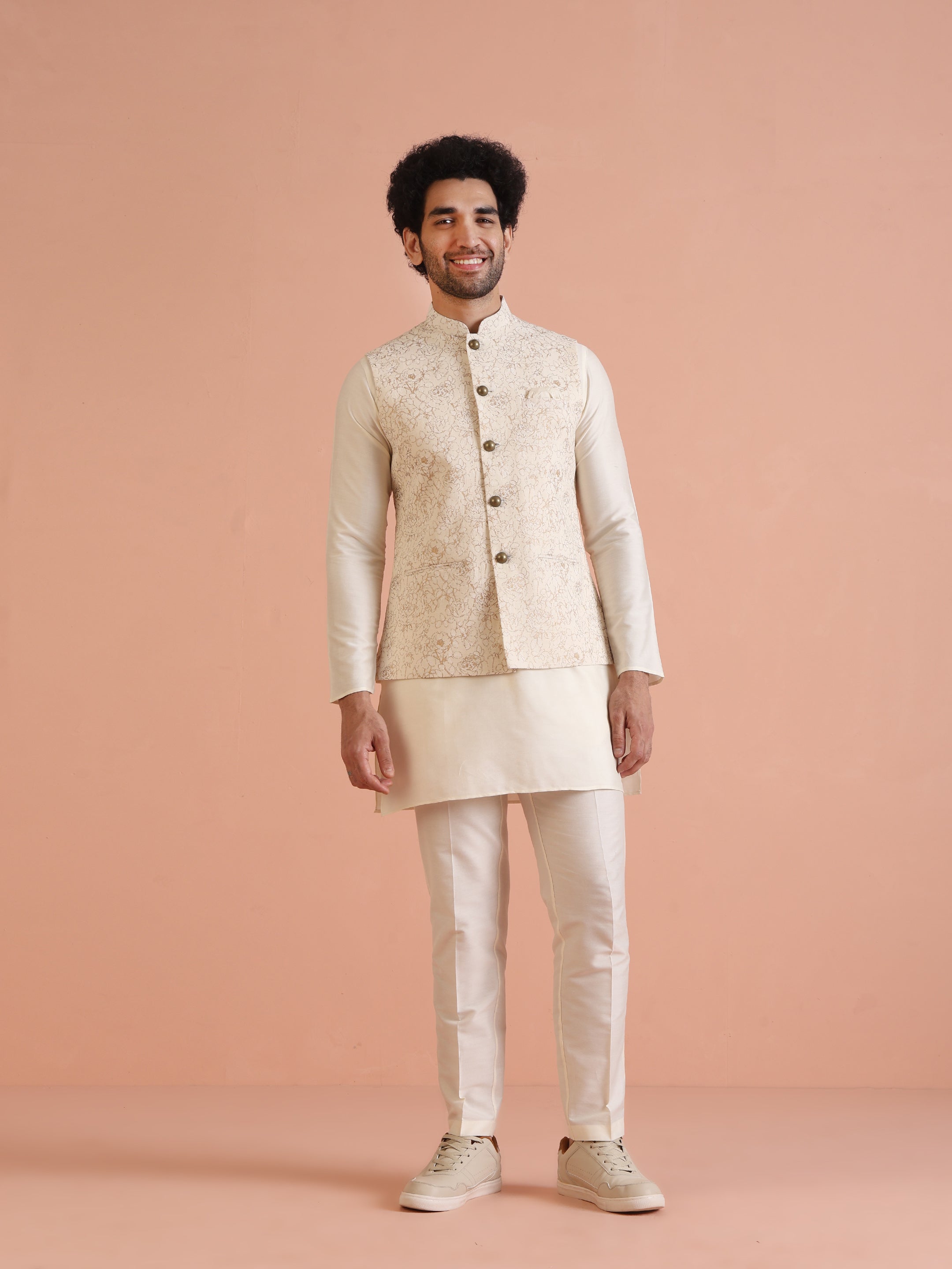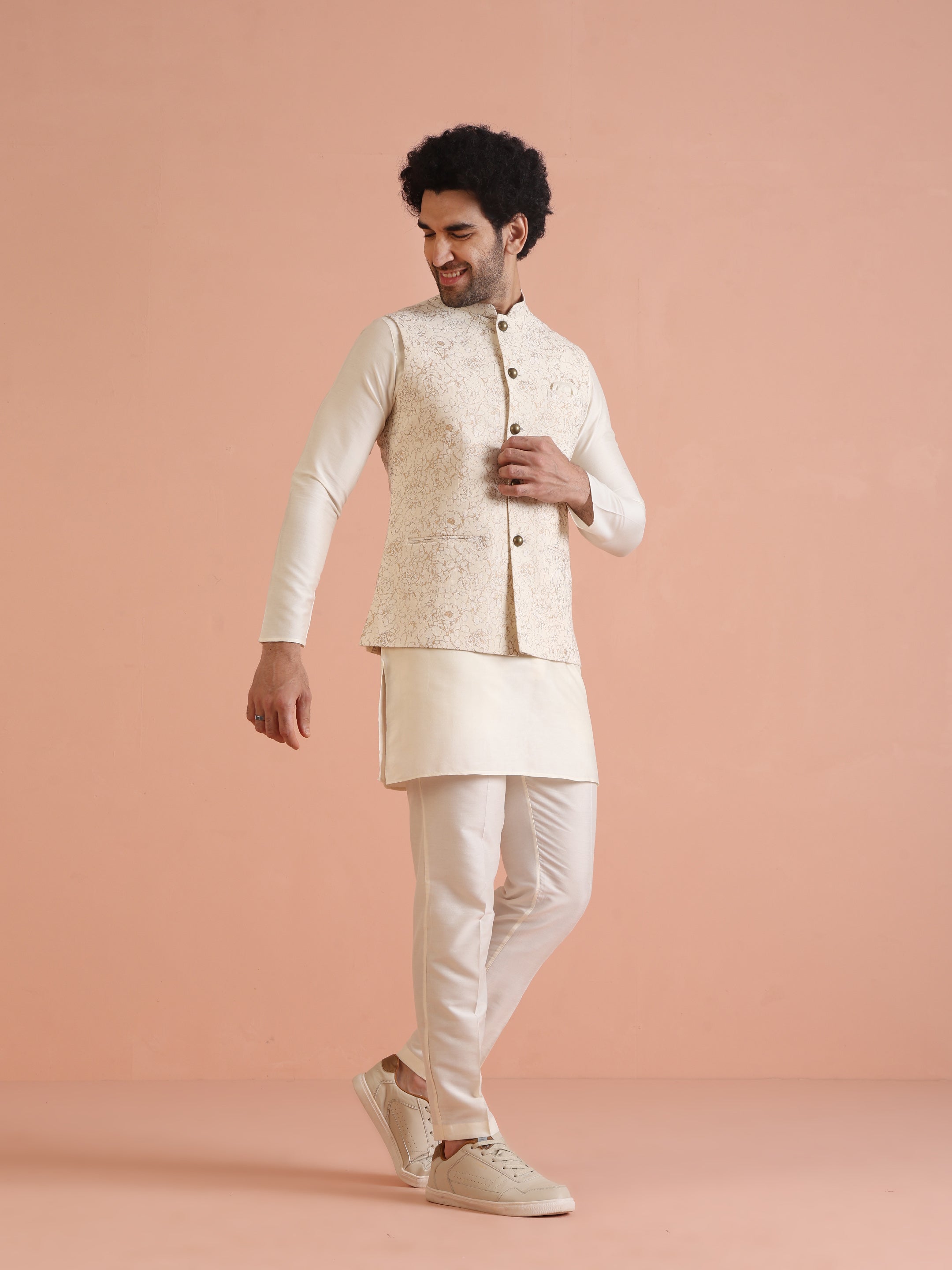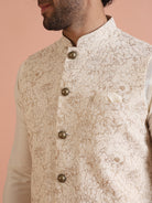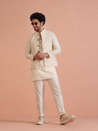 Off-white floral printed Nehru jacket set with kurta & trouser in silk blend. Perfect festive & wedding wear with modern ethnic style.