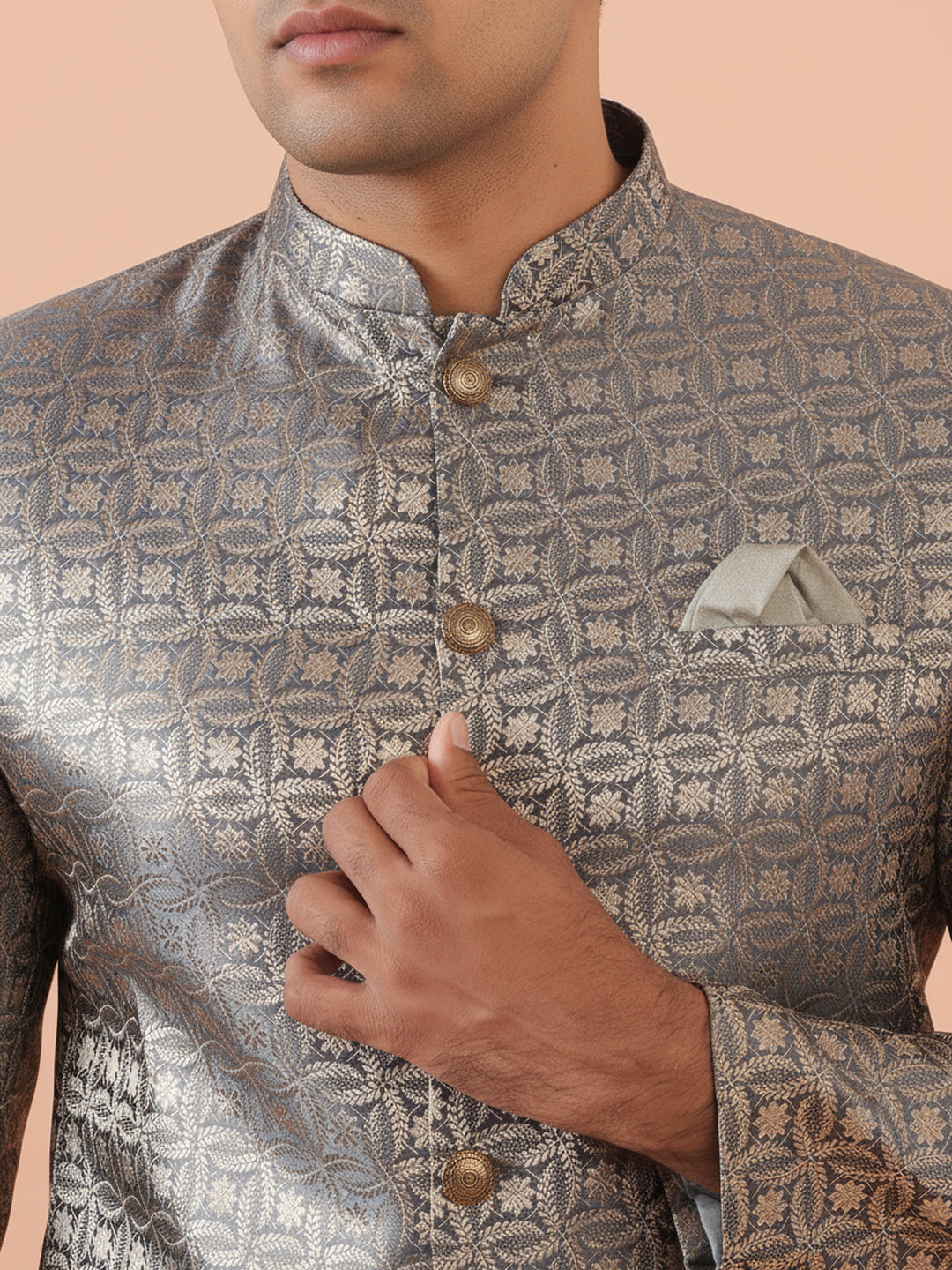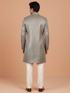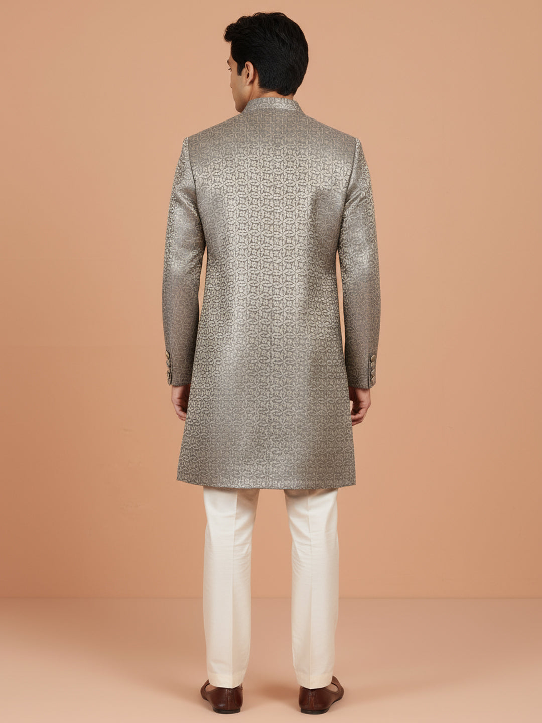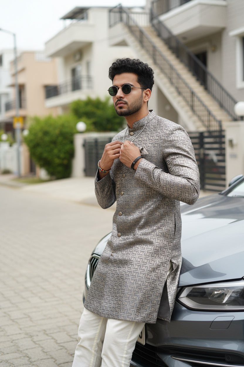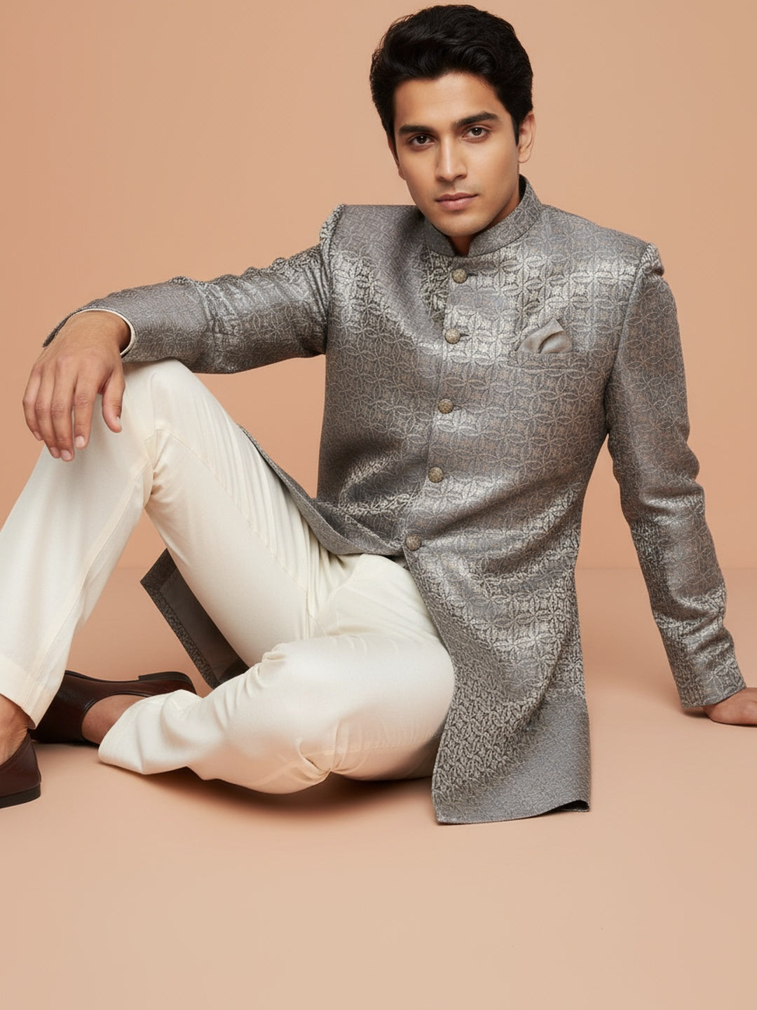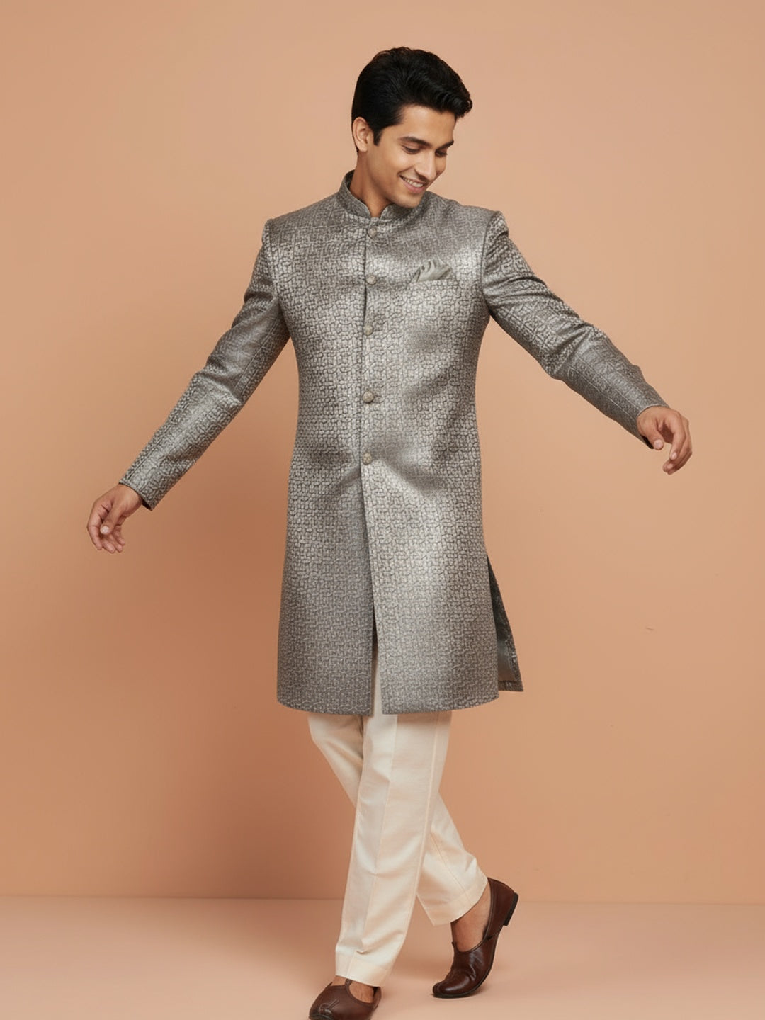 Silver jacquard sherwani paired with ivory wide-leg trousers — a regal festive set ideal for weddings and grand celebrations.