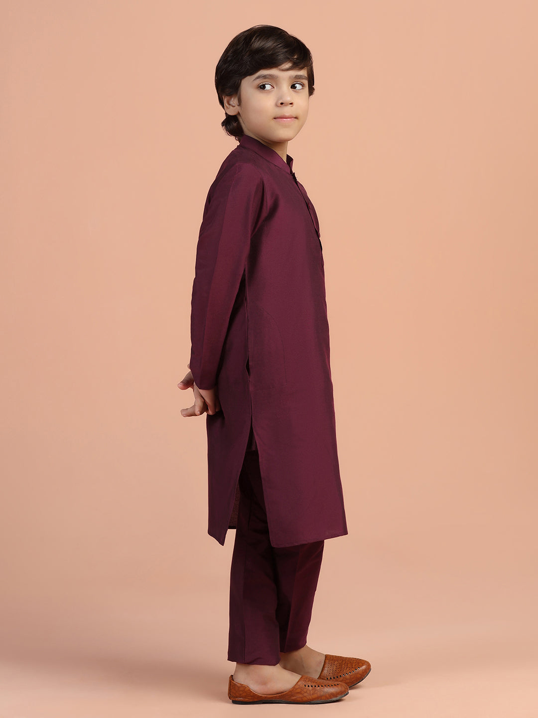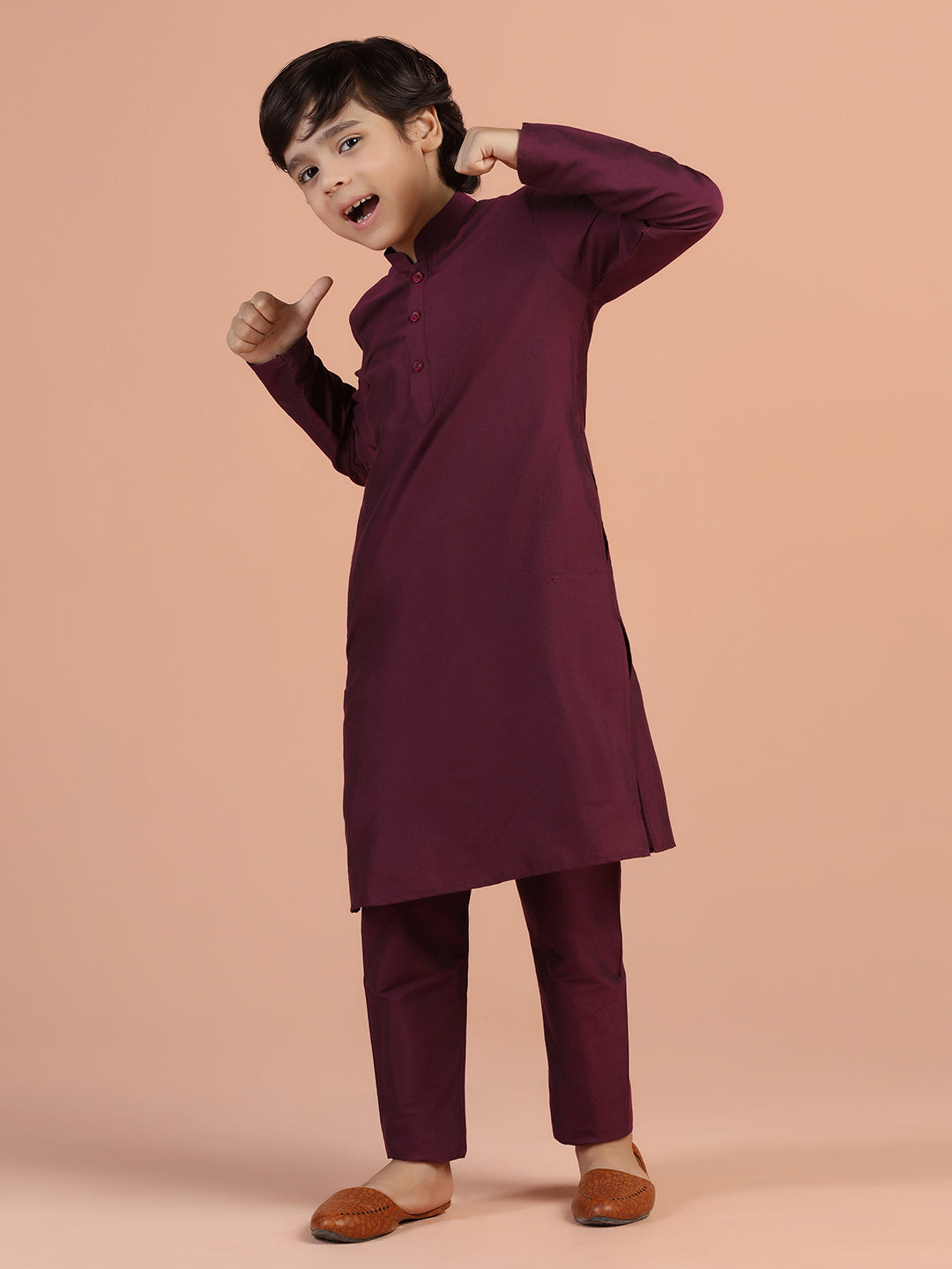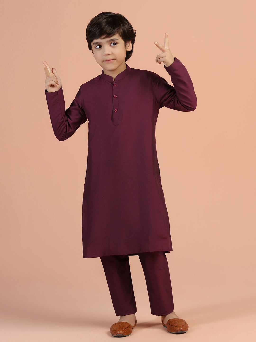 Classic wine solid cotton blend kurta for boys – elegant festive wear from Kisah Kids.
