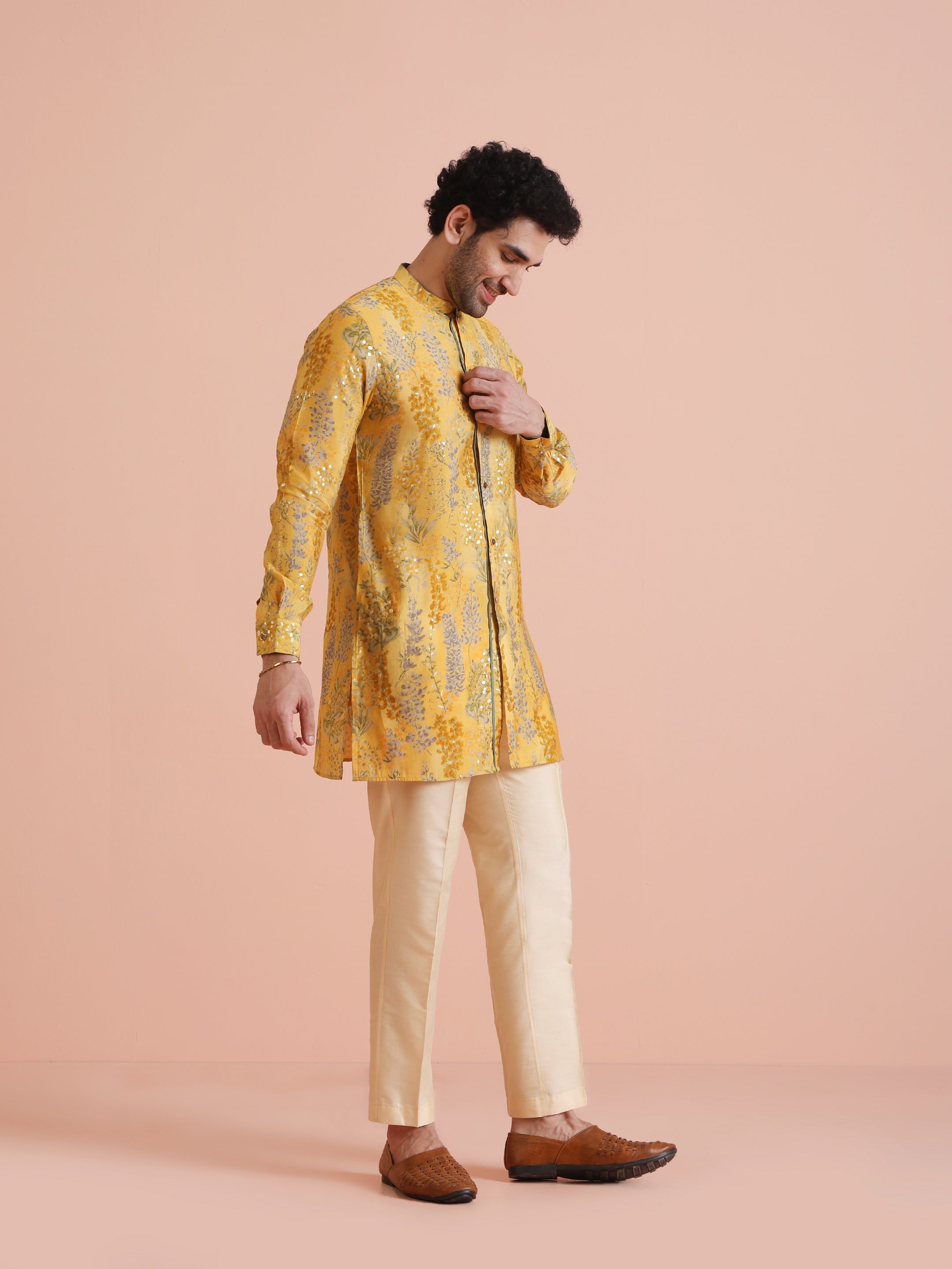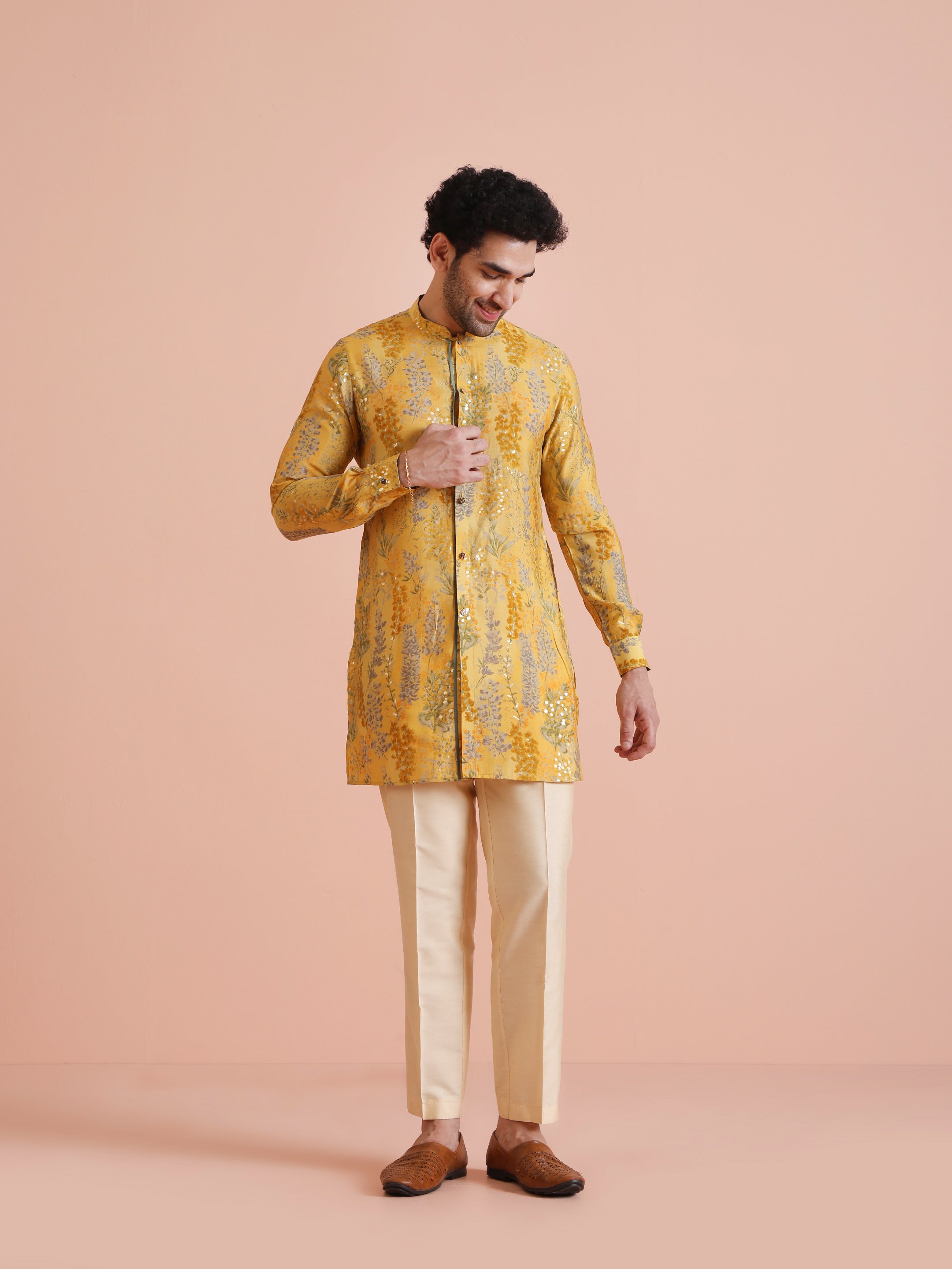 Yellow floral printed front open kurta trouser set with subtle mirror detailing—perfect for haldi, mehendi, and festive occasions.